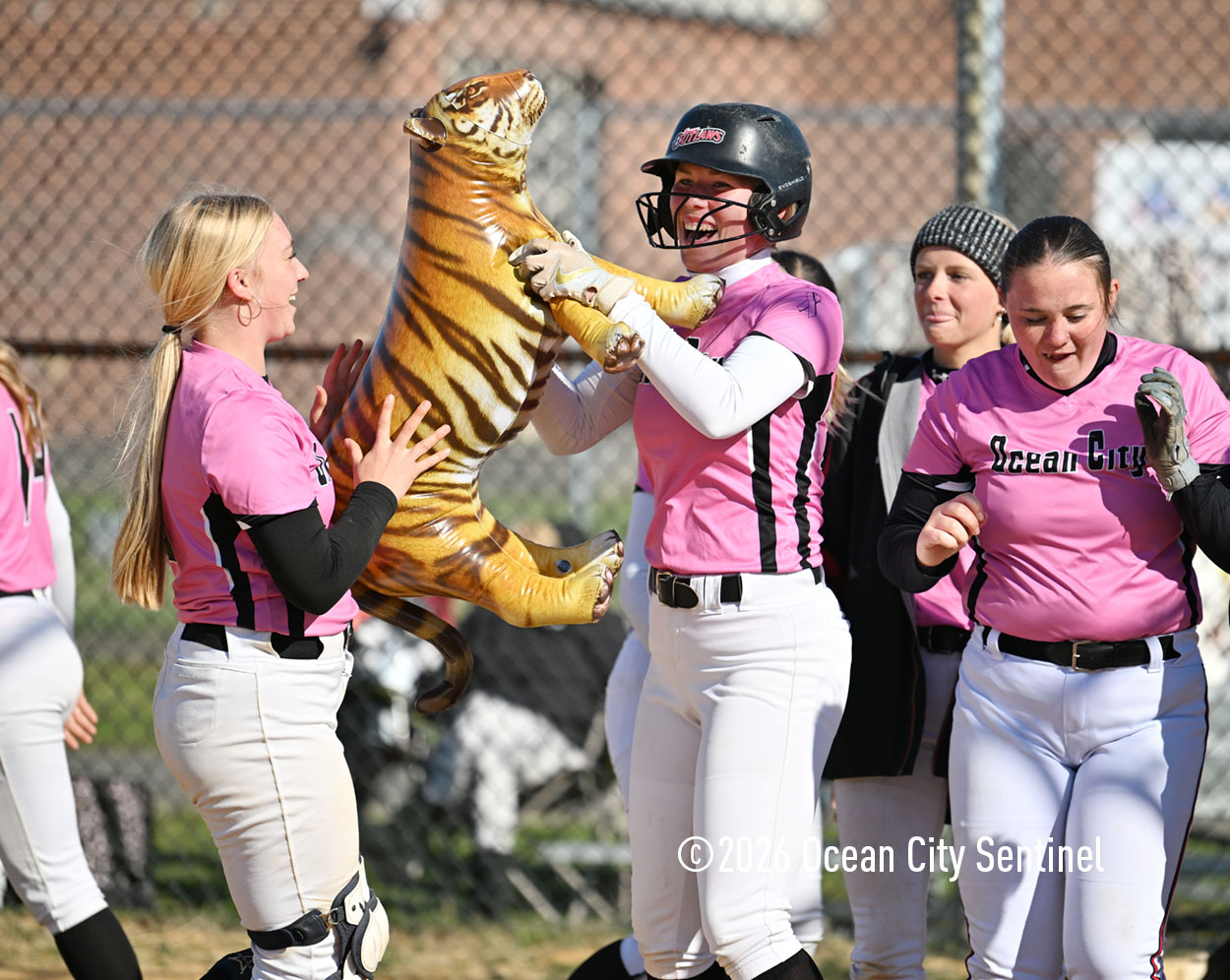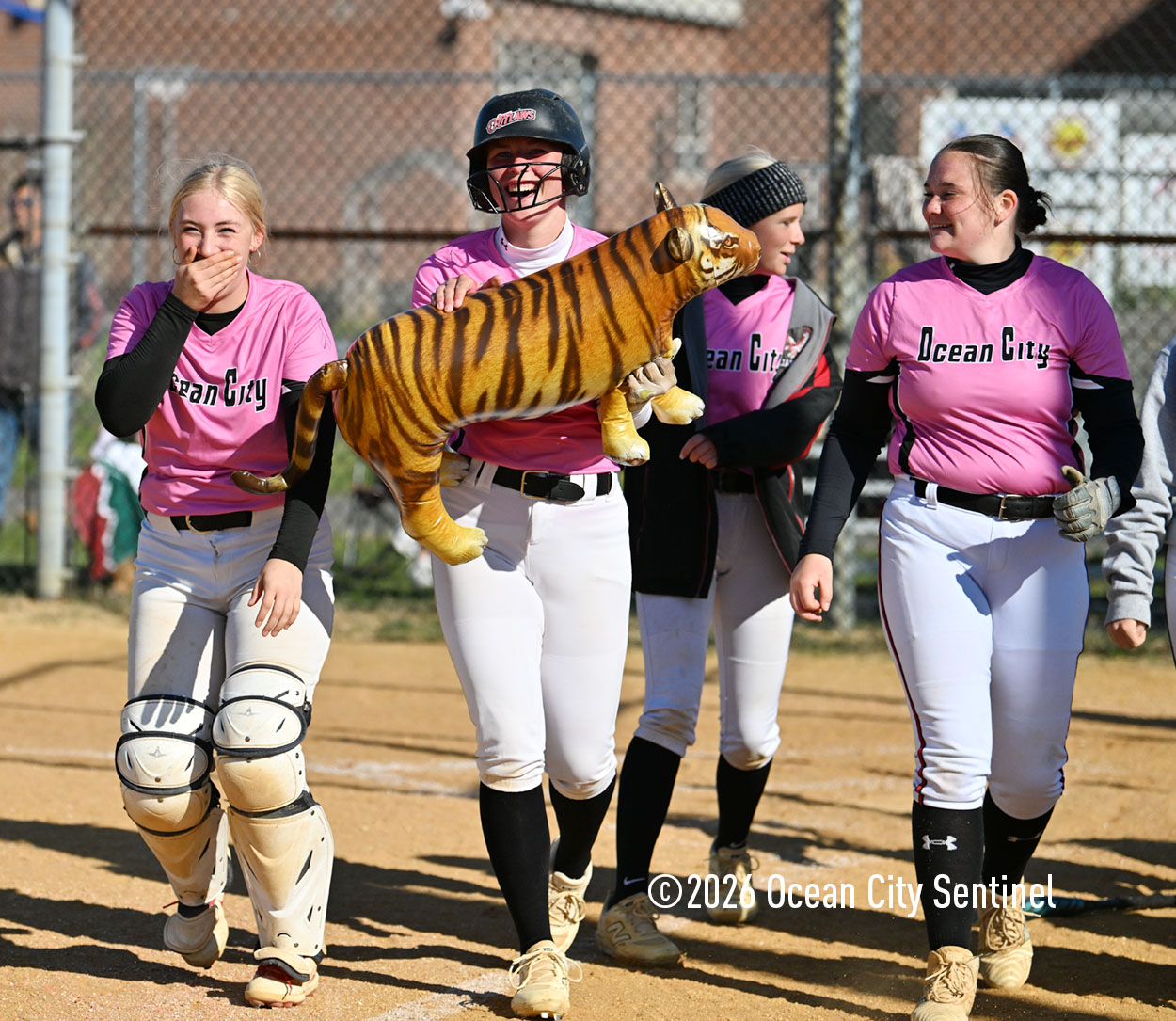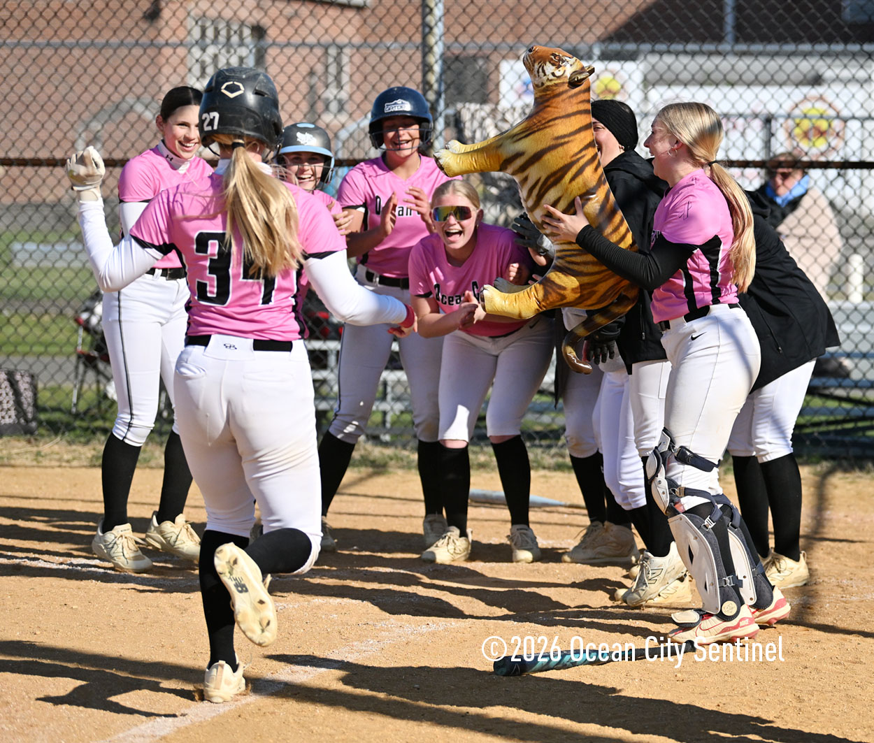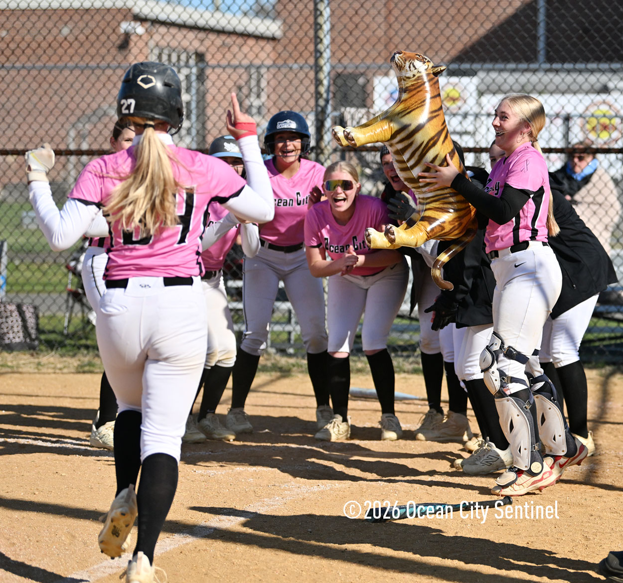 Jessica Mooney welcomed by Ocean City teammates at home plate with an inflatable tiger after her first home run in the game against Cedar Creek. She had two more home runs, including a grand slam in the 21-15 comeback win. At top, the Red Raiders around the scoreboard.