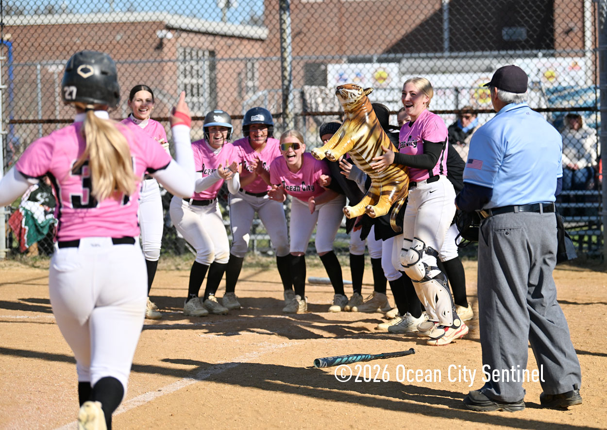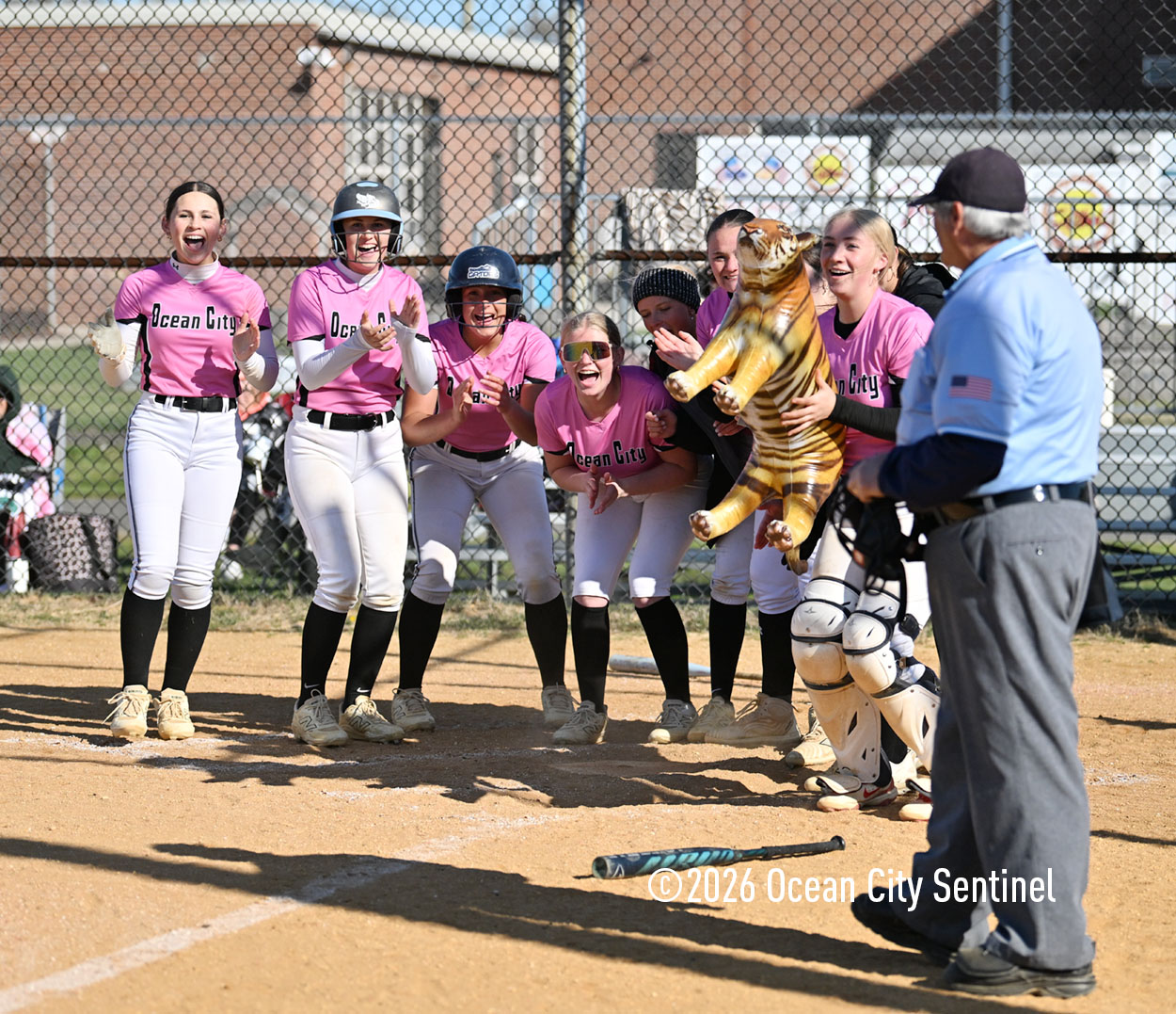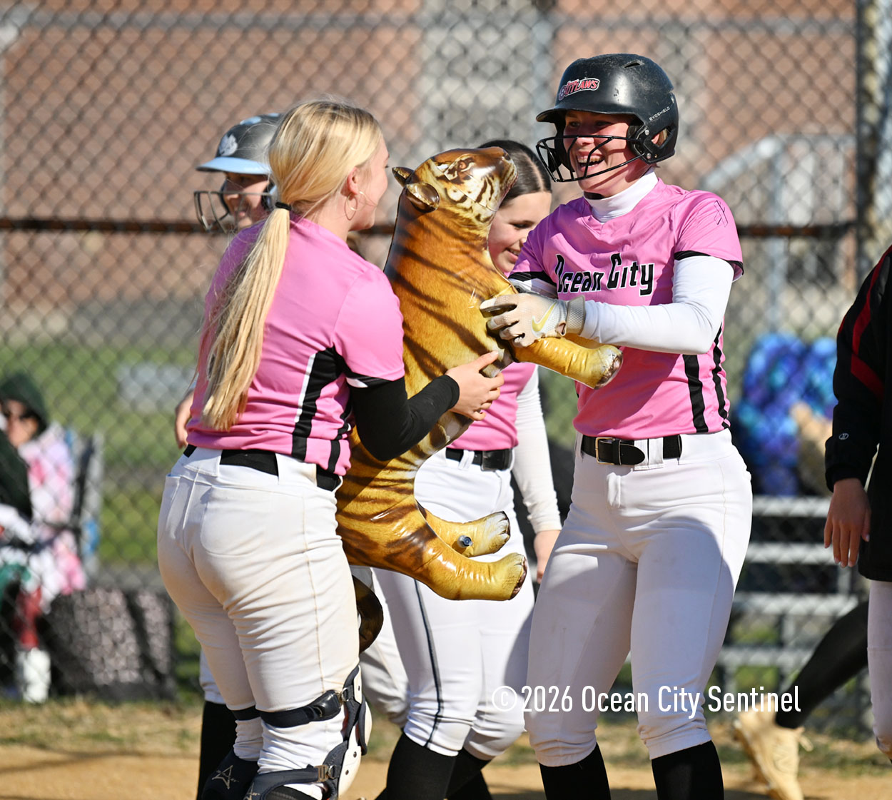 Jessica Mooney welcomed by Ocean City teammates at home plate with an inflatable tiger after her first home run in the game against Cedar Creek. She had two more home runs, including a grand slam in the 21-15 comeback win. At top, the Red Raiders around the scoreboard.