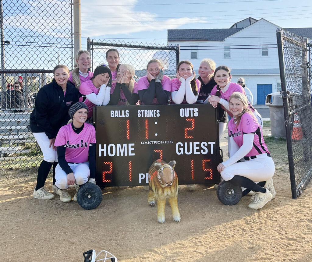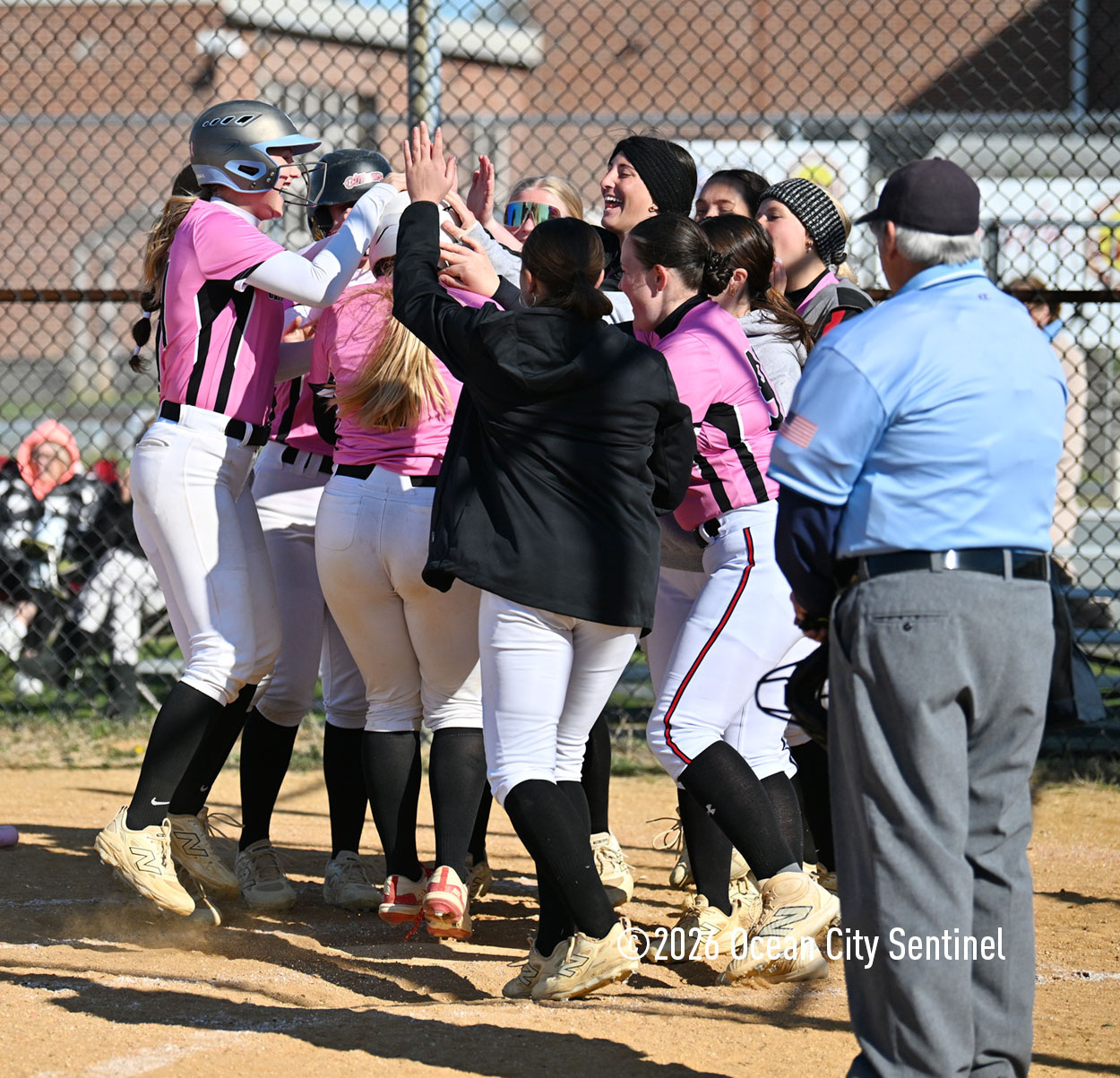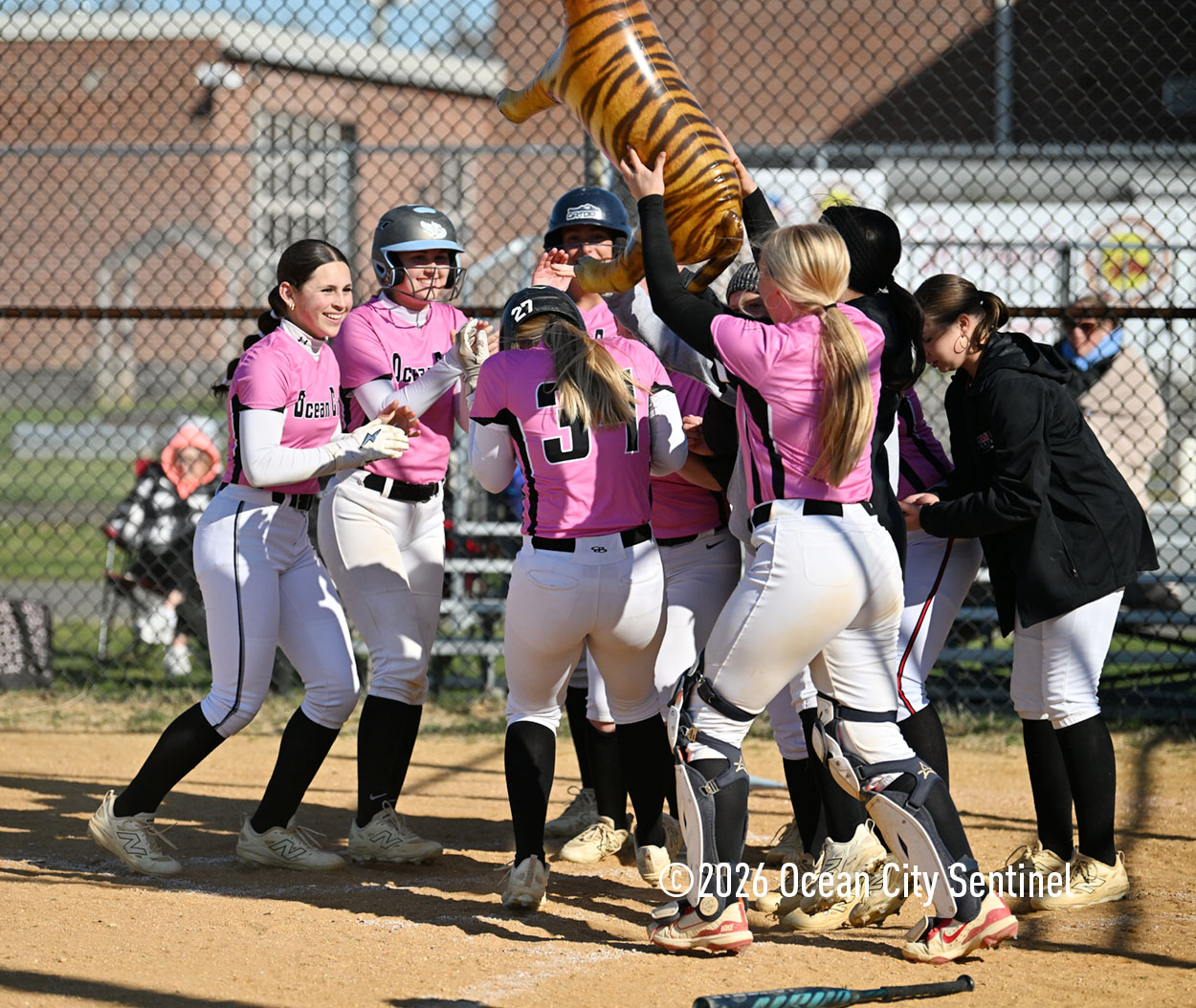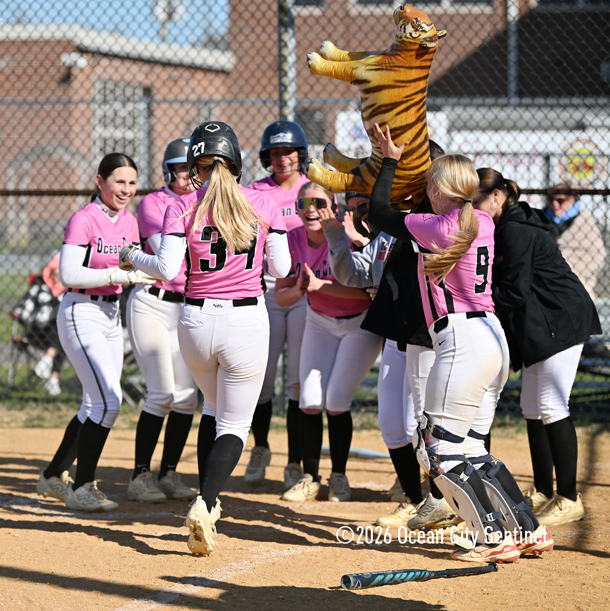 Jessica Mooney welcomed by Ocean City teammates at home plate with an inflatable tiger after her first home run in the game against Cedar Creek. She had two more home runs, including a grand slam in the 21-15 comeback win. At top, the Red Raiders around the scoreboard.