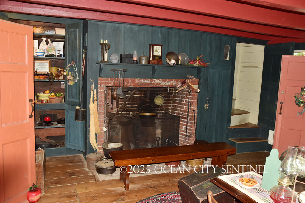 The large brick fireplace was used for cooking, while the wall is paneled and includes a cupboard. A winding staircase ascends to the second floor, where the bedrooms and a second fireplace are located.