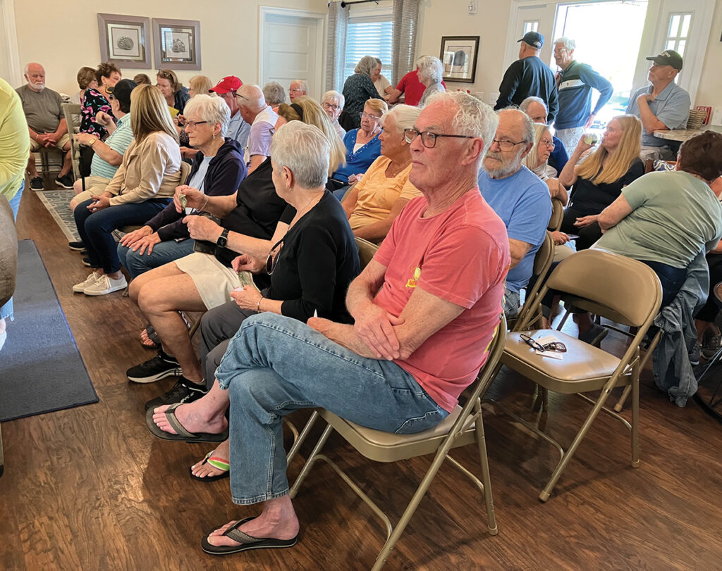 At top, Osprey Cove residents gather May 7 to listen to an attorney about the “unconscionable” rent hike the owner of the property is trying to impose.