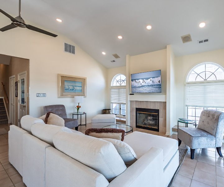 Taking up the north side of the space, the living room features a sofa and four chairs arranged around a gas fireplace with a flat-screen television above.