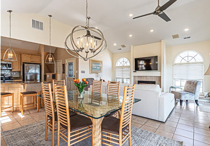 The kitchen, which is both functional and fashionable, is straight ahead, while the living room and dining area are to the left on the beach side of the home.