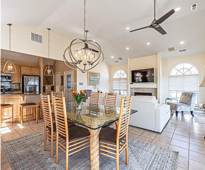 A long wood table with a glass top provides seating for six beneath a candelabra chandelier, while a sliding glass door that opens onto the porch provides abundant natural light.