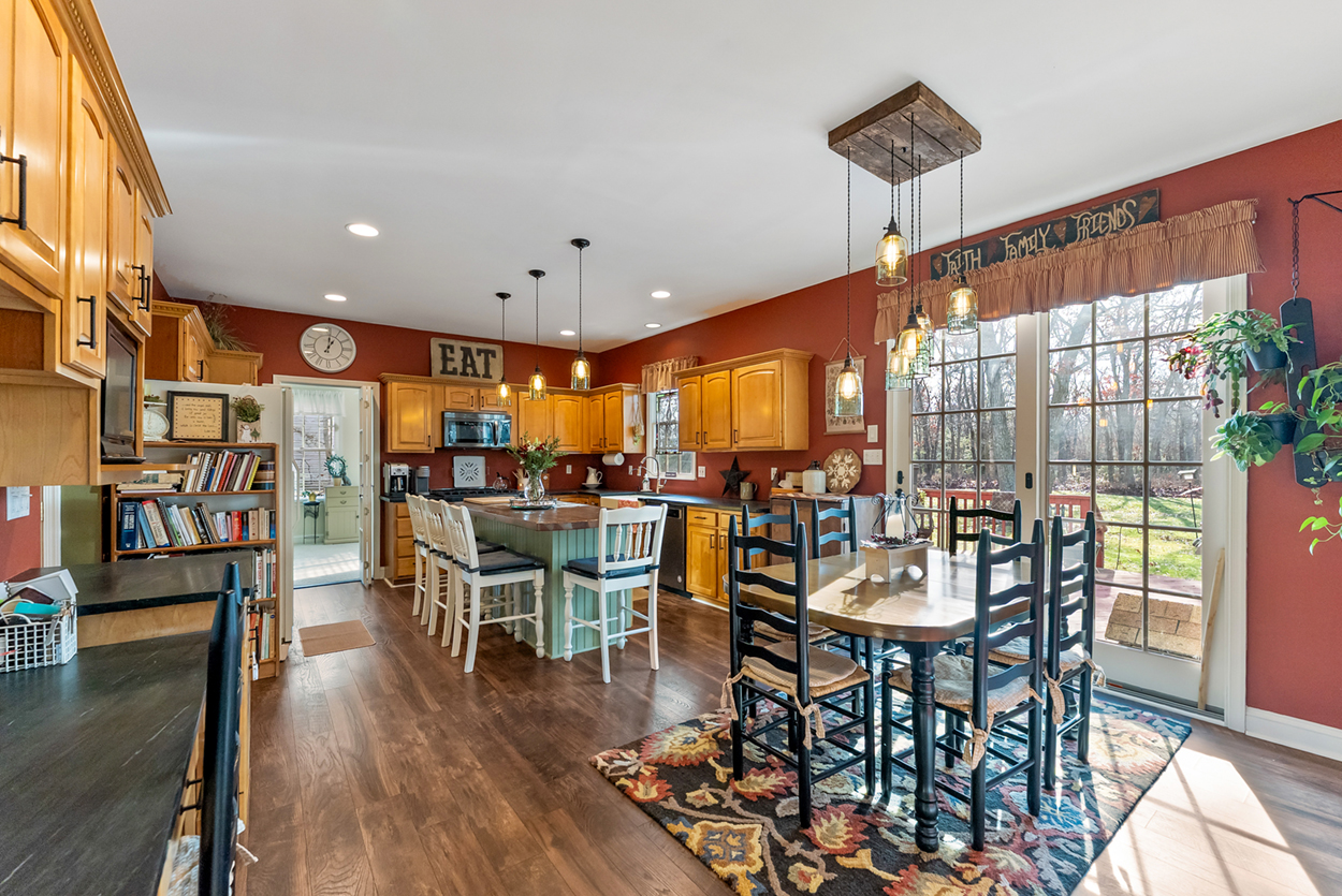 Just steps away, the kitchen is built to cook for a crowd. The focal point is the handsome island with its wood plank top. It seats four beneath a trio of pendant lights, while additional seating is offered at the table beneath another six pendant lights just inside a sliding glass door that opens onto the spacious back deck.