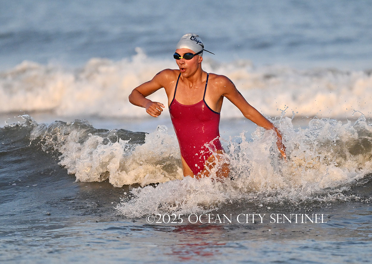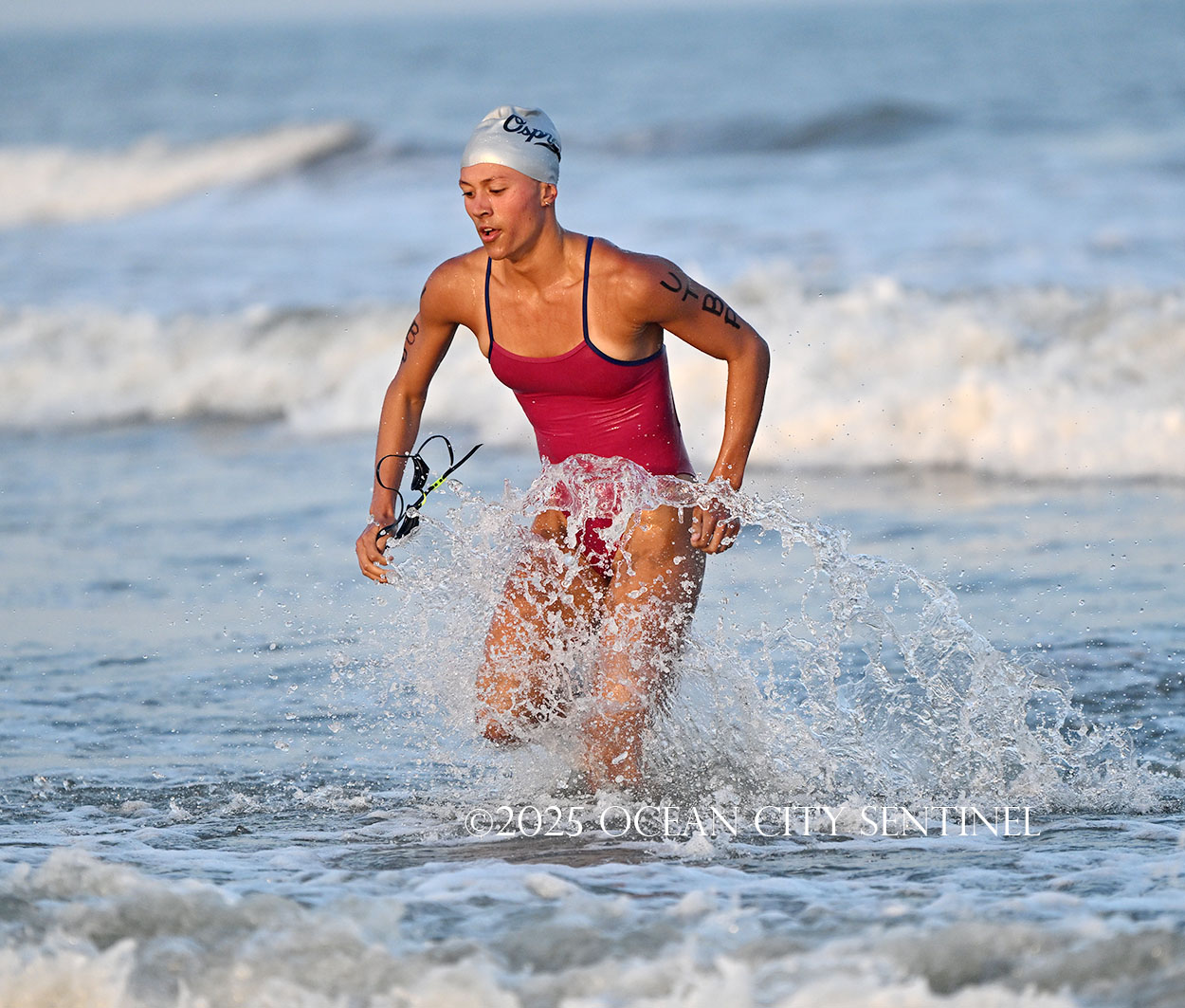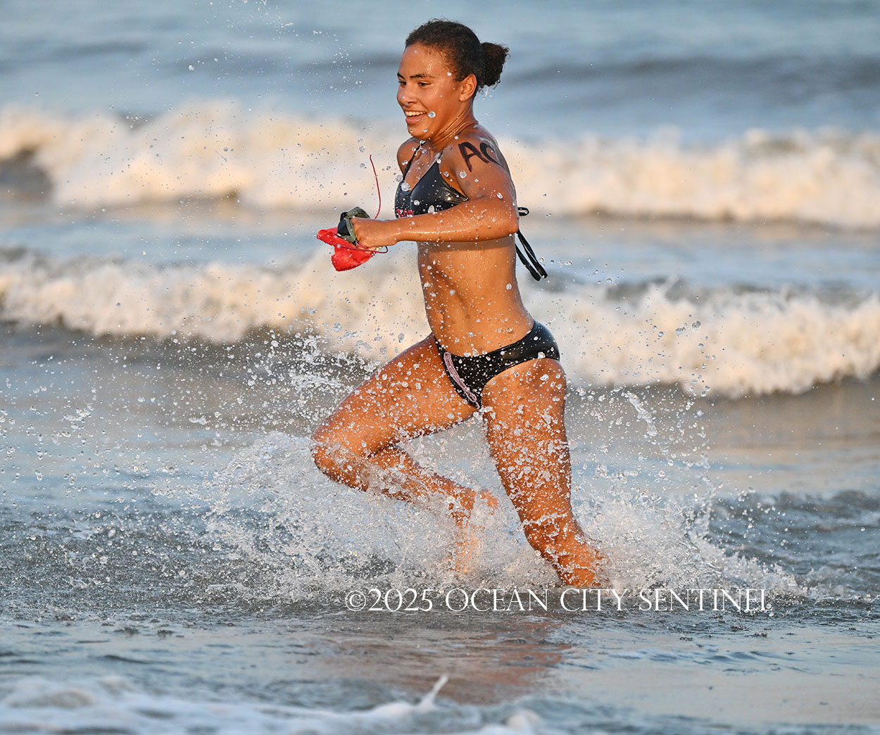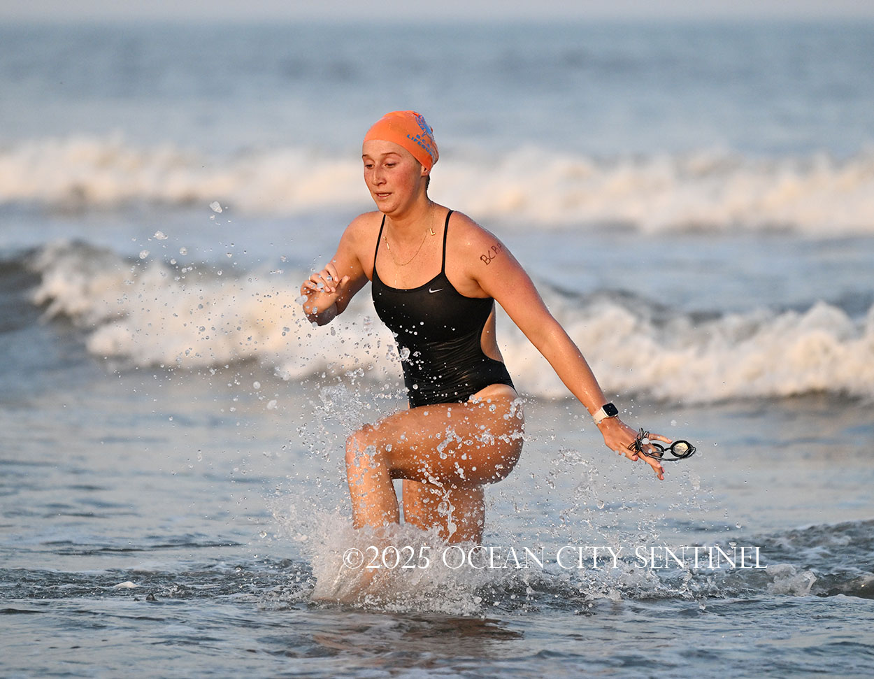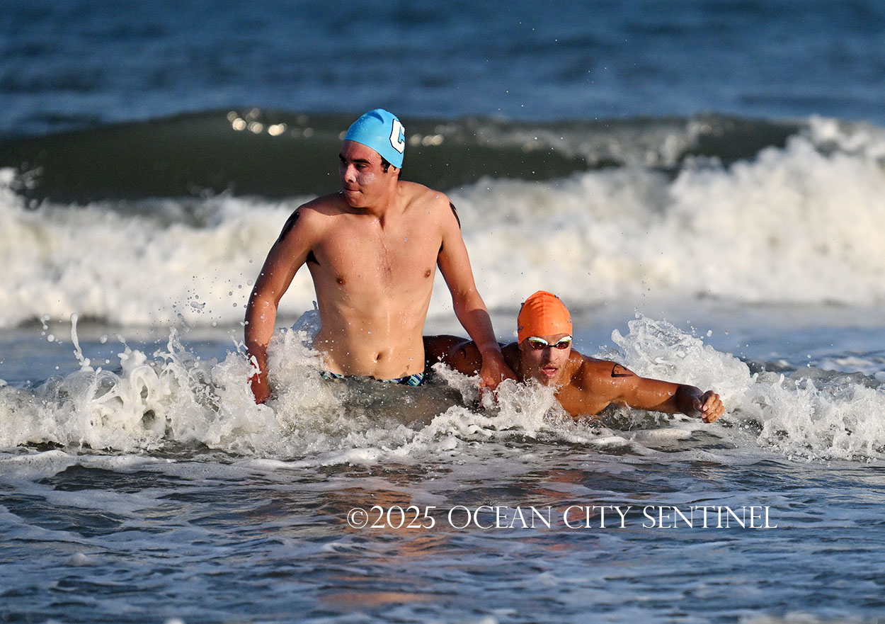 It looked like a battle for first between Margate’s Zach Vassar and Brigantine’s James Haney as they came to shore in a direct course, but Grisbaum took a different angle, got up in the surf and outran both to the finish. Vassar was second, Haney third, Upper Township’s Logan Manning fourth and Ocean City’s Jacob Texter fifth.