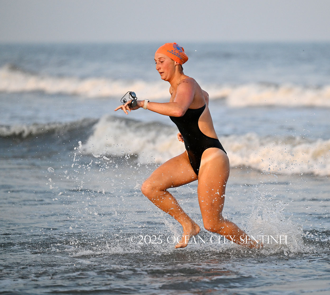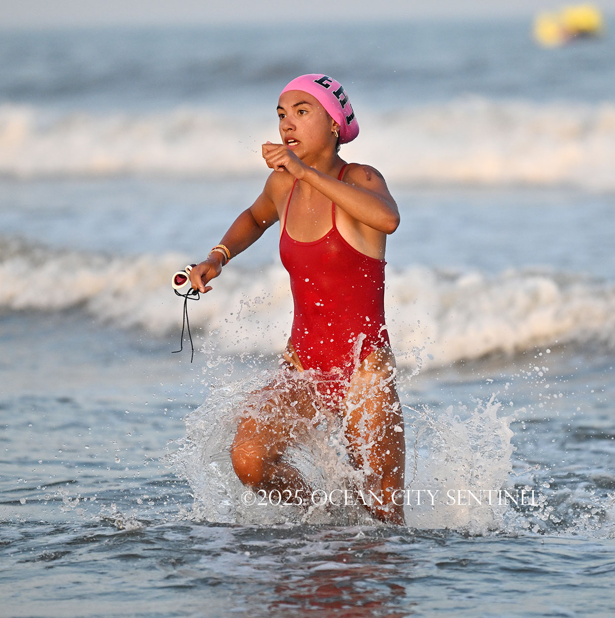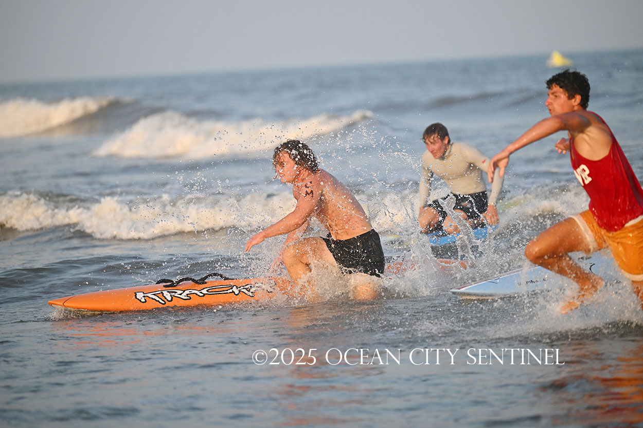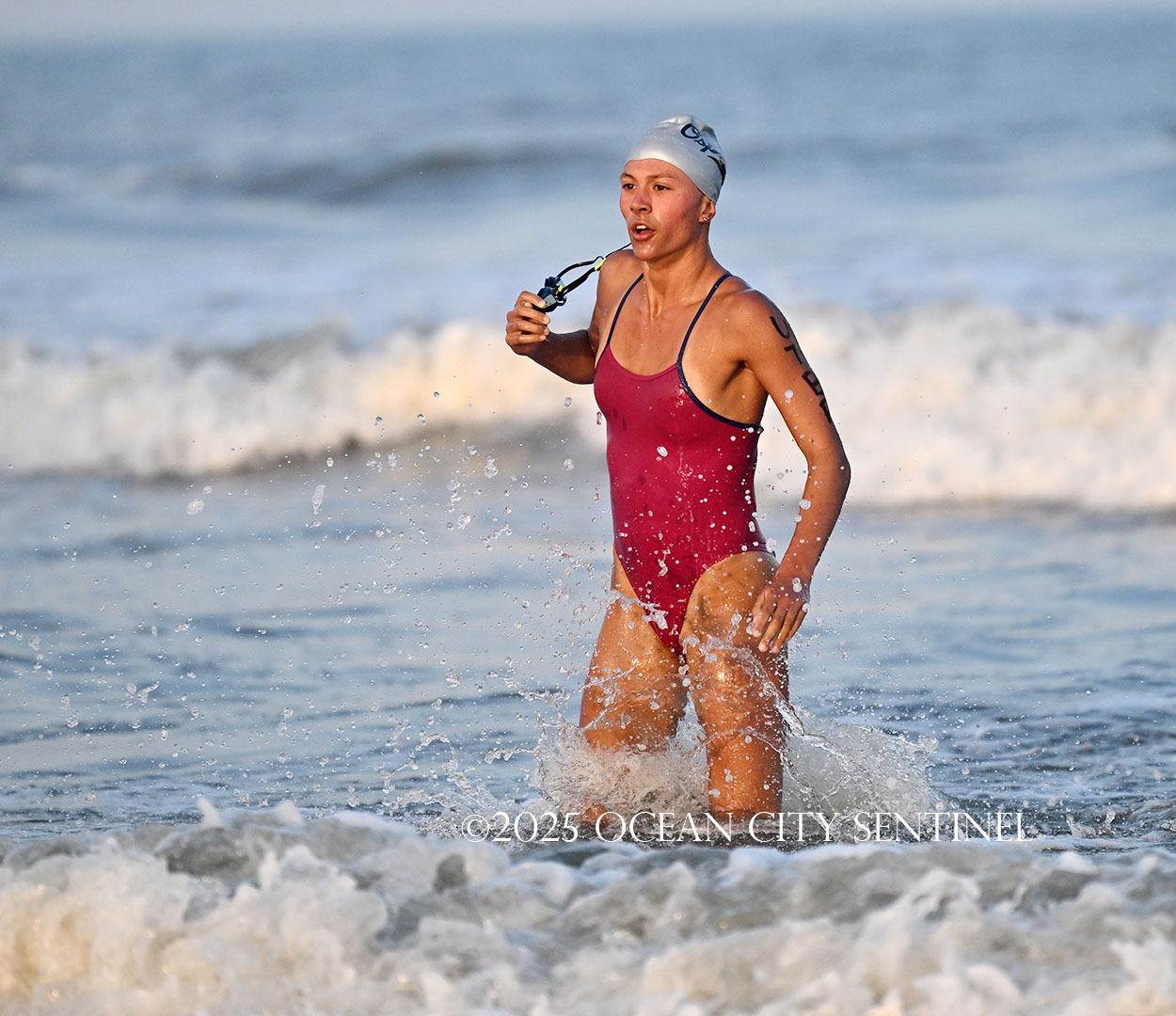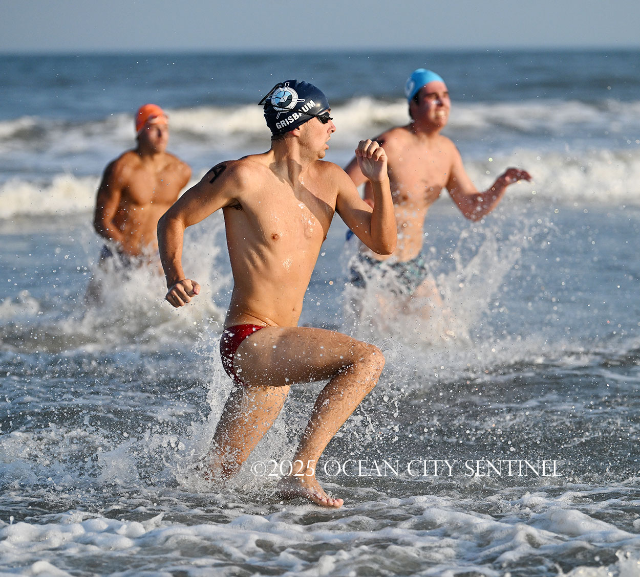 It looked like a battle for first between Margate’s Zach Vassar and Brigantine’s James Haney as they came to shore in a direct course, but Grisbaum took a different angle, got up in the surf and outran both to the finish. Vassar was second, Haney third, Upper Township’s Logan Manning fourth and Ocean City’s Jacob Texter fifth.