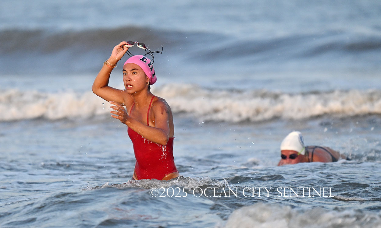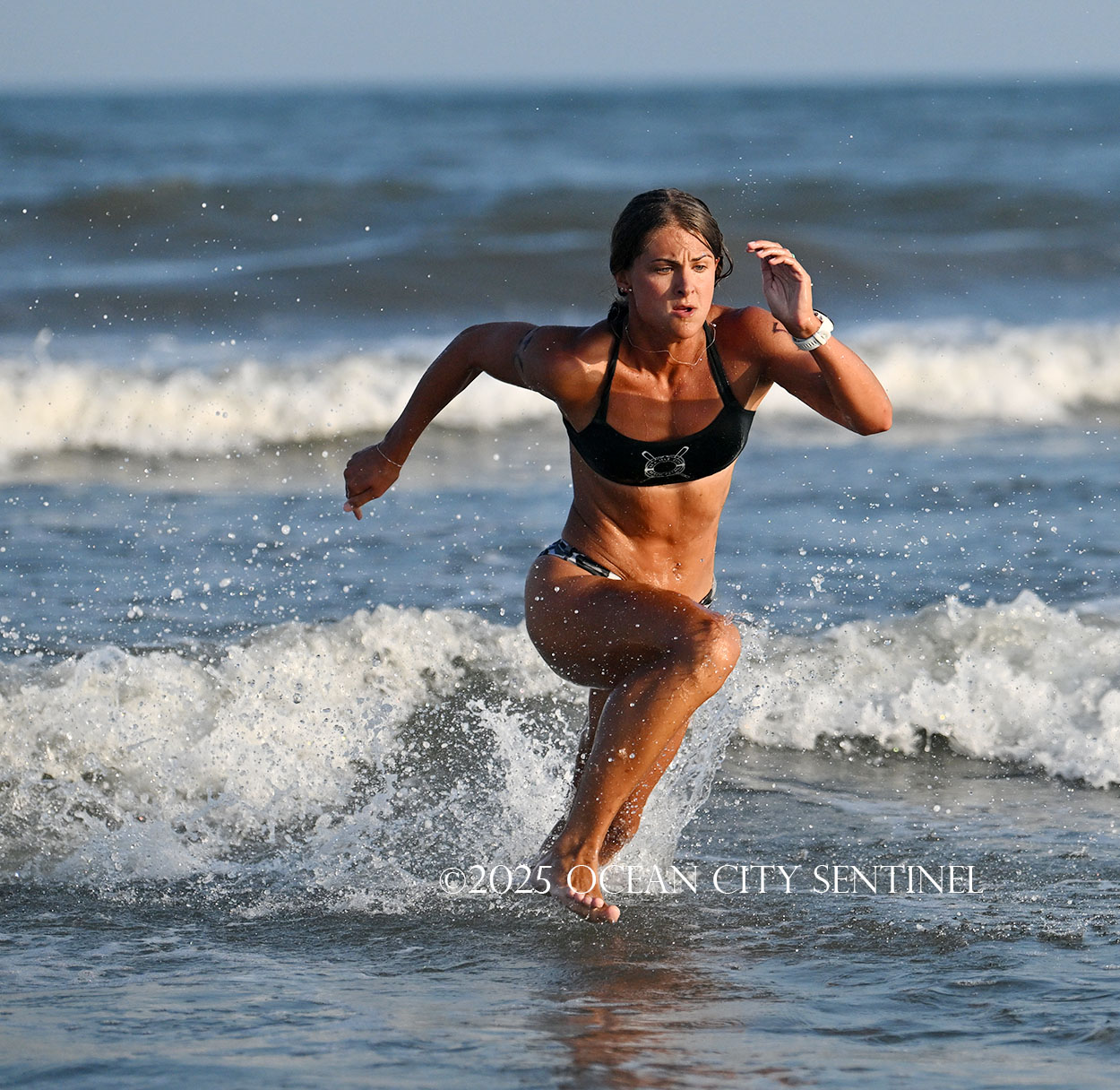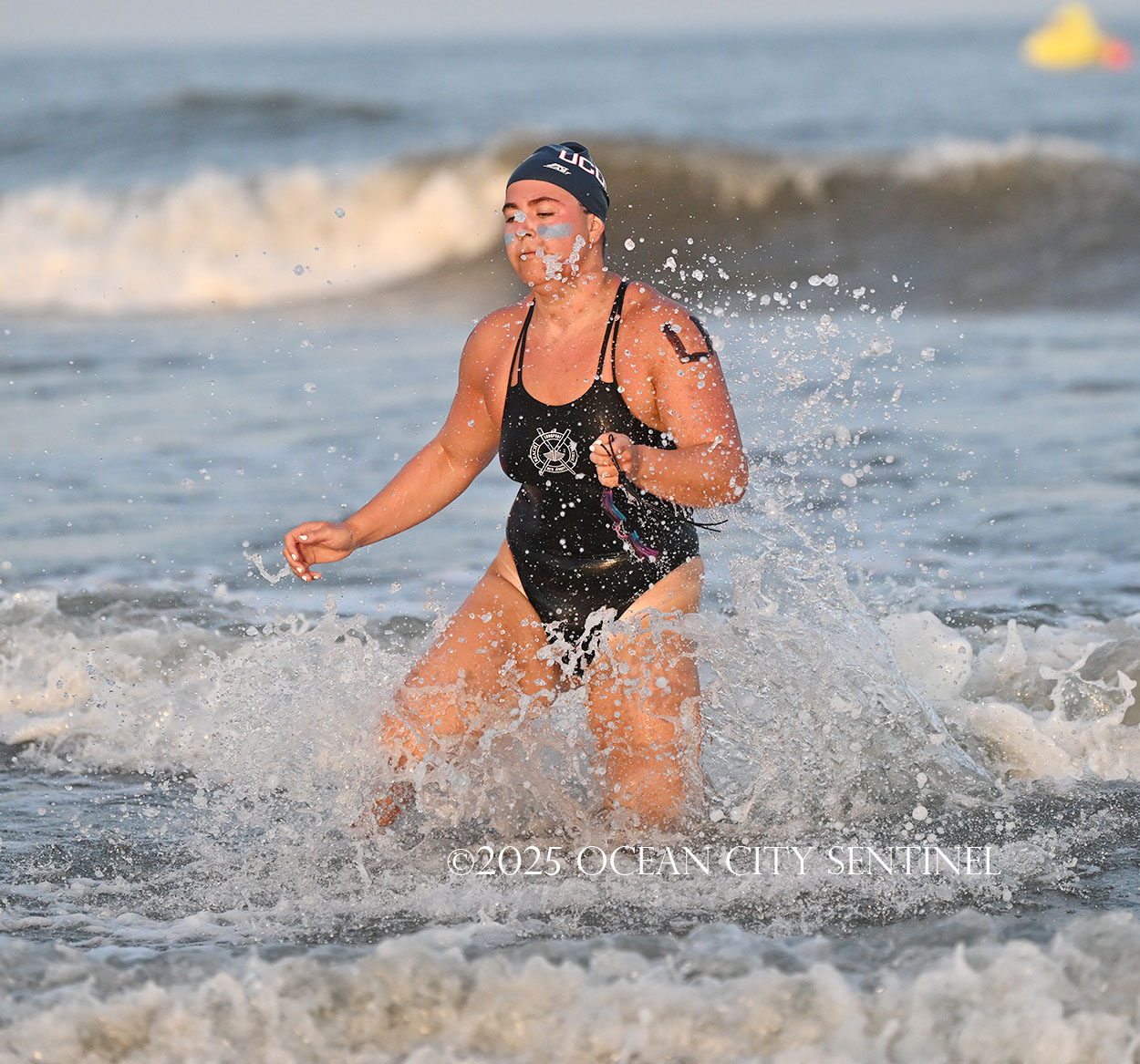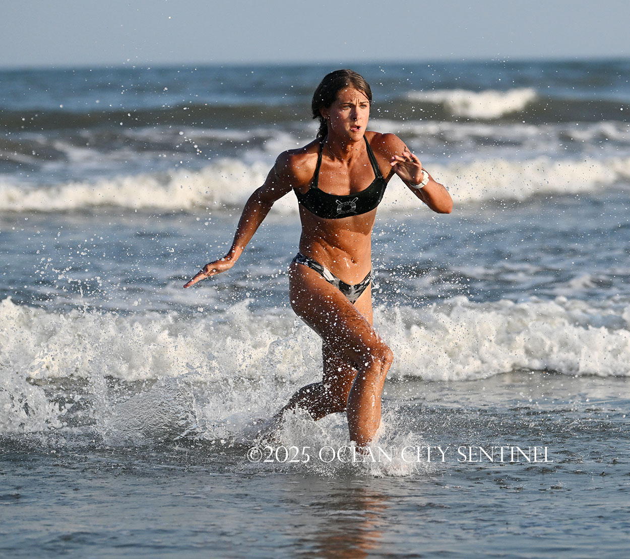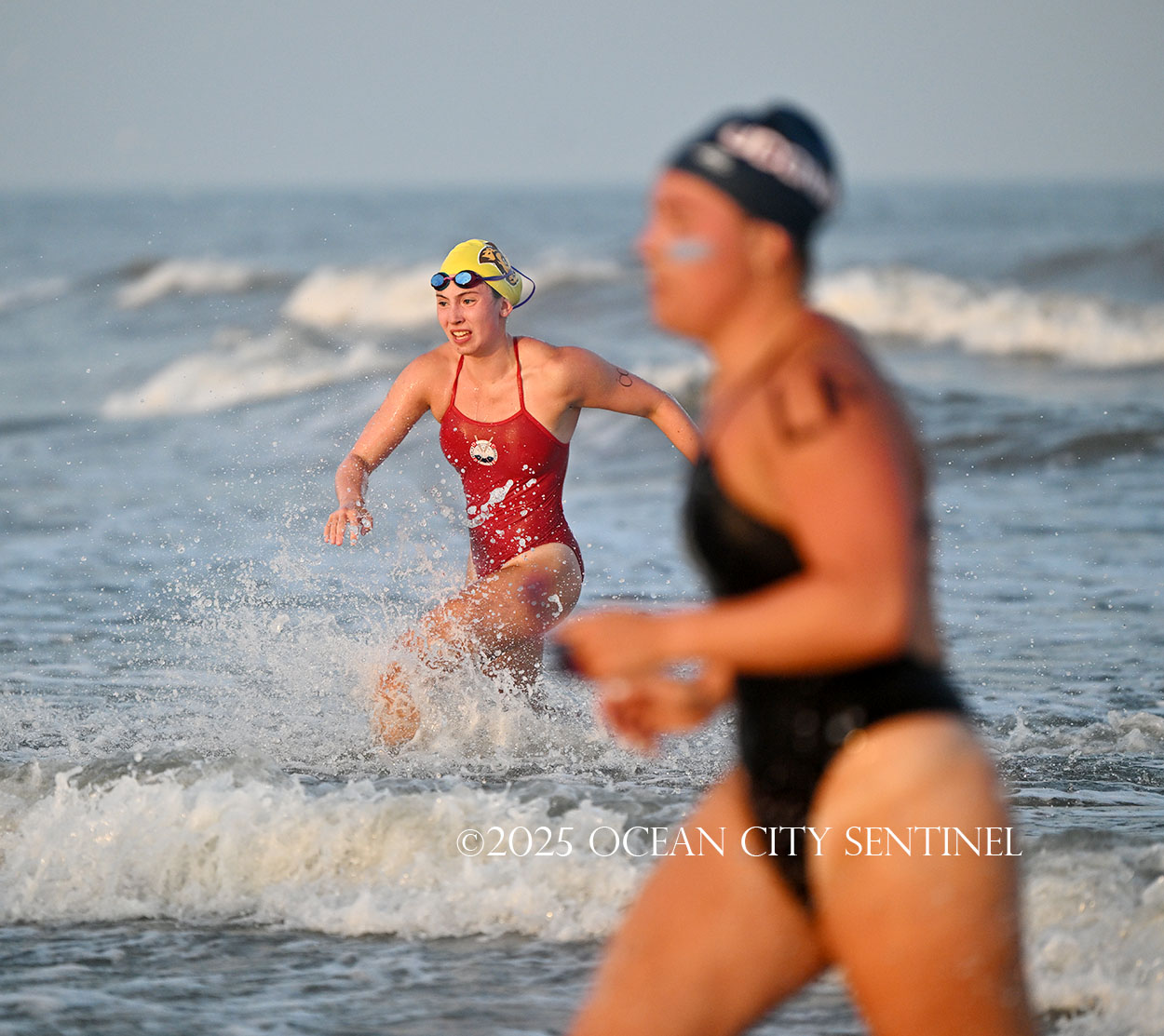 It looked like a battle for first between Margate’s Zach Vassar and Brigantine’s James Haney as they came to shore in a direct course, but Grisbaum took a different angle, got up in the surf and outran both to the finish. Vassar was second, Haney third, Upper Township’s Logan Manning fourth and Ocean City’s Jacob Texter fifth.