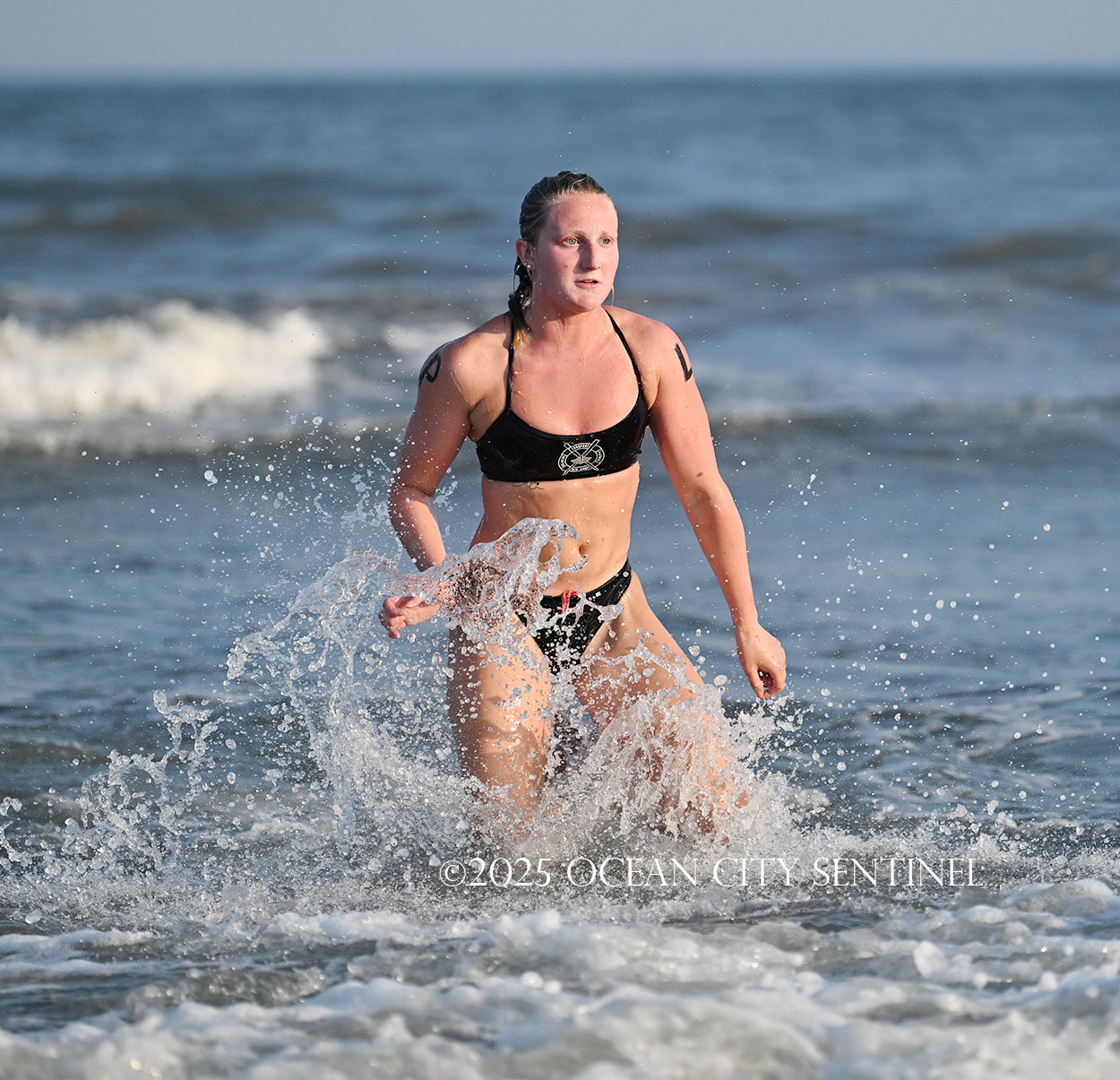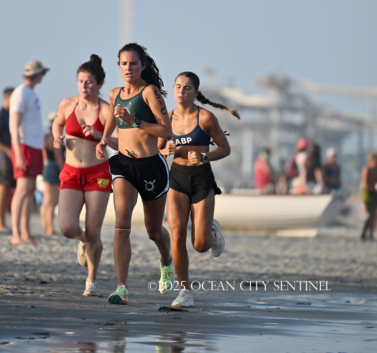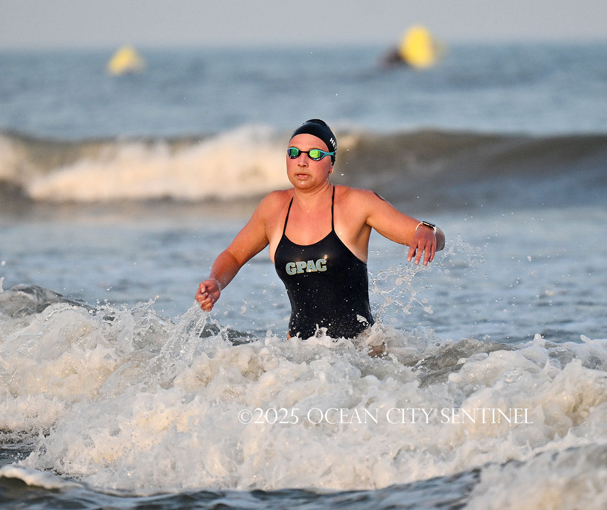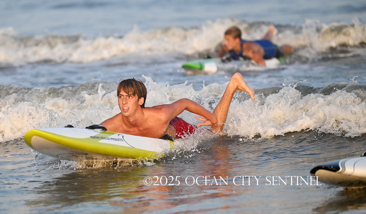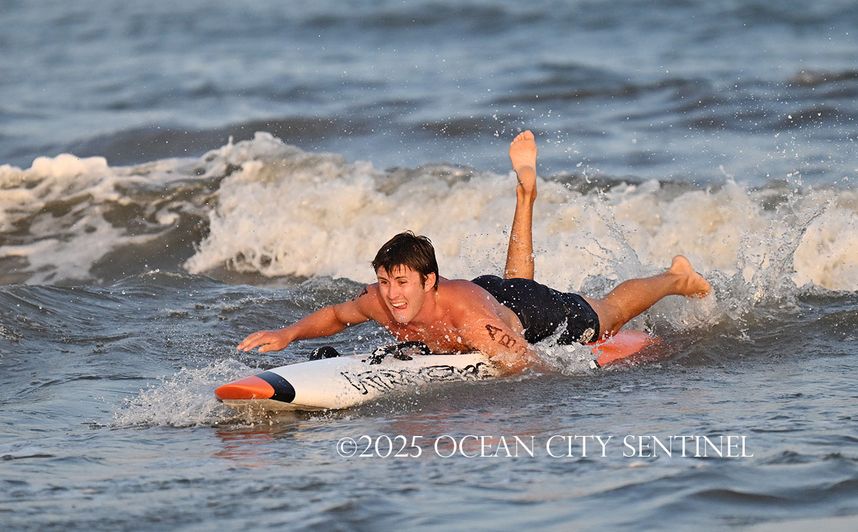 It looked like a battle for first between Margate’s Zach Vassar and Brigantine’s James Haney as they came to shore in a direct course, but Grisbaum took a different angle, got up in the surf and outran both to the finish. Vassar was second, Haney third, Upper Township’s Logan Manning fourth and Ocean City’s Jacob Texter fifth.