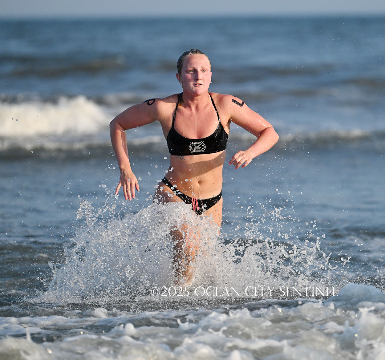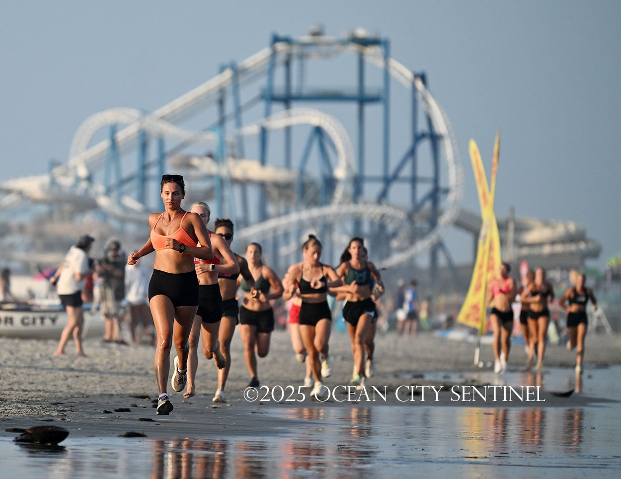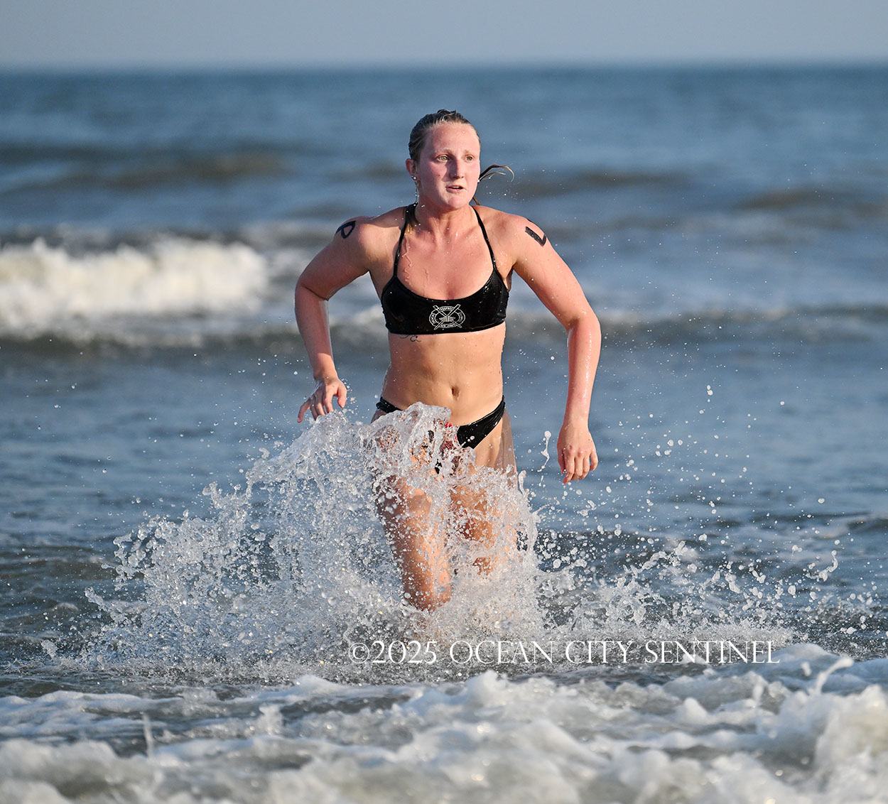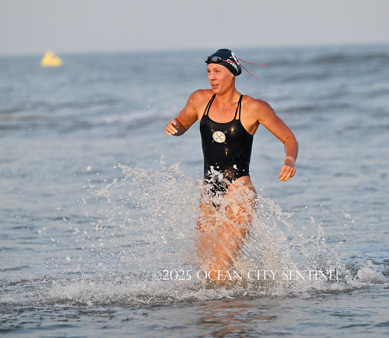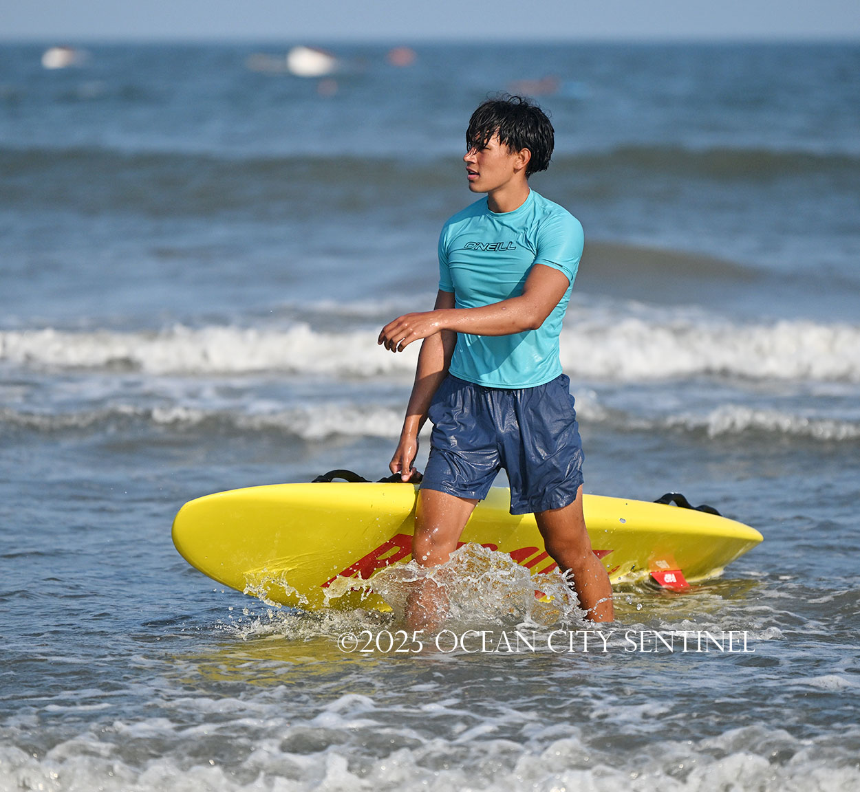 It looked like a battle for first between Margate’s Zach Vassar and Brigantine’s James Haney as they came to shore in a direct course, but Grisbaum took a different angle, got up in the surf and outran both to the finish. Vassar was second, Haney third, Upper Township’s Logan Manning fourth and Ocean City’s Jacob Texter fifth.