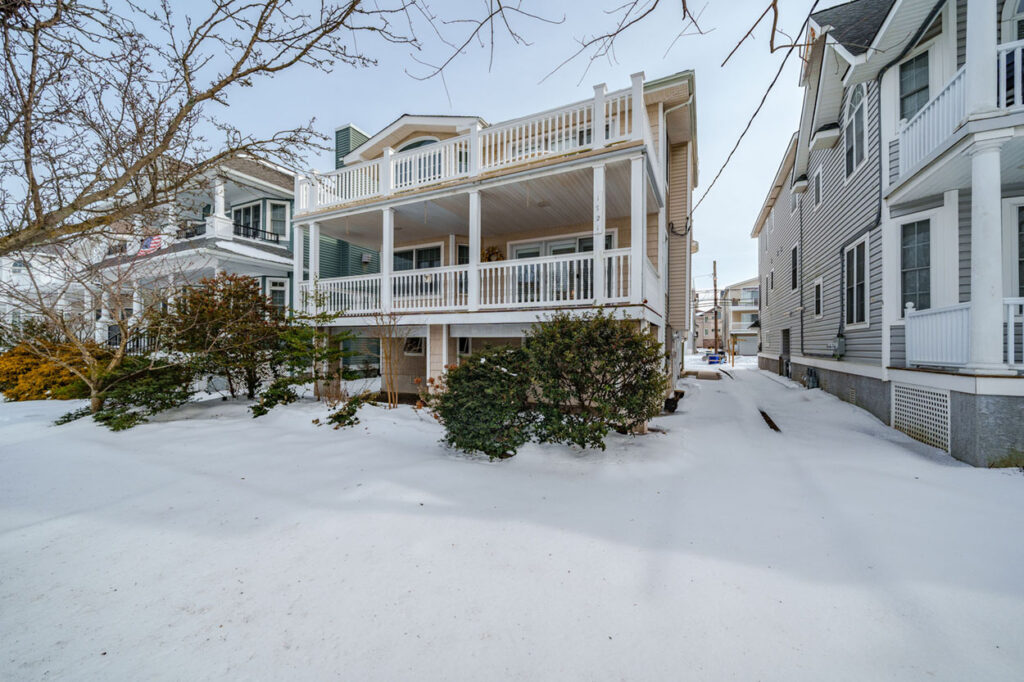 A wide, covered porch overlooks the street, providing a shady spot to unwind with a drink after a long day on the beach — before heading out to the boardwalk for a night of entertainment. Underneath is plenty of storage space for kayaks, surfboards and beach chairs.