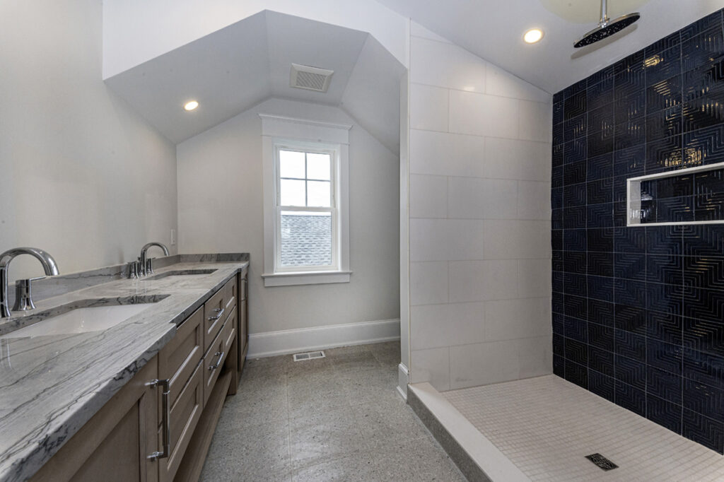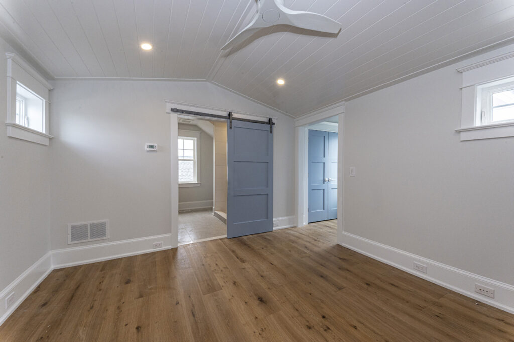 The primary bath is tucked away behind a barn door, that slides to the side the allow access. It features a long vanity with dual sinks and a tiled shower.