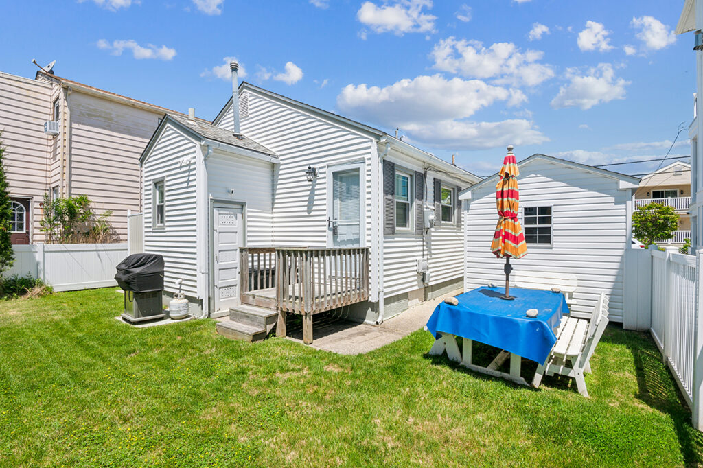 Back in the kitchen, a door in the corner opens onto a wood porch and grassy backyard, where a picnic table awaits hungry bellies after a long day on the beach. There’s plenty of room for a sprinkler or lawn games for the kids.