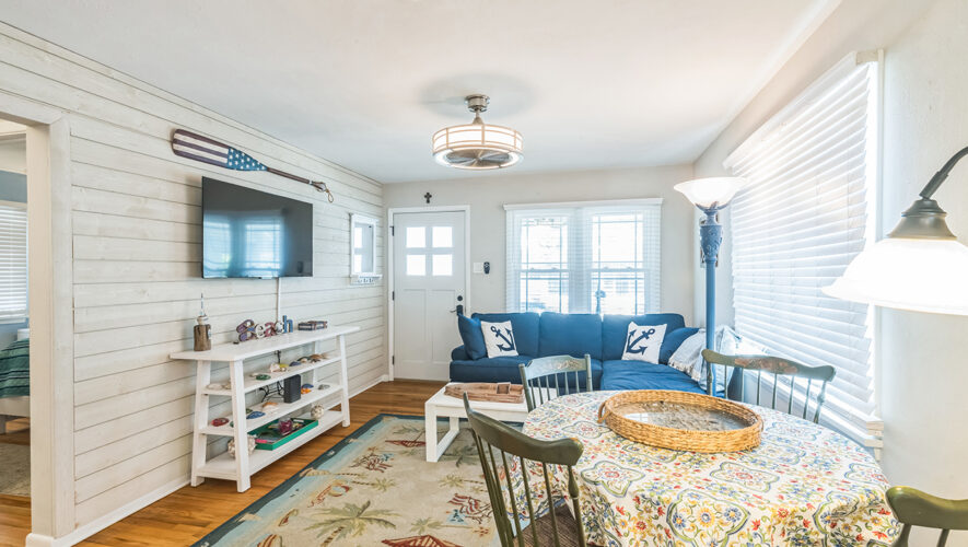 Sporting original narrow-plank hardwoods flooring, the living room has abundant light from a double window facing front and another on the beach side. A sectional sofa is arranged around a flat-screen television hanging on a rustic wood-plank accent wall. The enclosed ceiling fan reminiscent of a 1950s diner is among the special touches added when the home was remodeled.