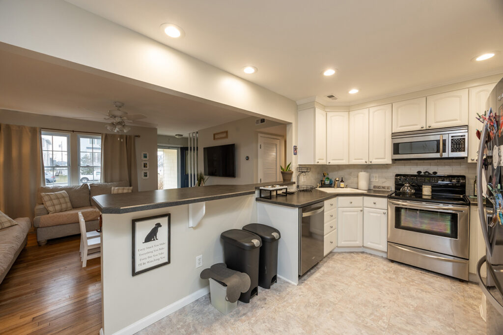 A large cutout is open to the kitchen and dining area. A long peninsula in the kitchen counter provides stool seating on both sides.