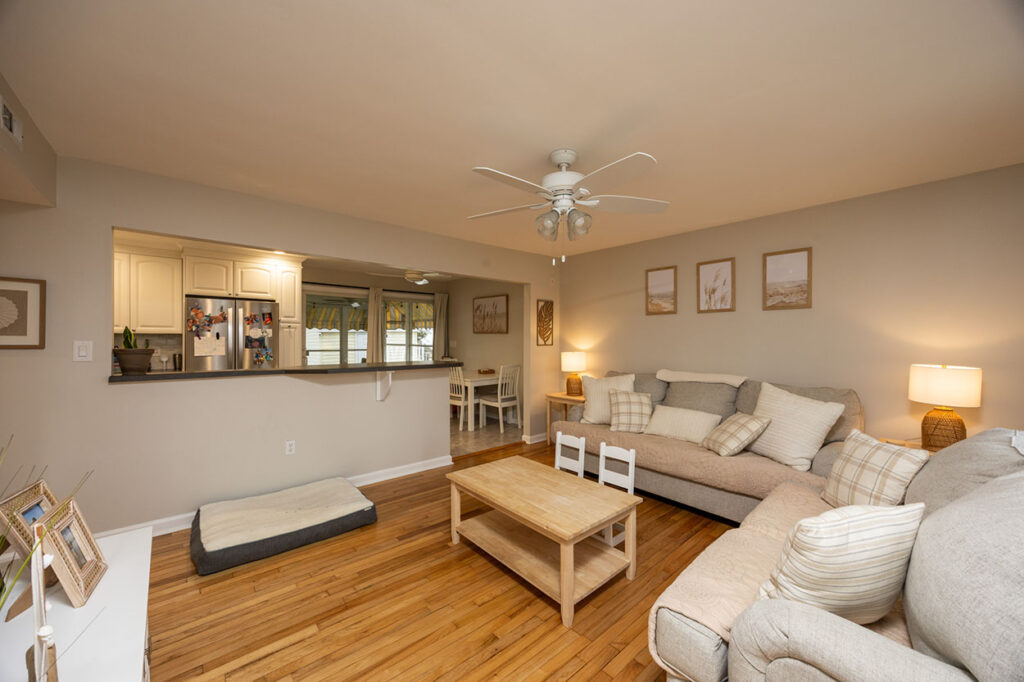 Following the hallway to the right leads to a carpeted living room with a sofa and love seat, kitchen and dining area just inside the sun porch.