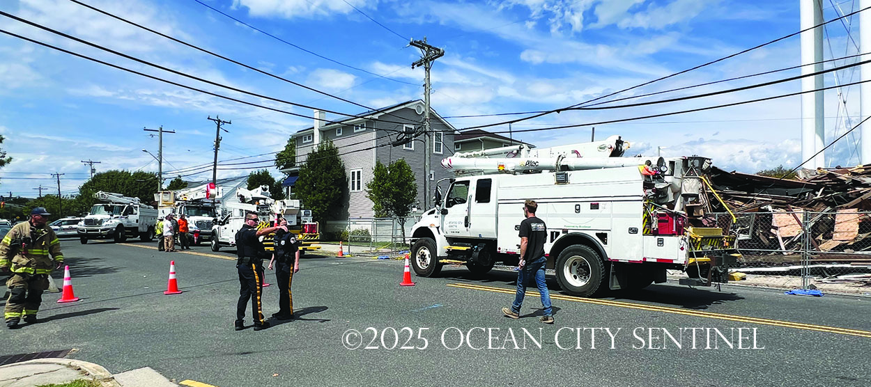 The three-story structure, with extensive iron reinforcements, came down after demolition crews brought in larger equipment, but when it finally collapsed it took out power lines to nearby transformers, cutting electricity flow to the neighborhood and nearby Acme. Police were on the scene, as were Atlantic City Electric crews, who rerouted power.