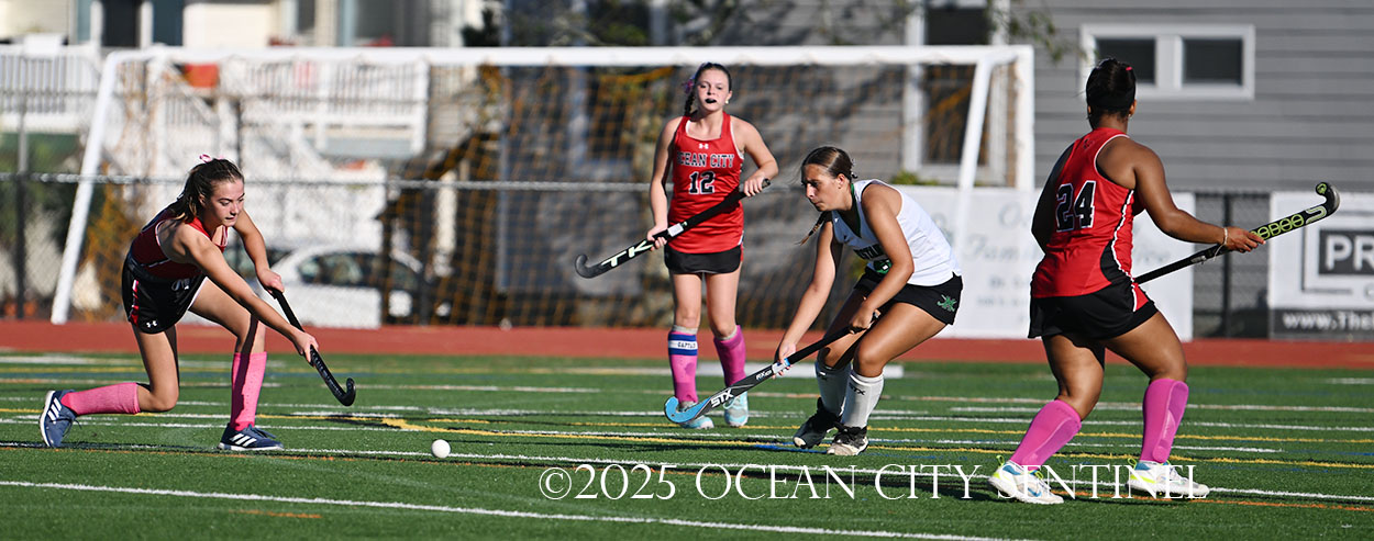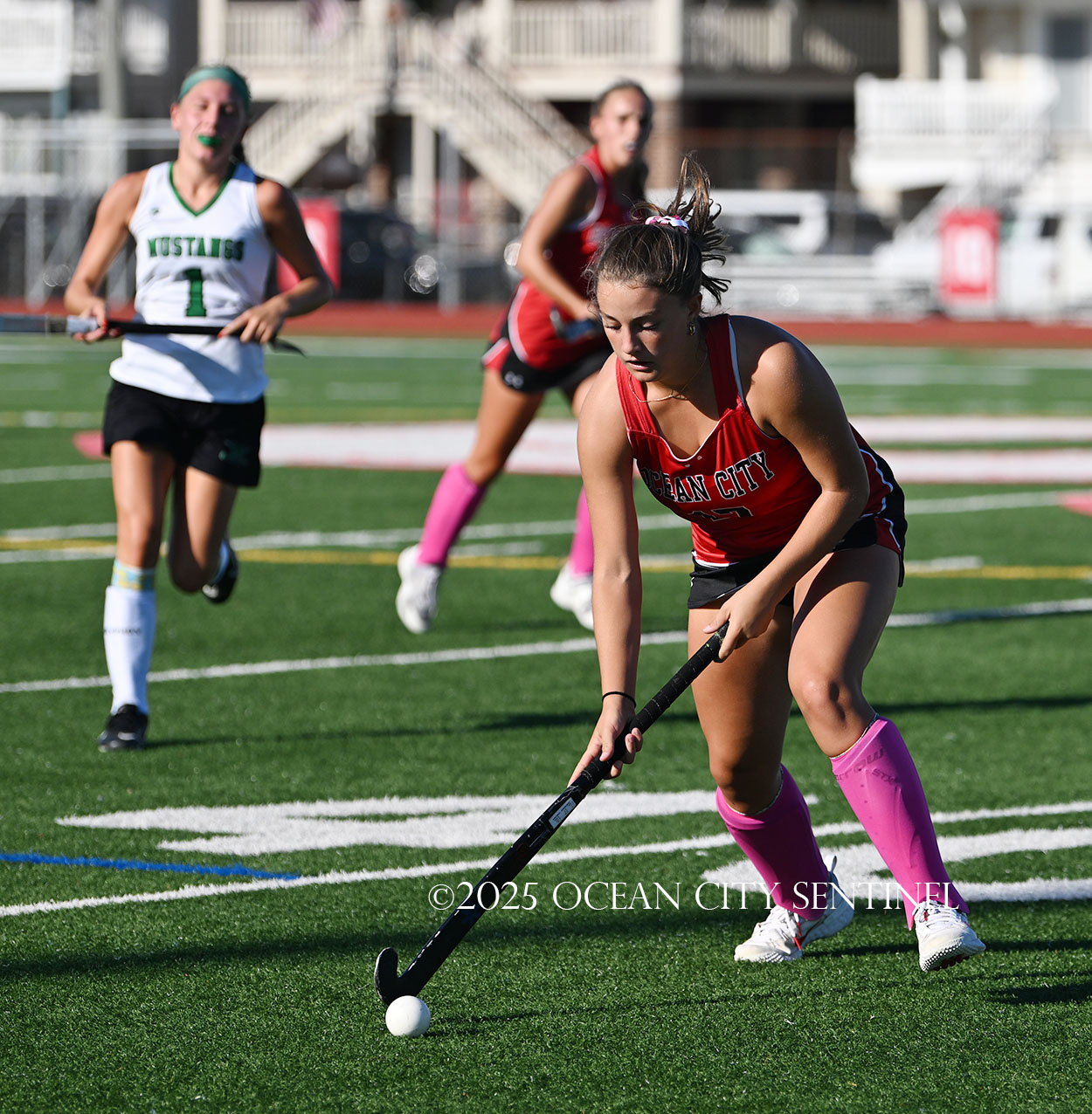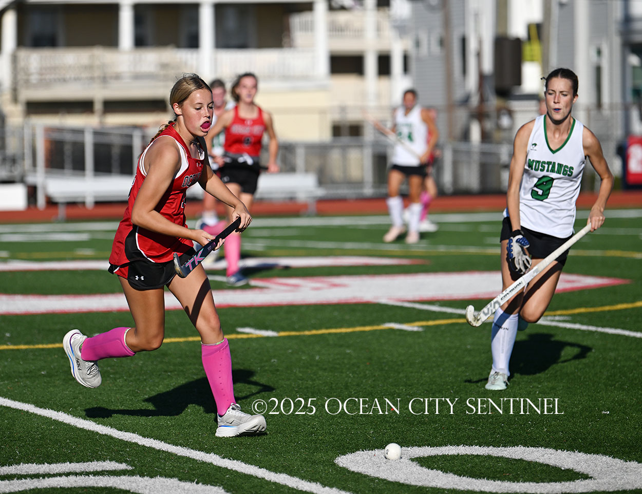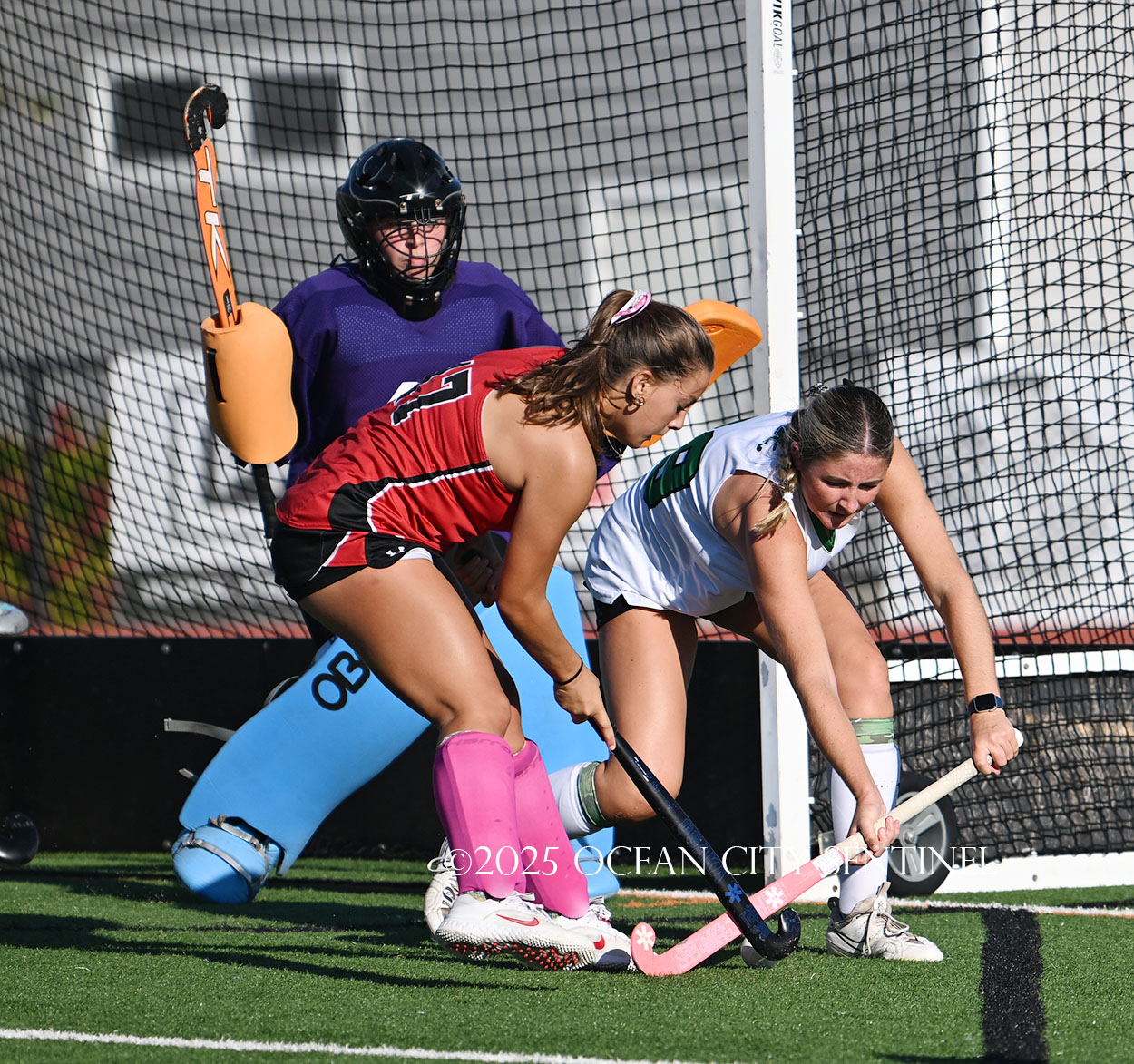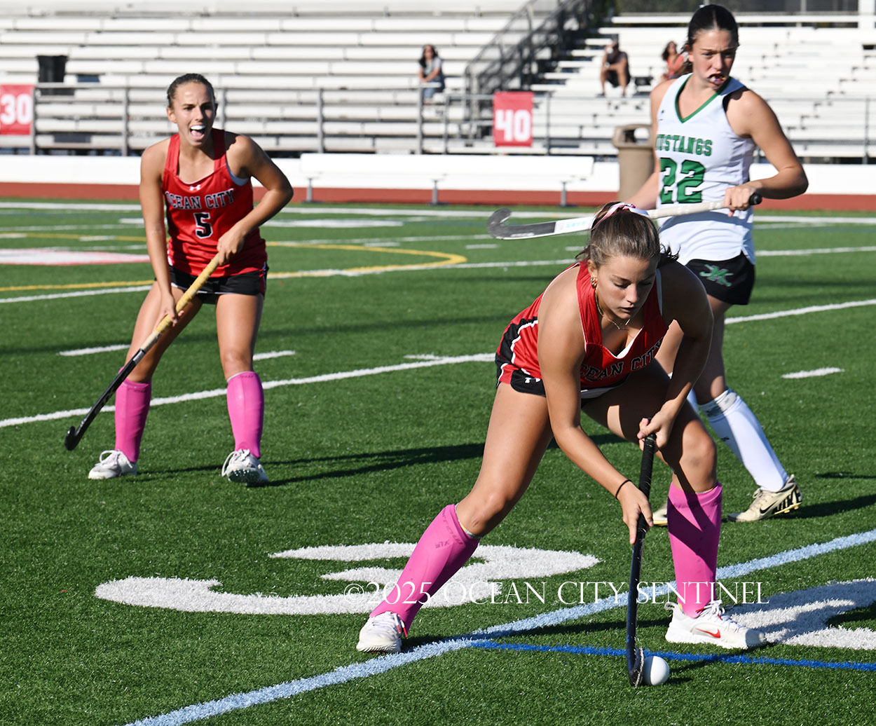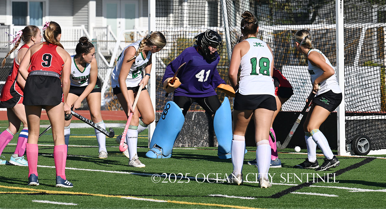 OCEAN CITY – At top, Ocean City High School’s Faelyn Clark (No. 17) on the attack in front of the Mainland Mustangs’ net in the annual pink field hockey game at Carey Stadium Oct. 6. Defending are goalie Isabella Saad, who had five saves in the game, and Kate Armstrong. The Raiders won, 8-0. Clark scored on the play and teammate Casey Adamson added four goals. Stevie Wright, Lyla Clark and Marley Dwyer had a goal apiece. Later in the week, the Mustang girls beat Absegami 3-0 with two goals by Addie Scanlon and one by Joey Hemphill.
