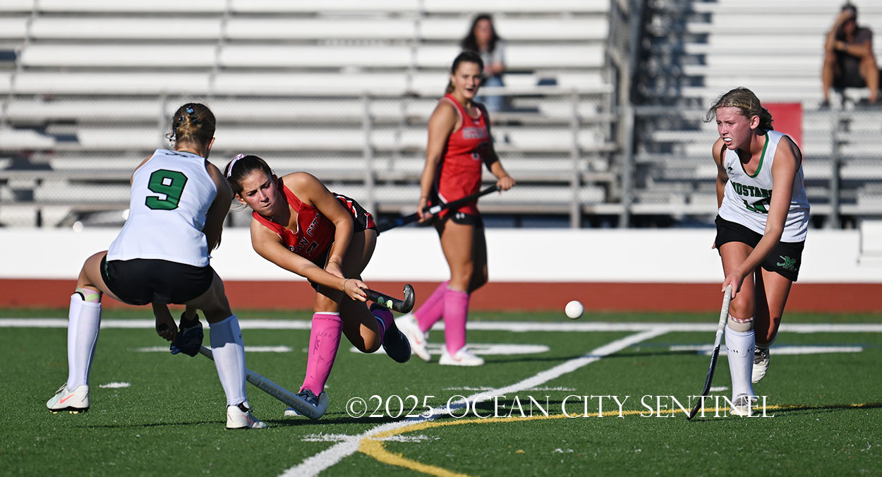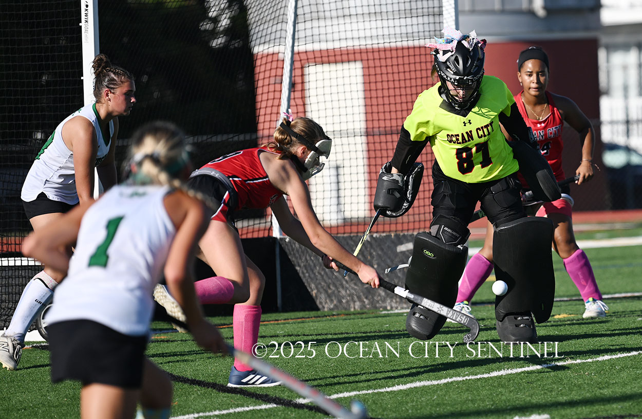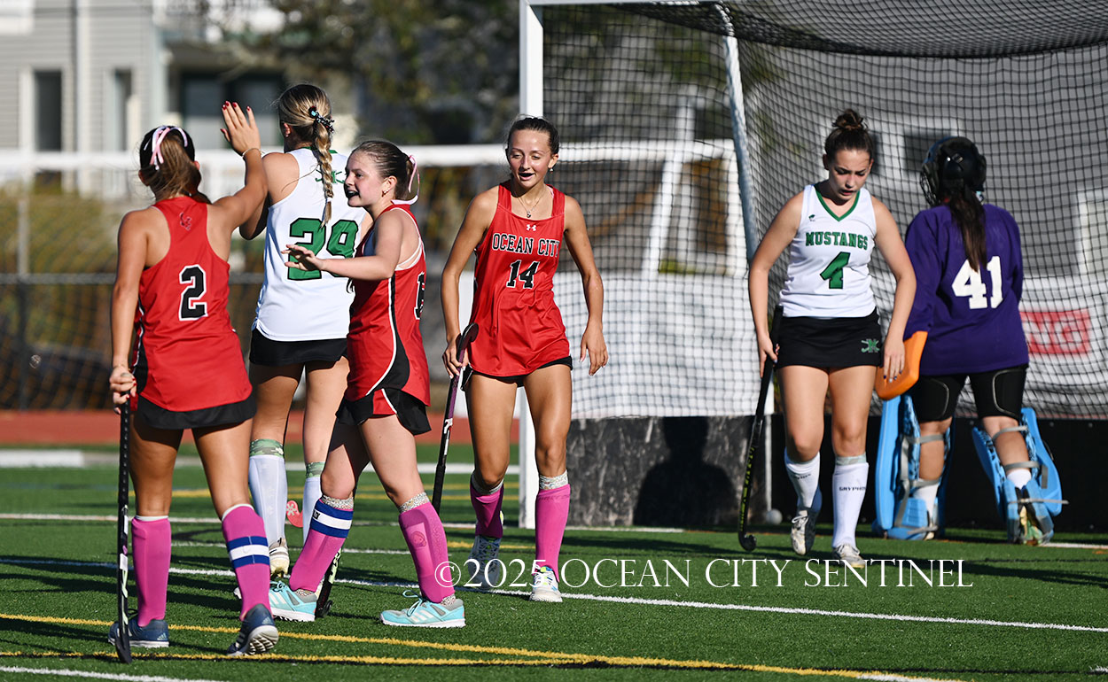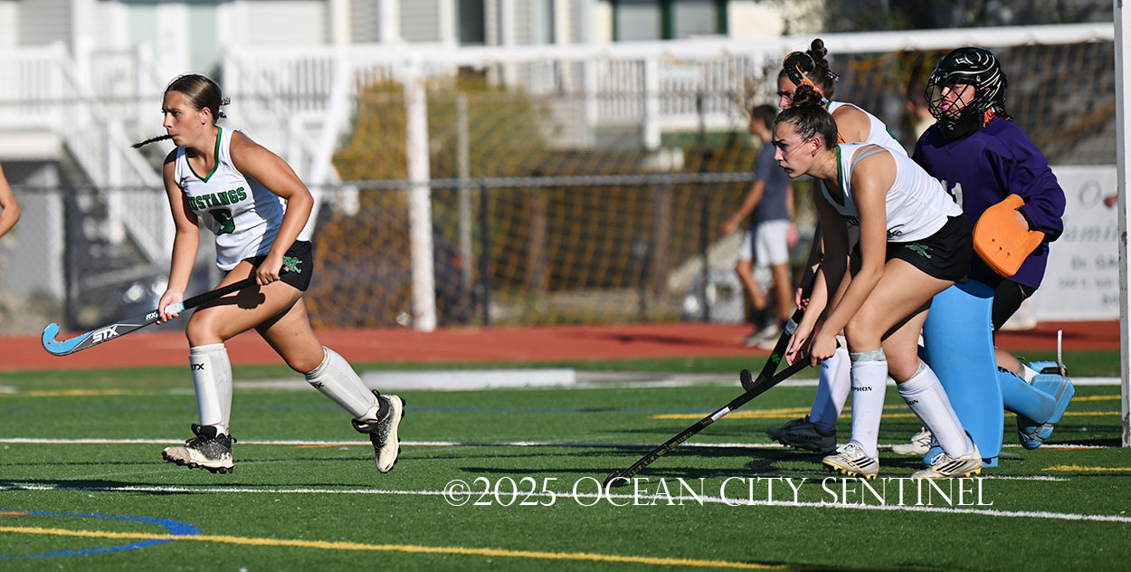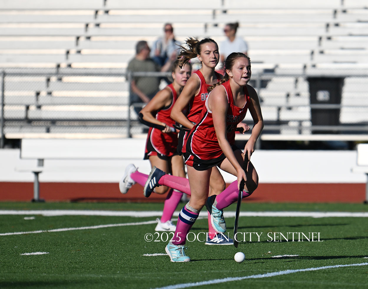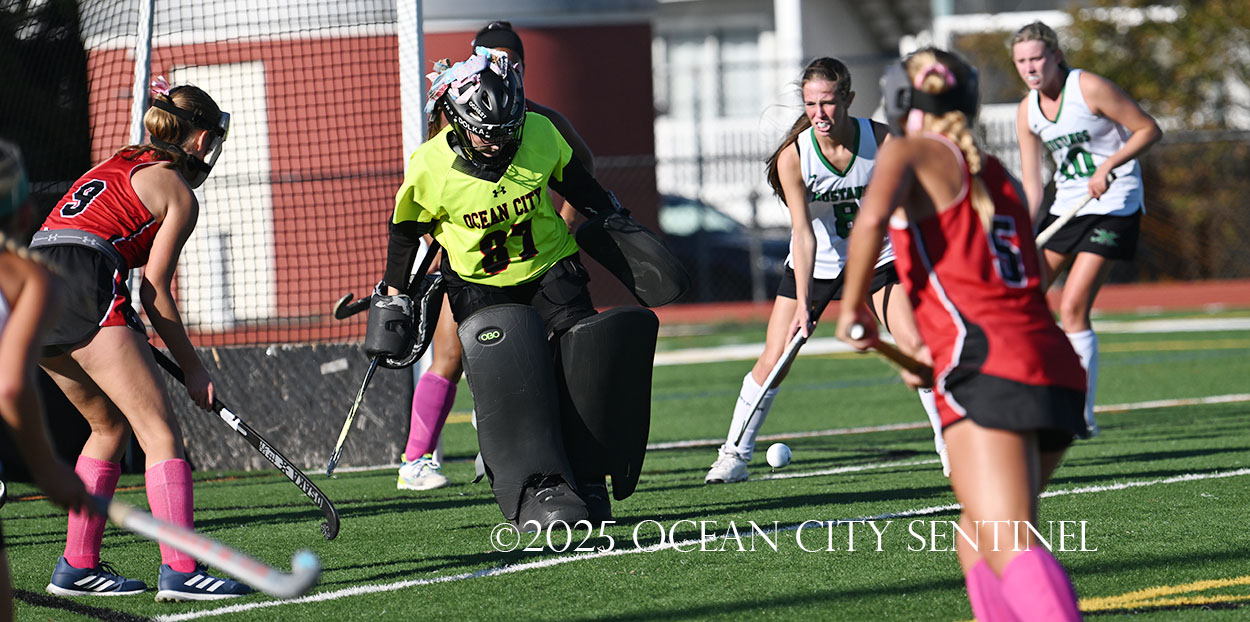 OCEAN CITY – At top, Ocean City High School’s Faelyn Clark (No. 17) on the attack in front of the Mainland Mustangs’ net in the annual pink field hockey game at Carey Stadium Oct. 6. Defending are goalie Isabella Saad, who had five saves in the game, and Kate Armstrong. The Raiders won, 8-0. Clark scored on the play and teammate Casey Adamson added four goals. Stevie Wright, Lyla Clark and Marley Dwyer had a goal apiece. Later in the week, the Mustang girls beat Absegami 3-0 with two goals by Addie Scanlon and one by Joey Hemphill.