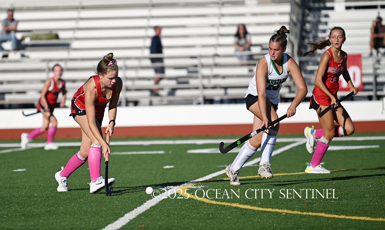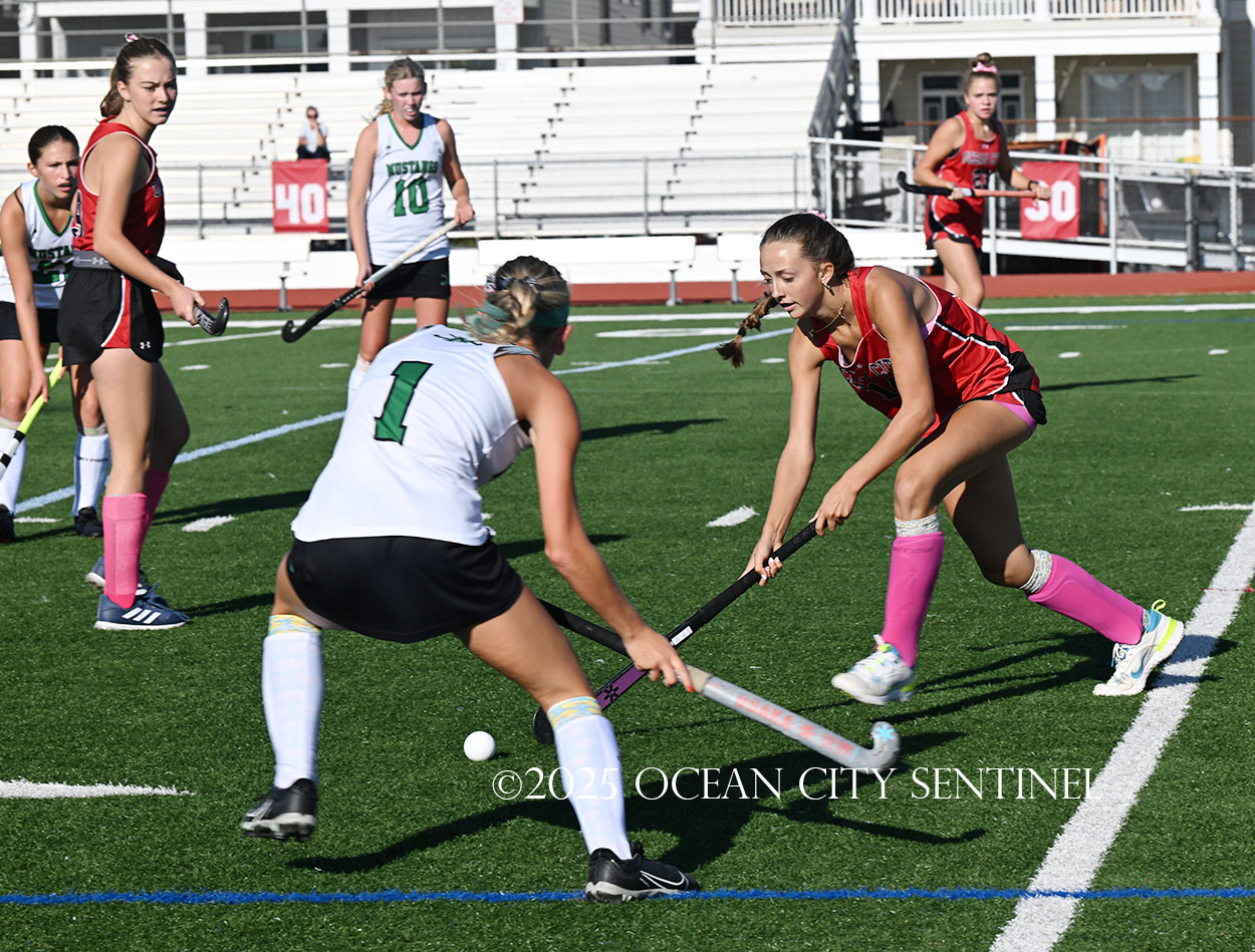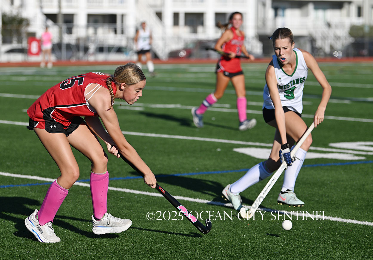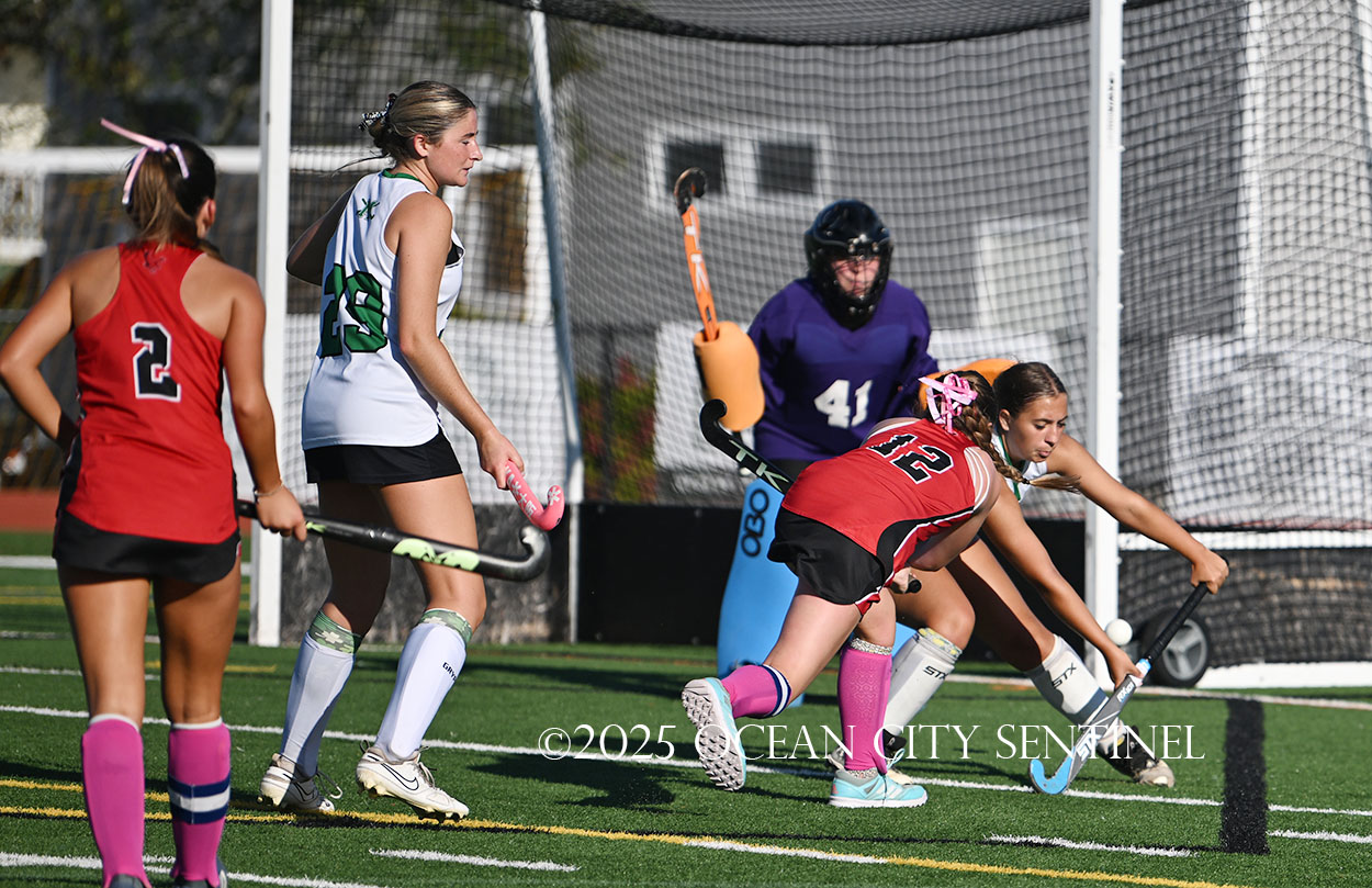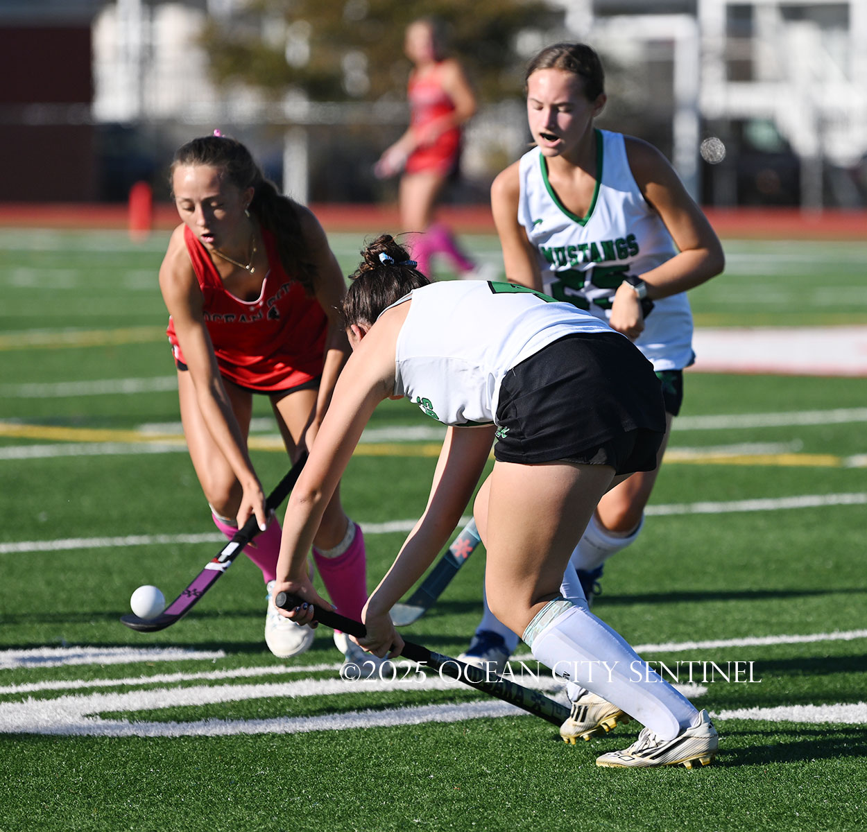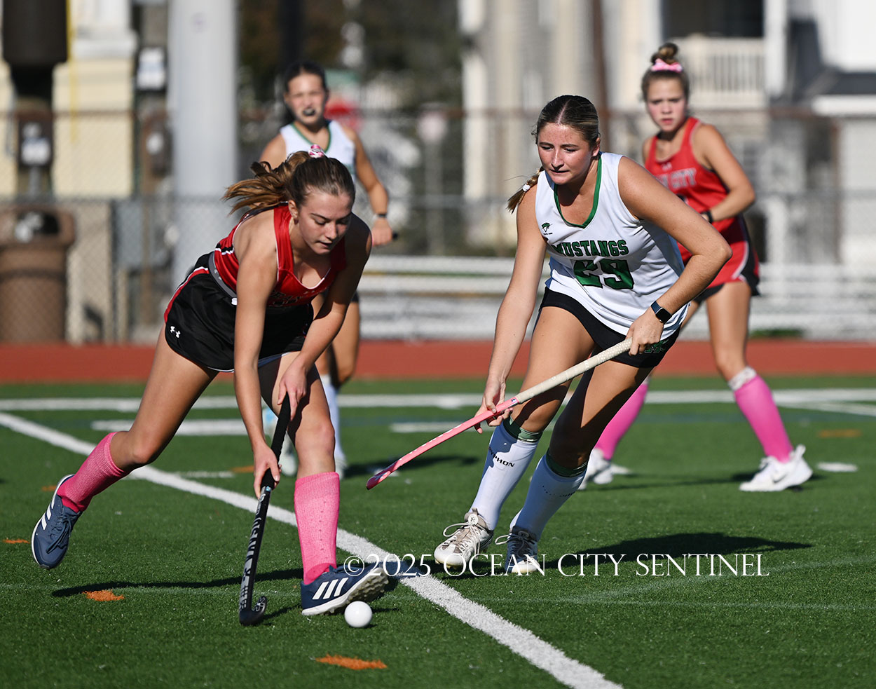 OCEAN CITY – At top, Ocean City High School’s Faelyn Clark (No. 17) on the attack in front of the Mainland Mustangs’ net in the annual pink field hockey game at Carey Stadium Oct. 6. Defending are goalie Isabella Saad, who had five saves in the game, and Kate Armstrong. The Raiders won, 8-0. Clark scored on the play and teammate Casey Adamson added four goals. Stevie Wright, Lyla Clark and Marley Dwyer had a goal apiece. Later in the week, the Mustang girls beat Absegami 3-0 with two goals by Addie Scanlon and one by Joey Hemphill.