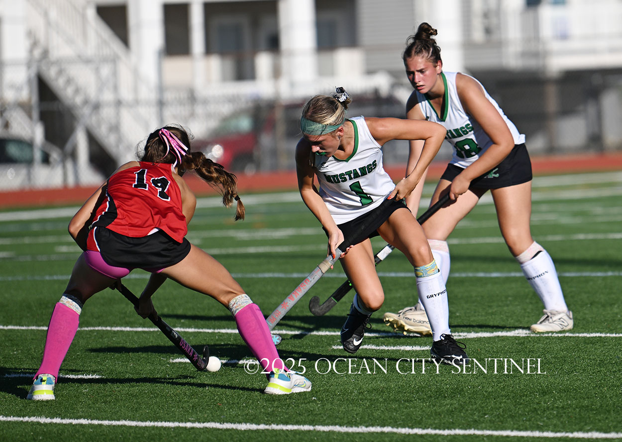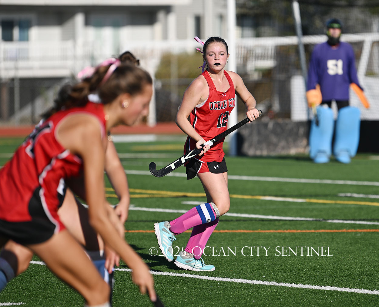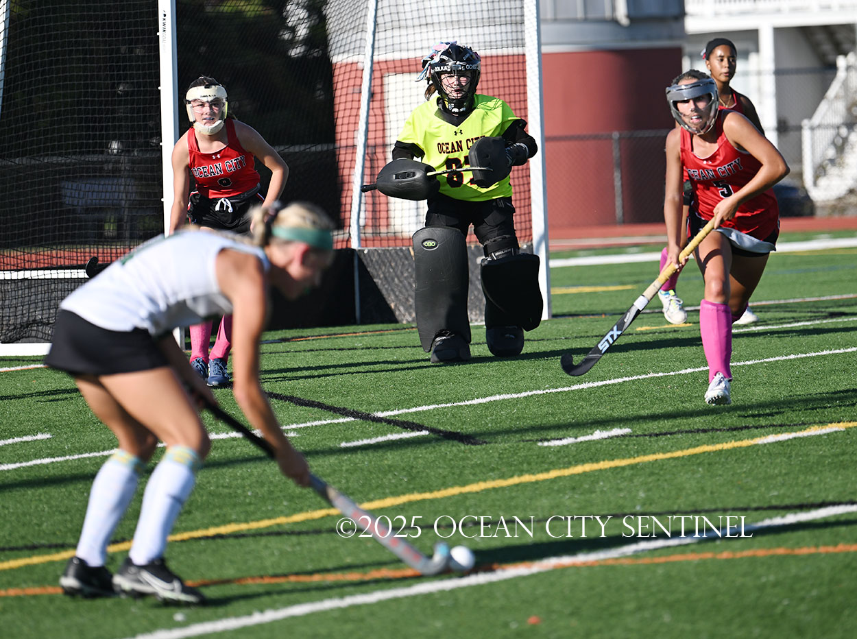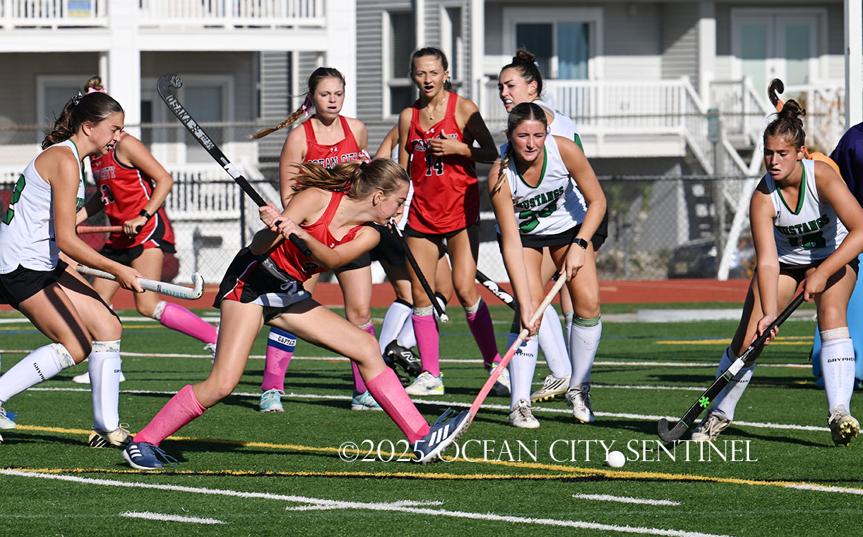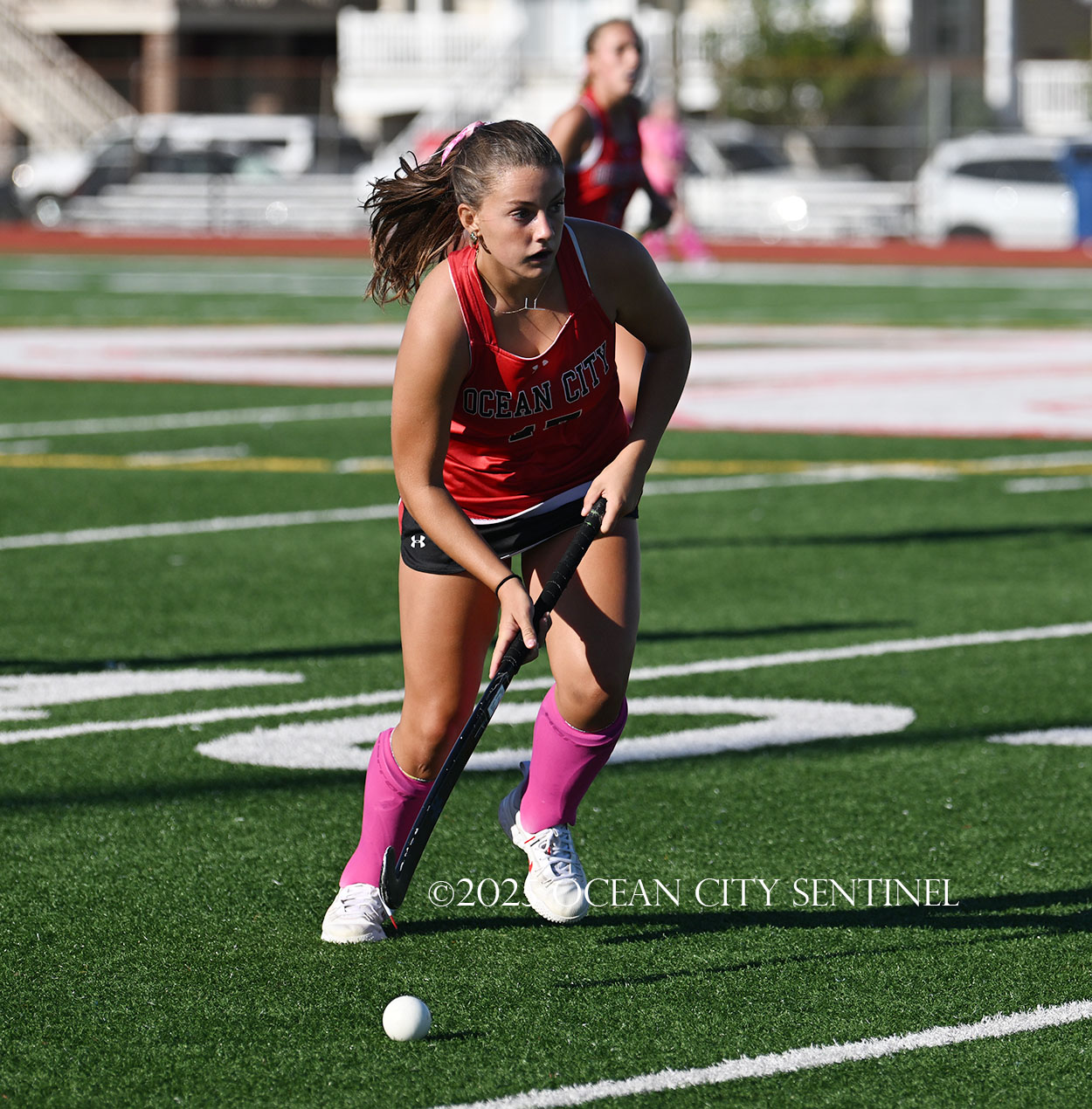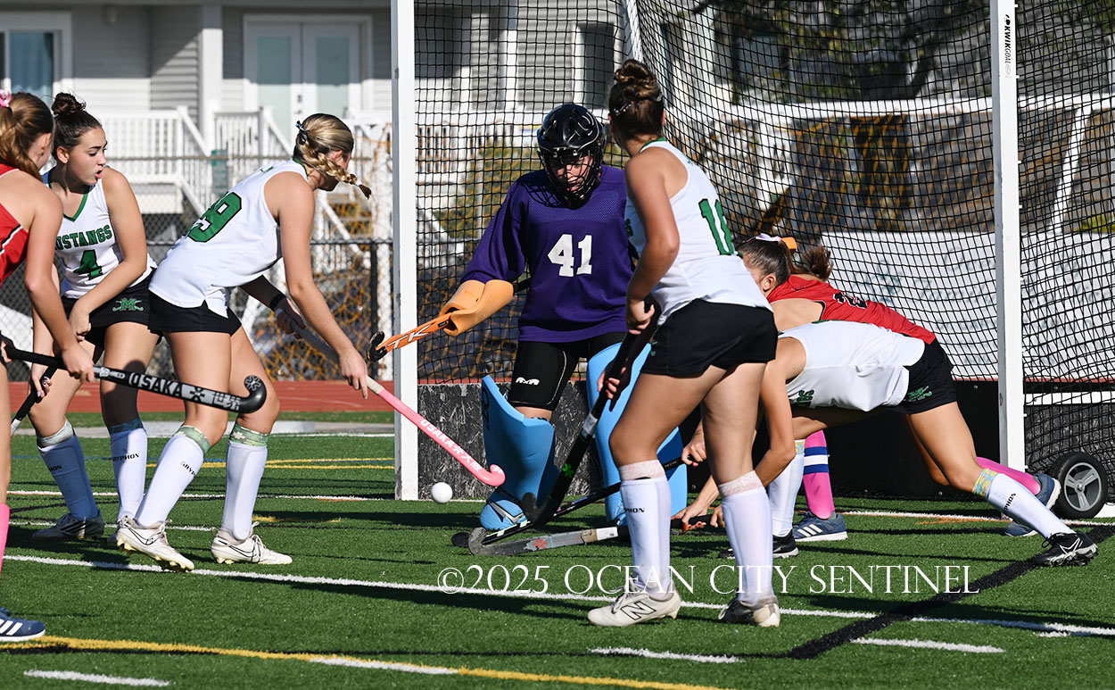 OCEAN CITY – At top, Ocean City High School’s Faelyn Clark (No. 17) on the attack in front of the Mainland Mustangs’ net in the annual pink field hockey game at Carey Stadium Oct. 6. Defending are goalie Isabella Saad, who had five saves in the game, and Kate Armstrong. The Raiders won, 8-0. Clark scored on the play and teammate Casey Adamson added four goals. Stevie Wright, Lyla Clark and Marley Dwyer had a goal apiece. Later in the week, the Mustang girls beat Absegami 3-0 with two goals by Addie Scanlon and one by Joey Hemphill.