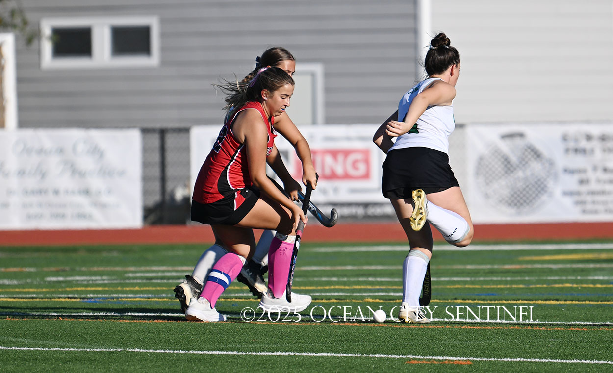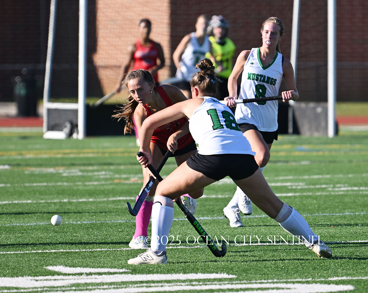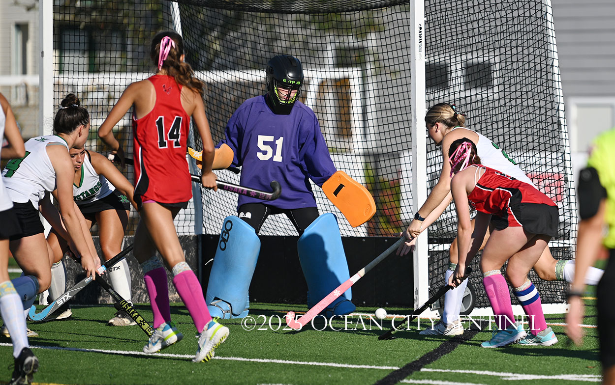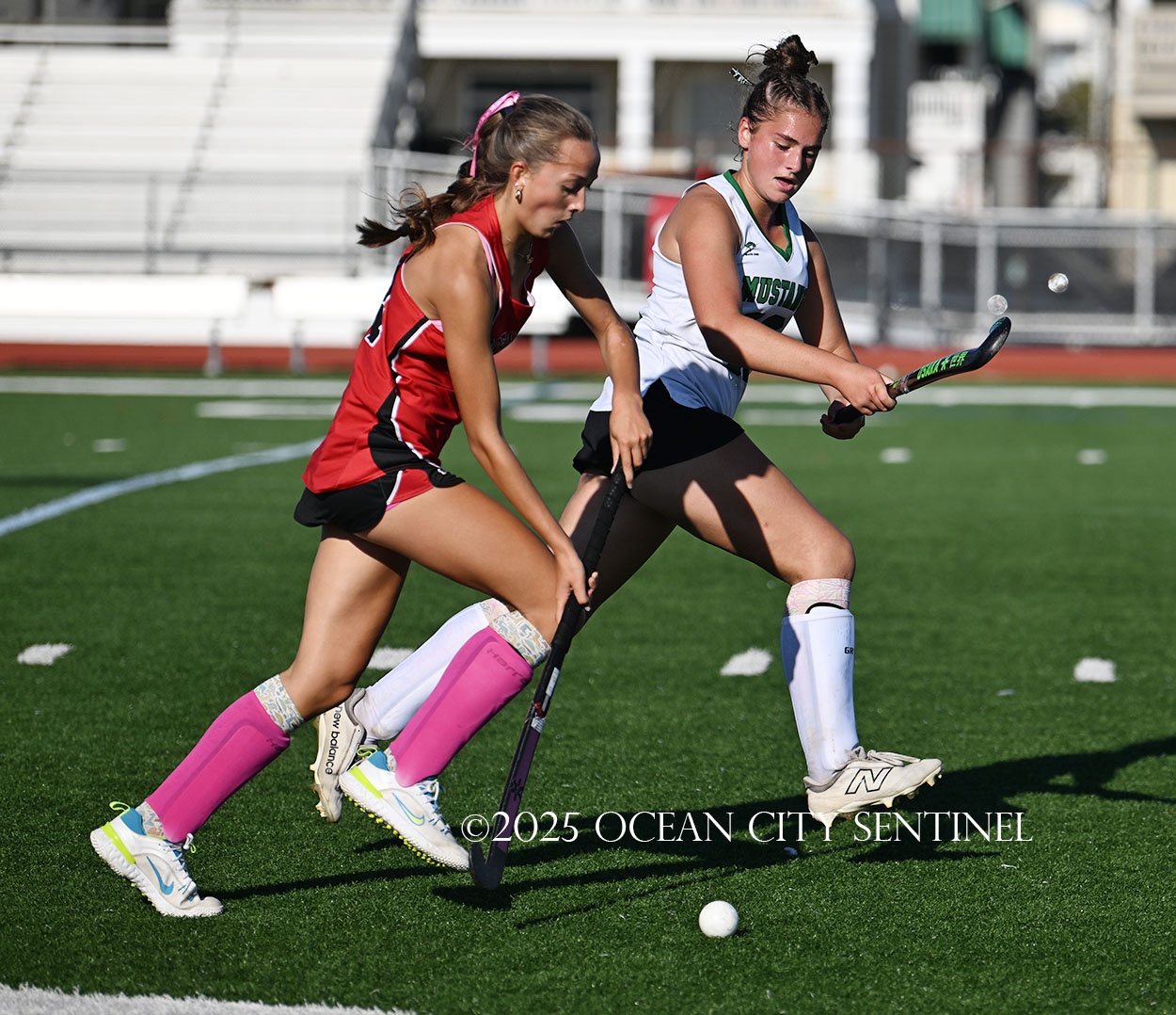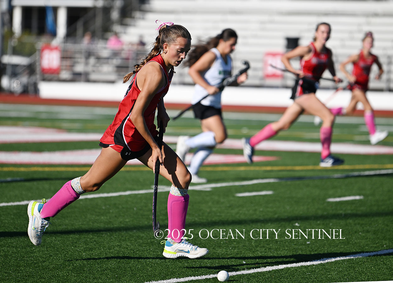 OCEAN CITY – At top, Ocean City High School’s Faelyn Clark (No. 17) on the attack in front of the Mainland Mustangs’ net in the annual pink field hockey game at Carey Stadium Oct. 6. Defending are goalie Isabella Saad, who had five saves in the game, and Kate Armstrong. The Raiders won, 8-0. Clark scored on the play and teammate Casey Adamson added four goals. Stevie Wright, Lyla Clark and Marley Dwyer had a goal apiece. Later in the week, the Mustang girls beat Absegami 3-0 with two goals by Addie Scanlon and one by Joey Hemphill.