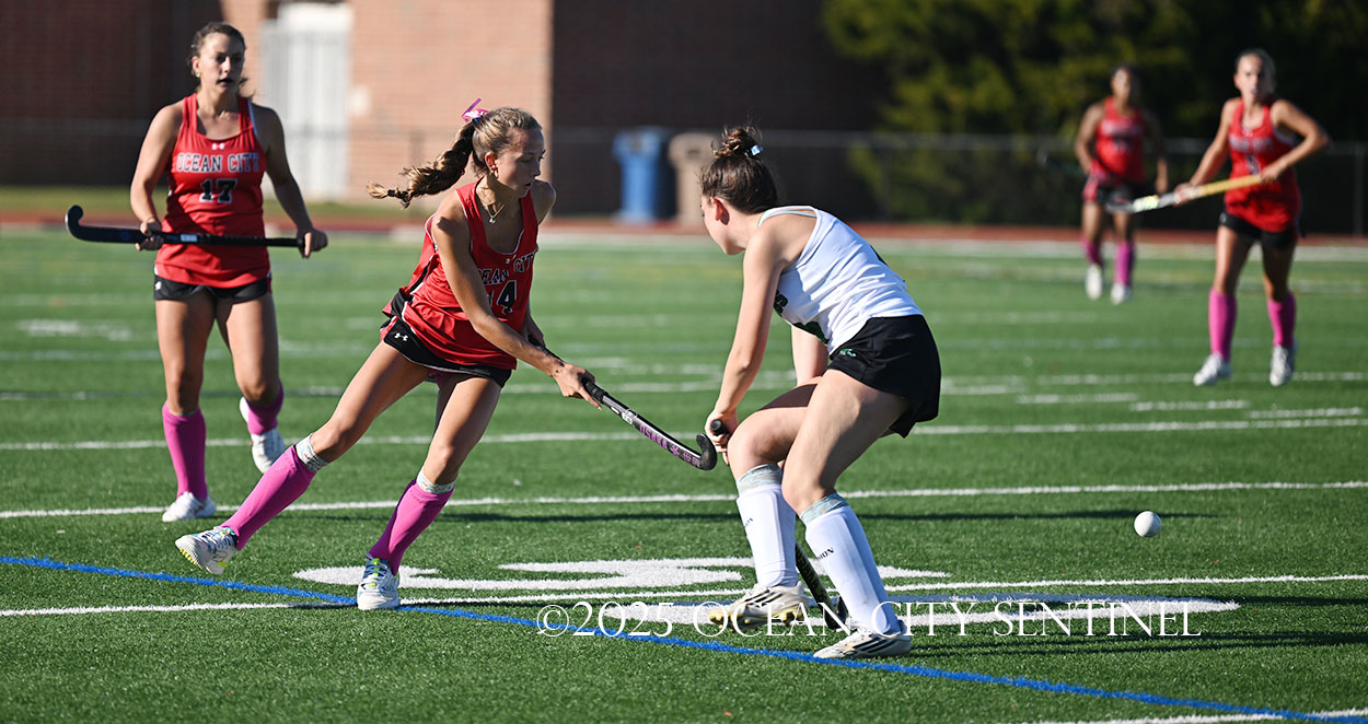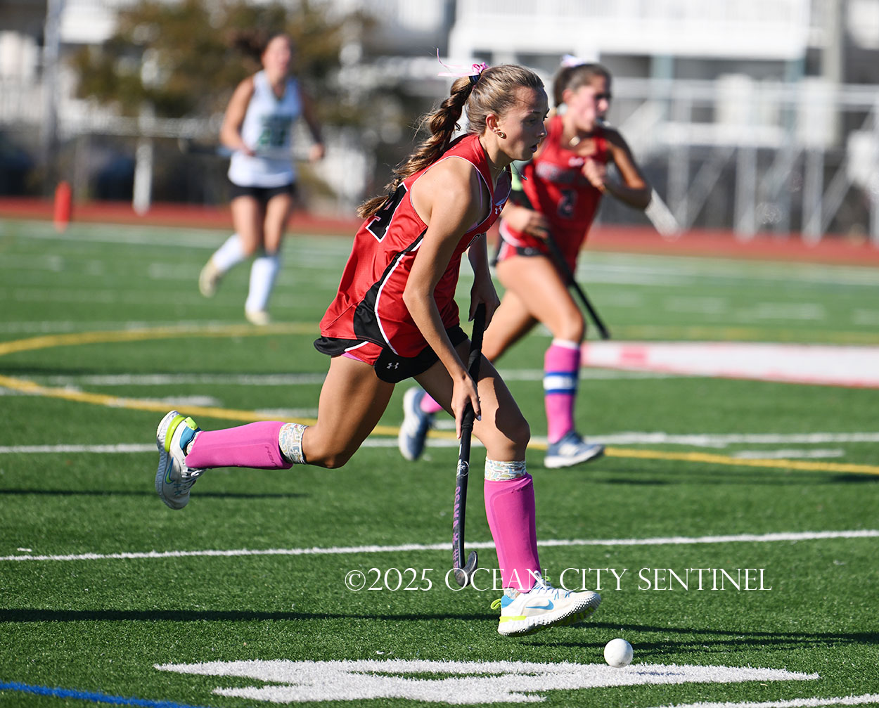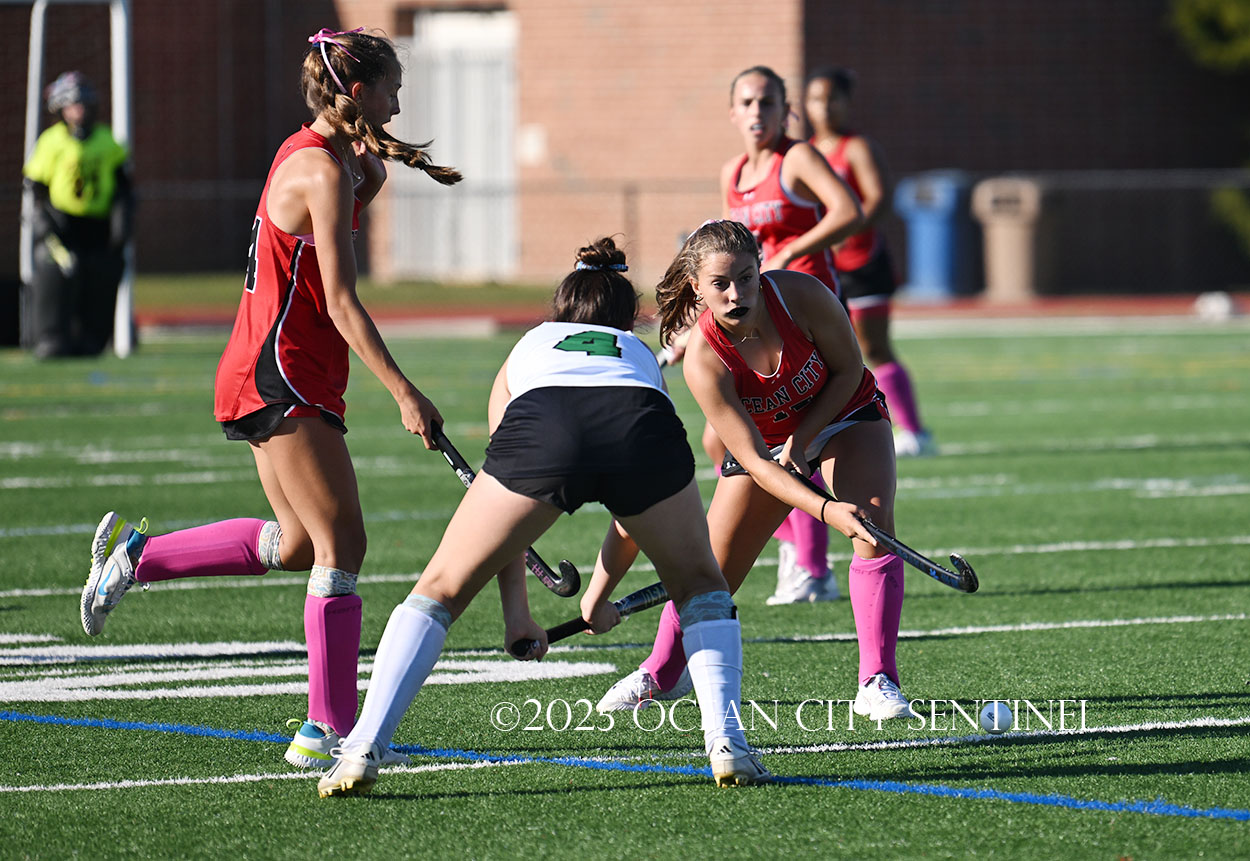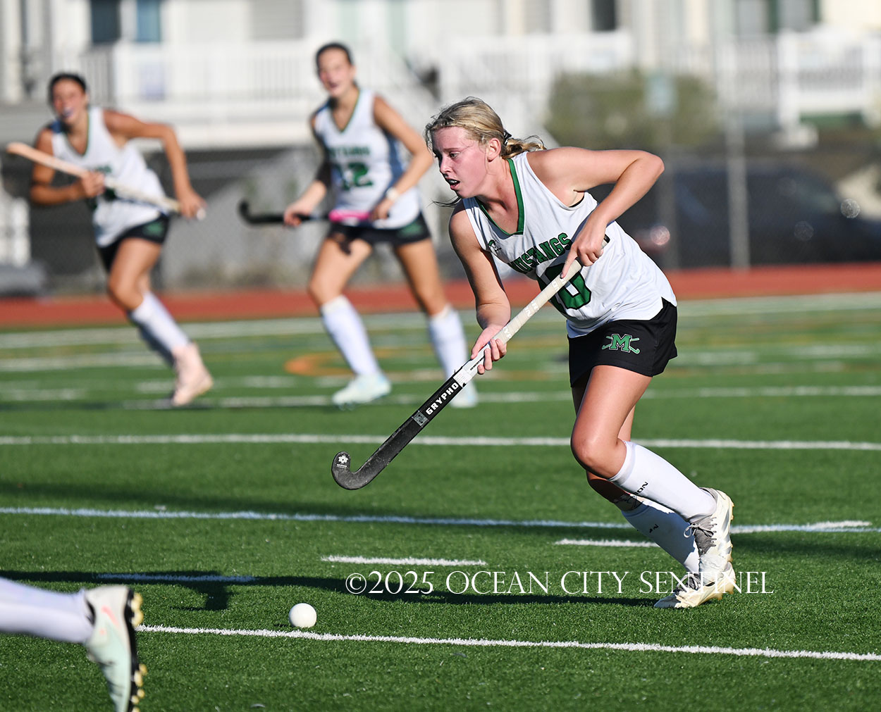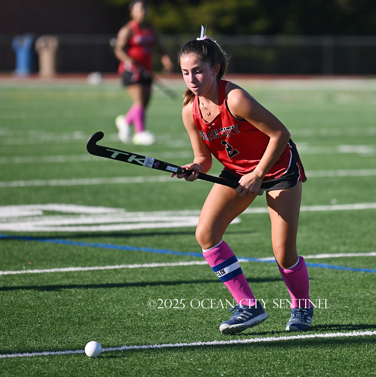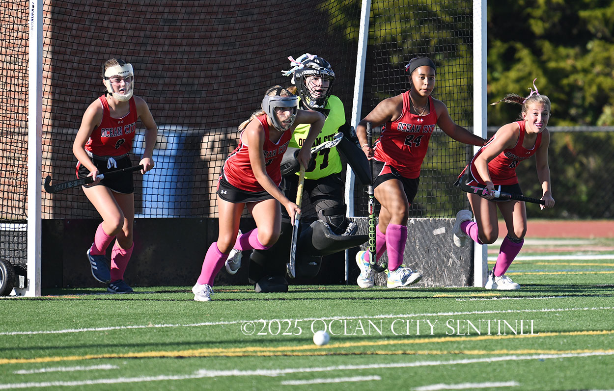 OCEAN CITY – At top, Ocean City High School’s Faelyn Clark (No. 17) on the attack in front of the Mainland Mustangs’ net in the annual pink field hockey game at Carey Stadium Oct. 6. Defending are goalie Isabella Saad, who had five saves in the game, and Kate Armstrong. The Raiders won, 8-0. Clark scored on the play and teammate Casey Adamson added four goals. Stevie Wright, Lyla Clark and Marley Dwyer had a goal apiece. Later in the week, the Mustang girls beat Absegami 3-0 with two goals by Addie Scanlon and one by Joey Hemphill.