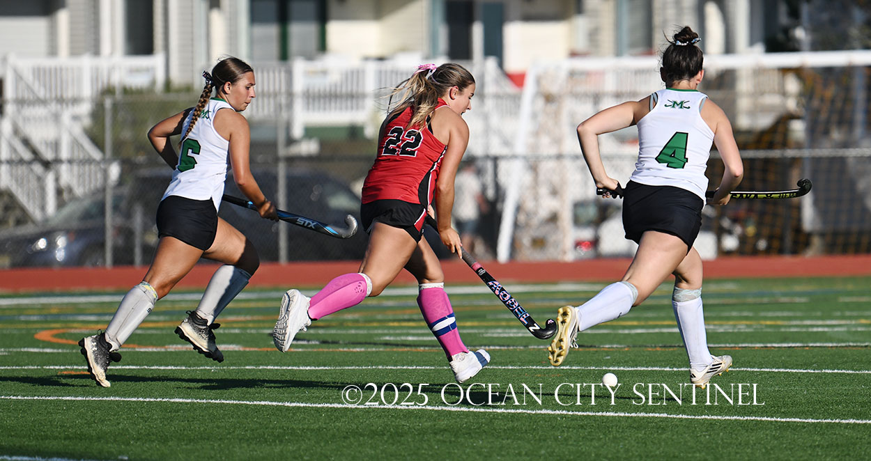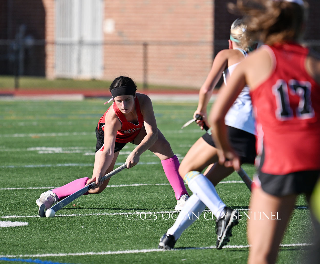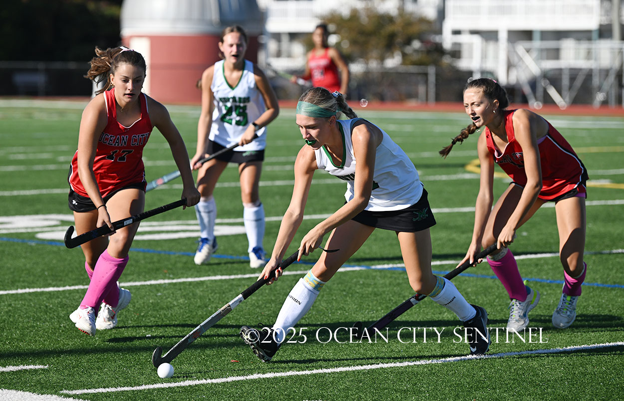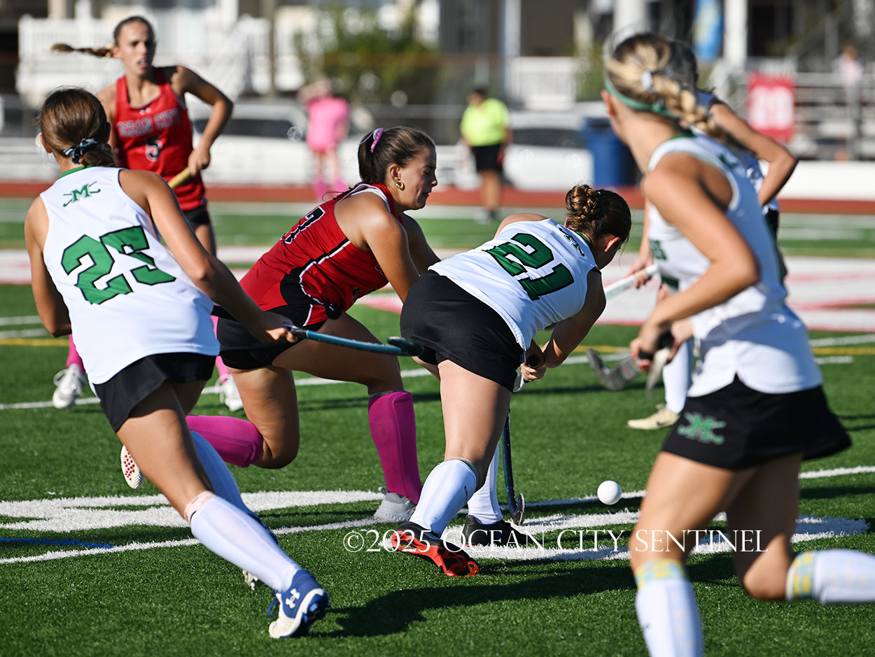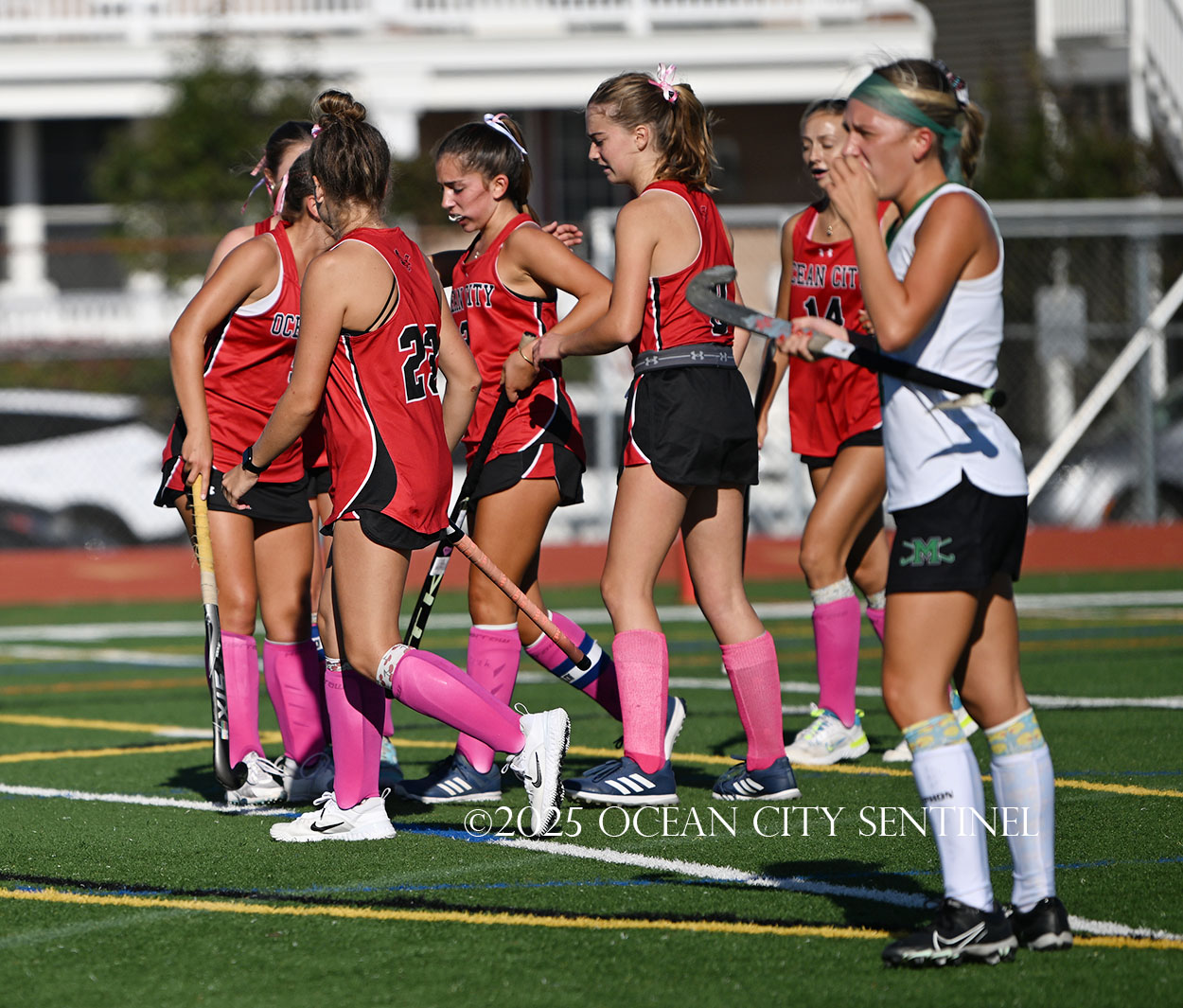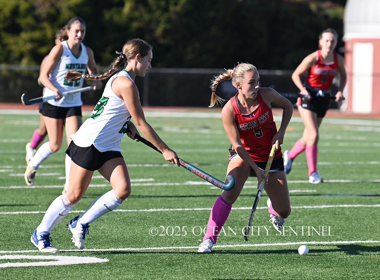 OCEAN CITY – At top, Ocean City High School’s Faelyn Clark (No. 17) on the attack in front of the Mainland Mustangs’ net in the annual pink field hockey game at Carey Stadium Oct. 6. Defending are goalie Isabella Saad, who had five saves in the game, and Kate Armstrong. The Raiders won, 8-0. Clark scored on the play and teammate Casey Adamson added four goals. Stevie Wright, Lyla Clark and Marley Dwyer had a goal apiece. Later in the week, the Mustang girls beat Absegami 3-0 with two goals by Addie Scanlon and one by Joey Hemphill.