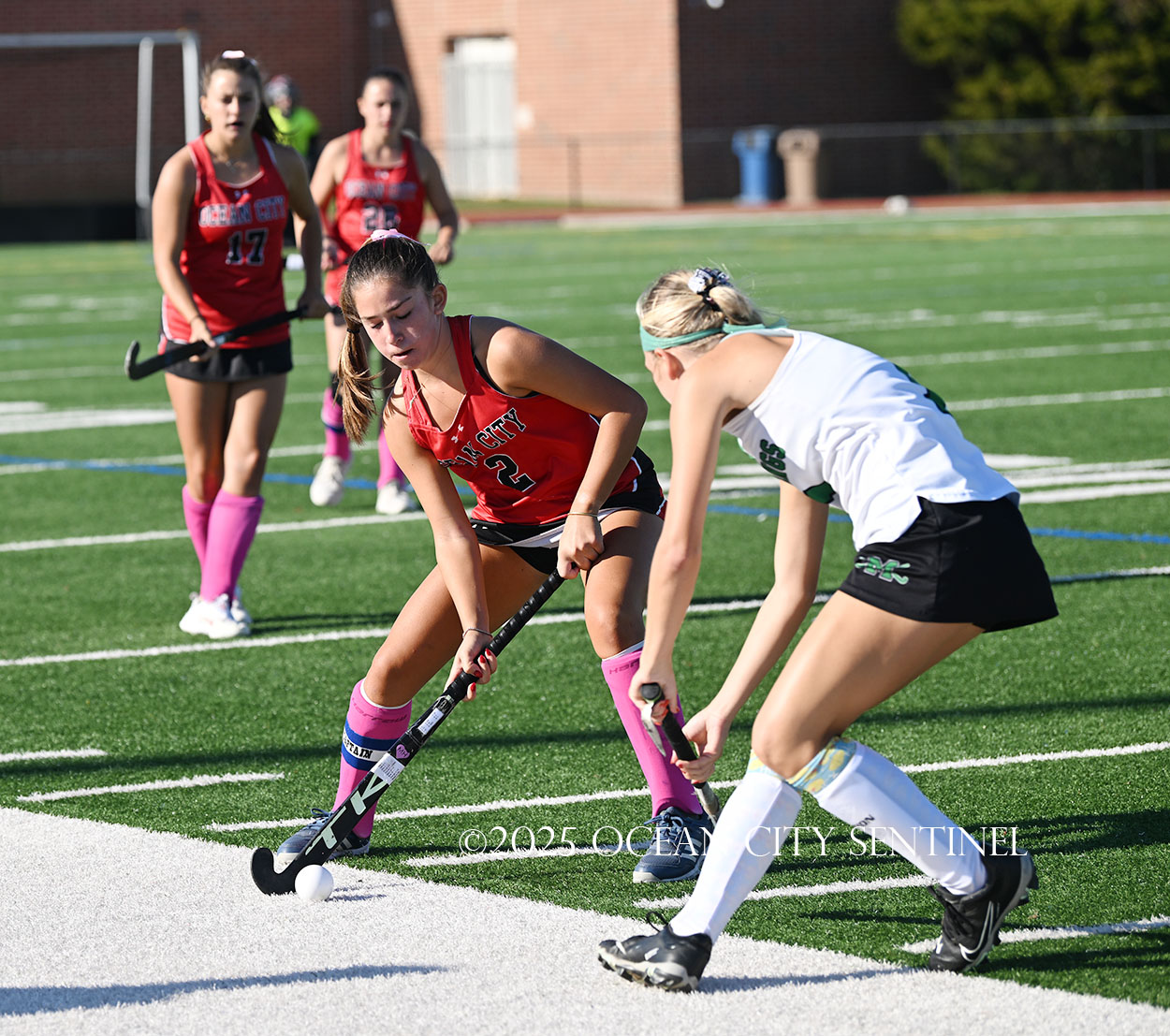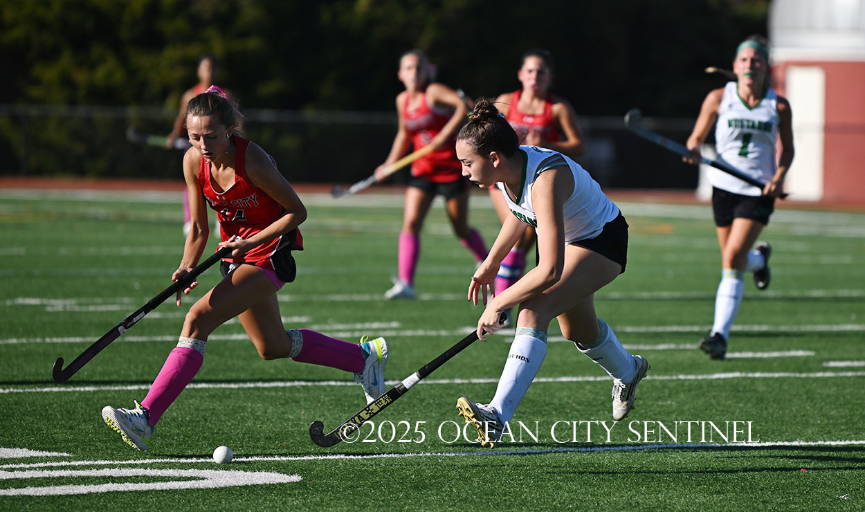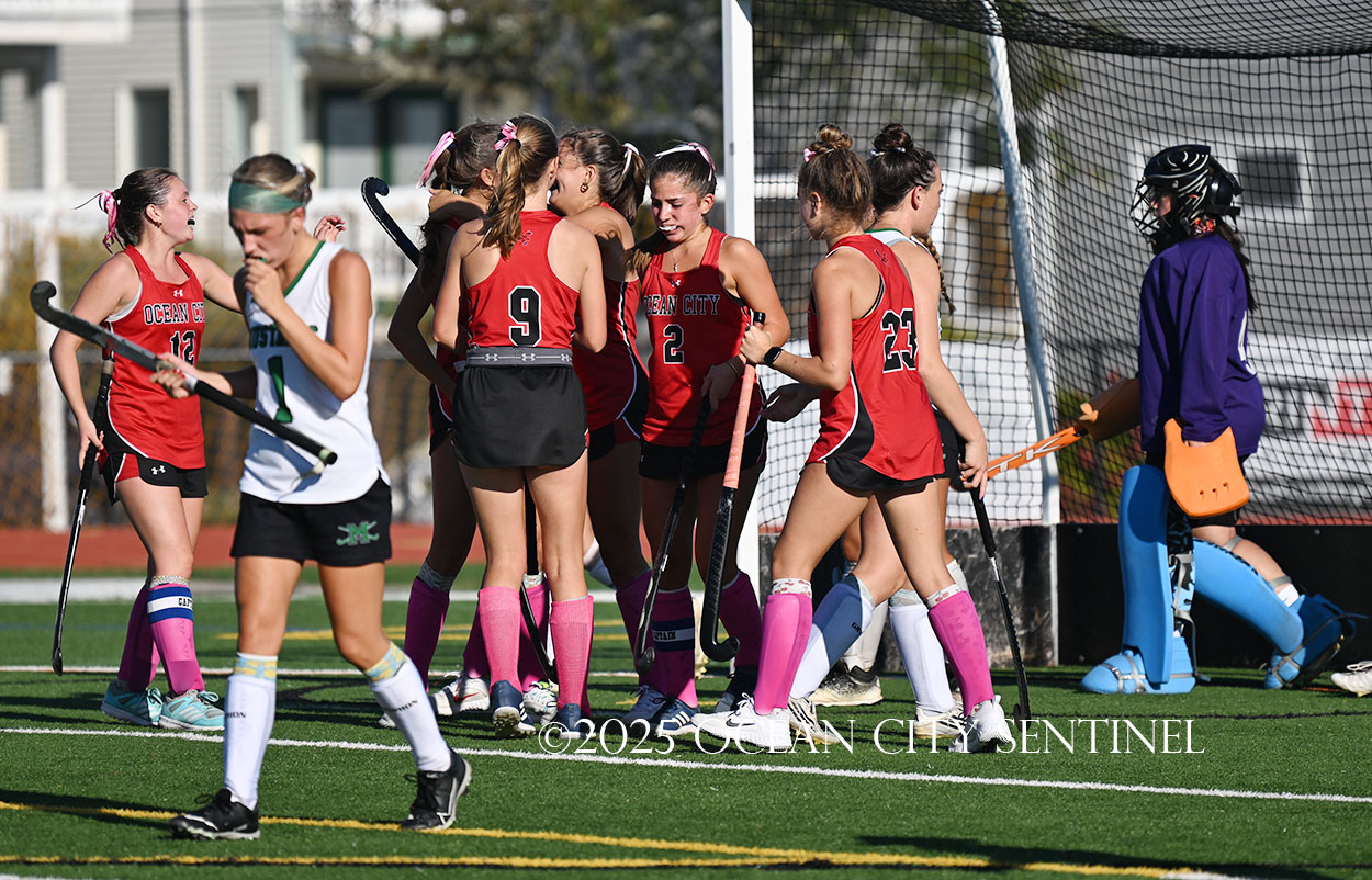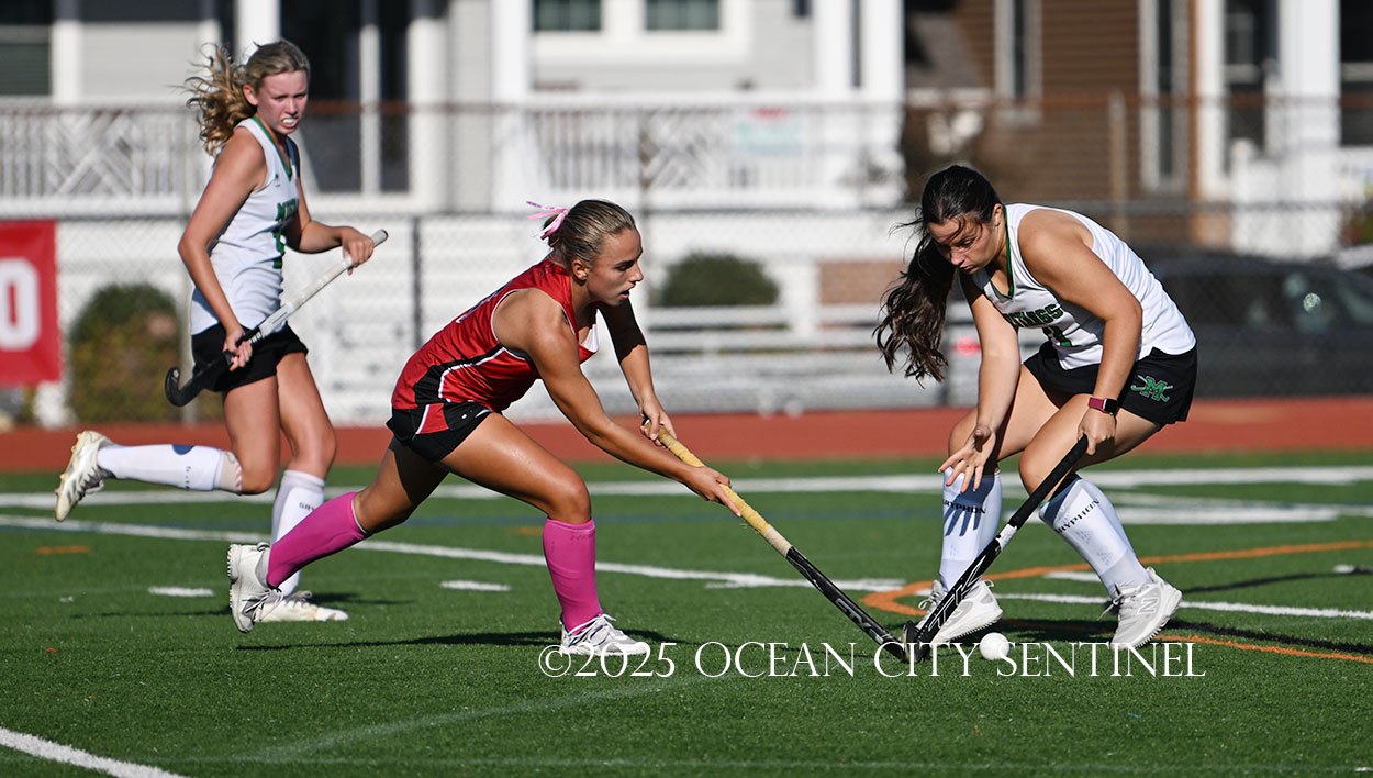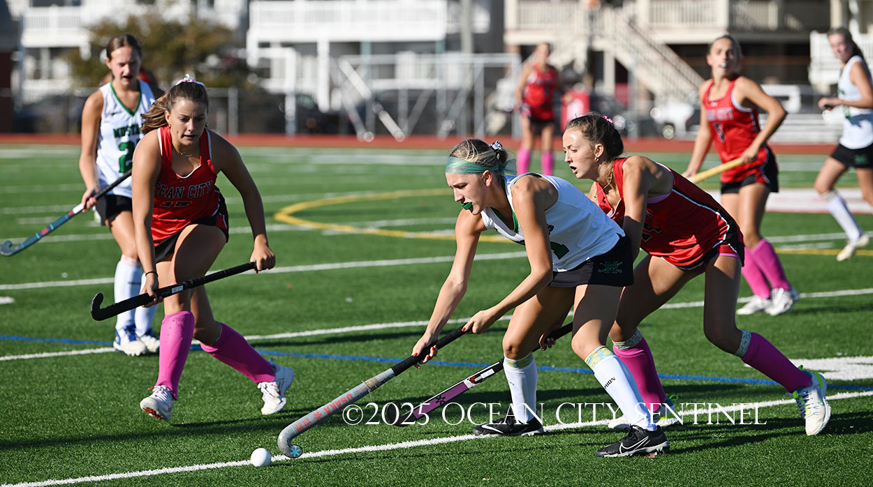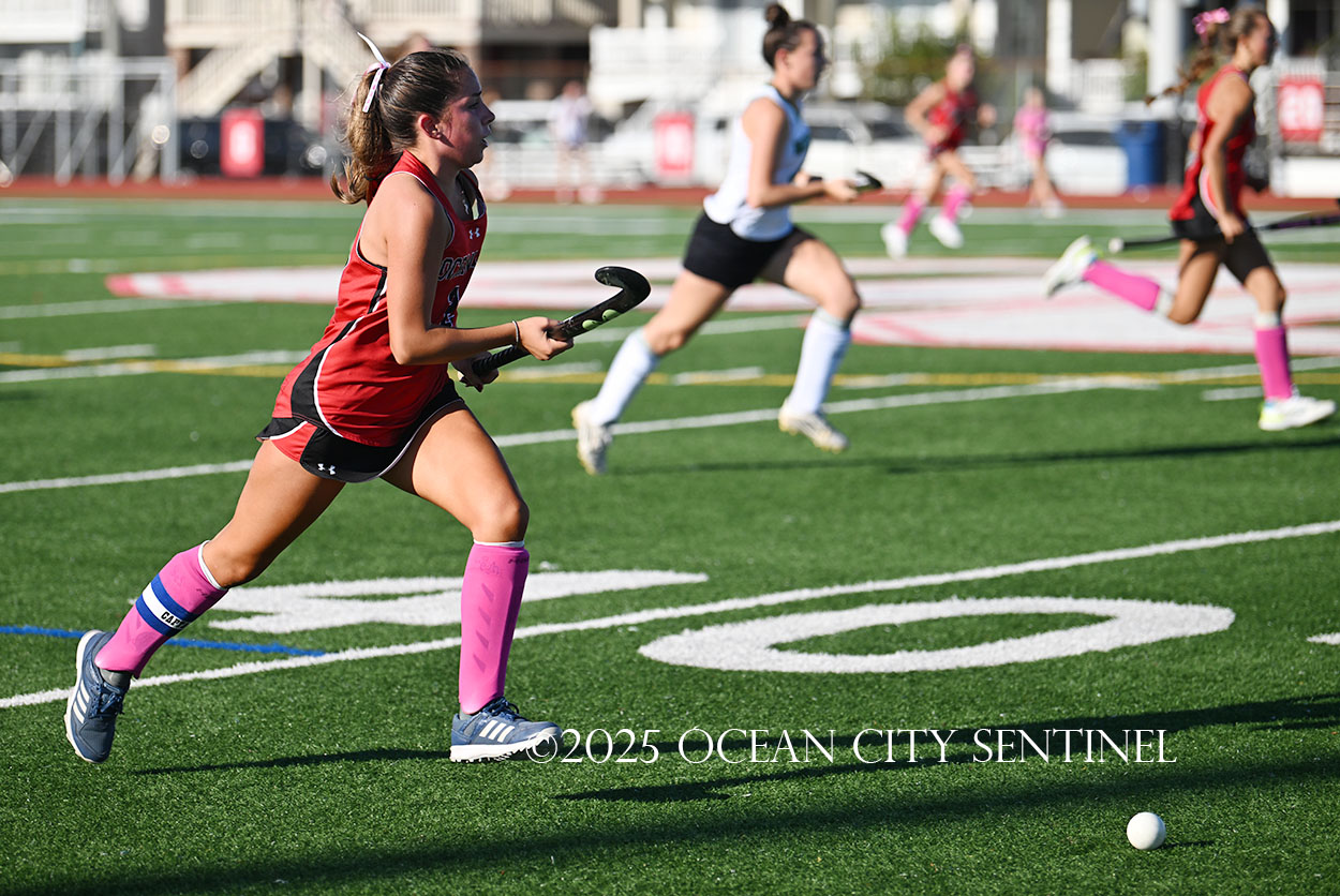 OCEAN CITY – At top, Ocean City High School’s Faelyn Clark (No. 17) on the attack in front of the Mainland Mustangs’ net in the annual pink field hockey game at Carey Stadium Oct. 6. Defending are goalie Isabella Saad, who had five saves in the game, and Kate Armstrong. The Raiders won, 8-0. Clark scored on the play and teammate Casey Adamson added four goals. Stevie Wright, Lyla Clark and Marley Dwyer had a goal apiece. Later in the week, the Mustang girls beat Absegami 3-0 with two goals by Addie Scanlon and one by Joey Hemphill.
