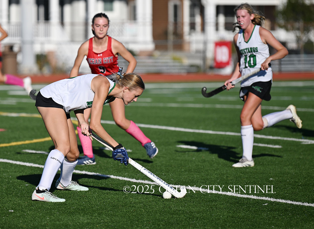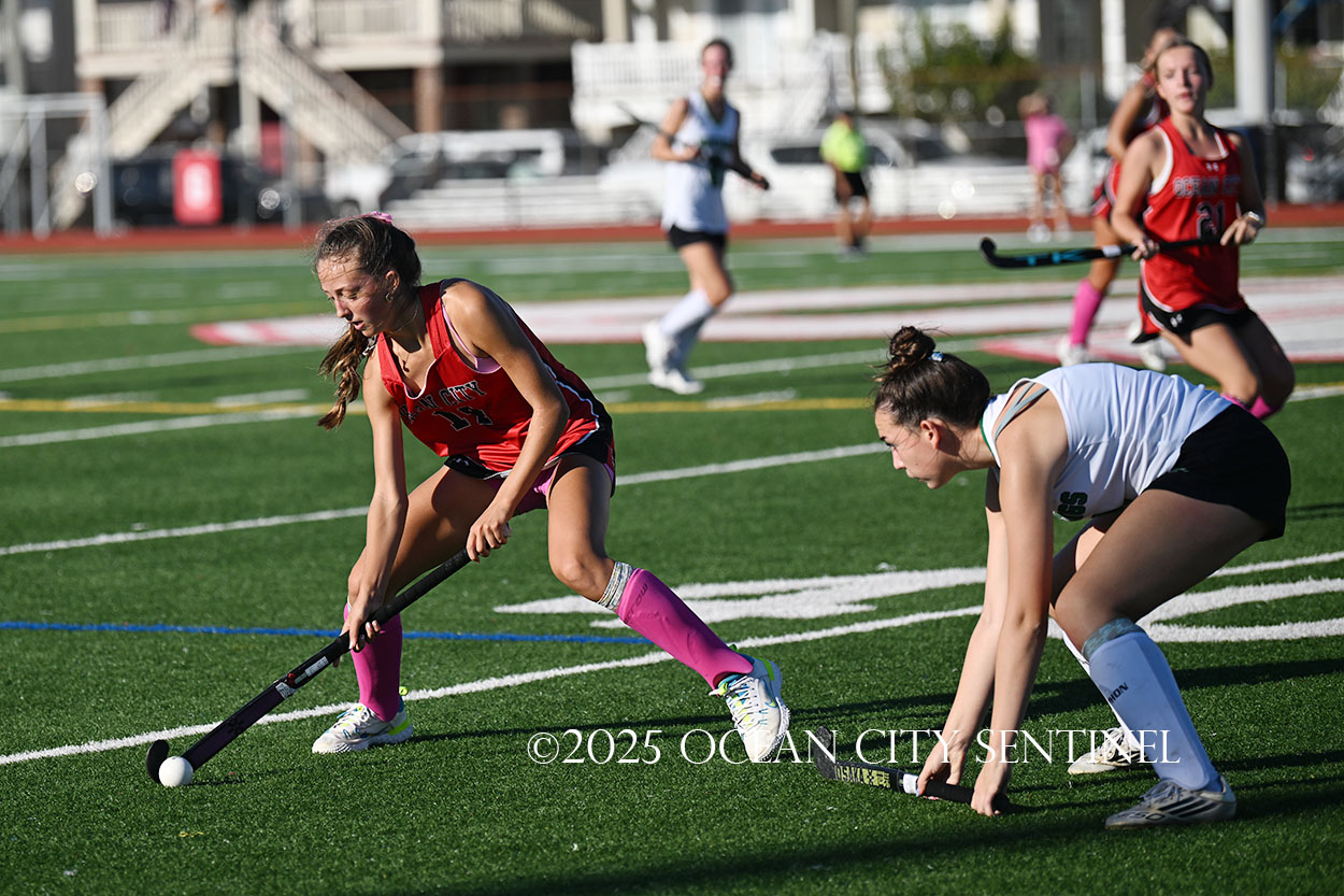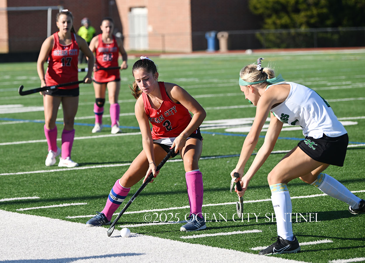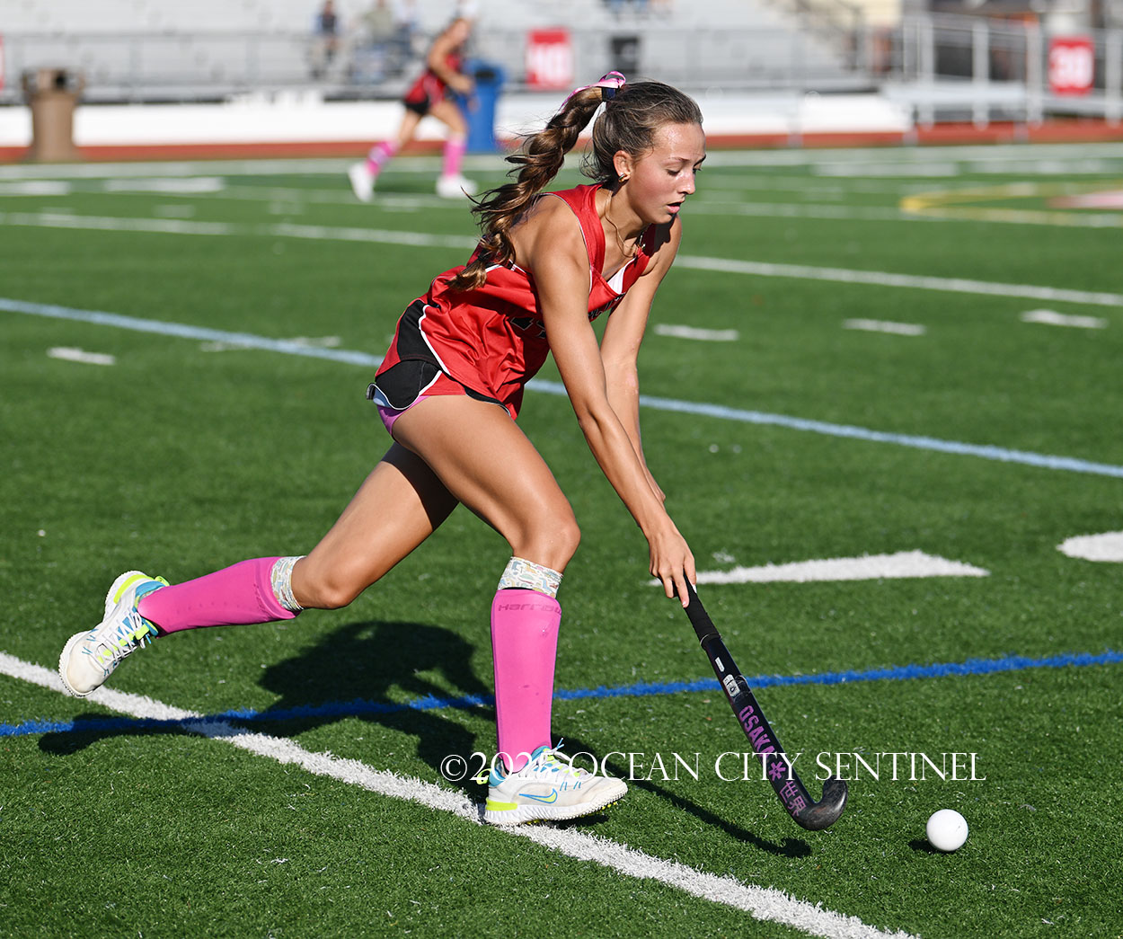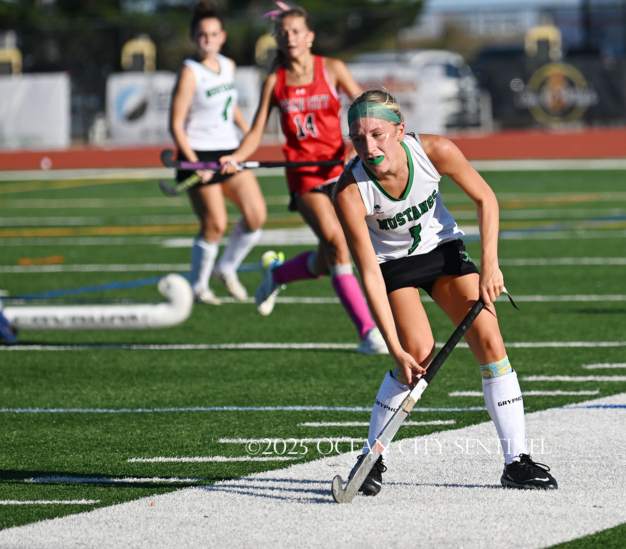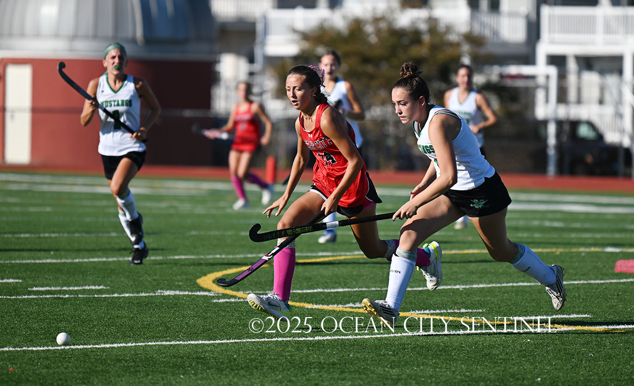OCEAN CITY – At top, Ocean City High School’s Faelyn Clark (No. 17) on the attack in front of the Mainland Mustangs’ net in the annual pink field hockey game at Carey Stadium Oct. 6. Defending are goalie Isabella Saad, who had five saves in the game, and Kate Armstrong. The Raiders won, 8-0. Clark scored on the play and teammate Casey Adamson added four goals. Stevie Wright, Lyla Clark and Marley Dwyer had a goal apiece. Later in the week, the Mustang girls beat Absegami 3-0 with two goals by Addie Scanlon and one by Joey Hemphill.