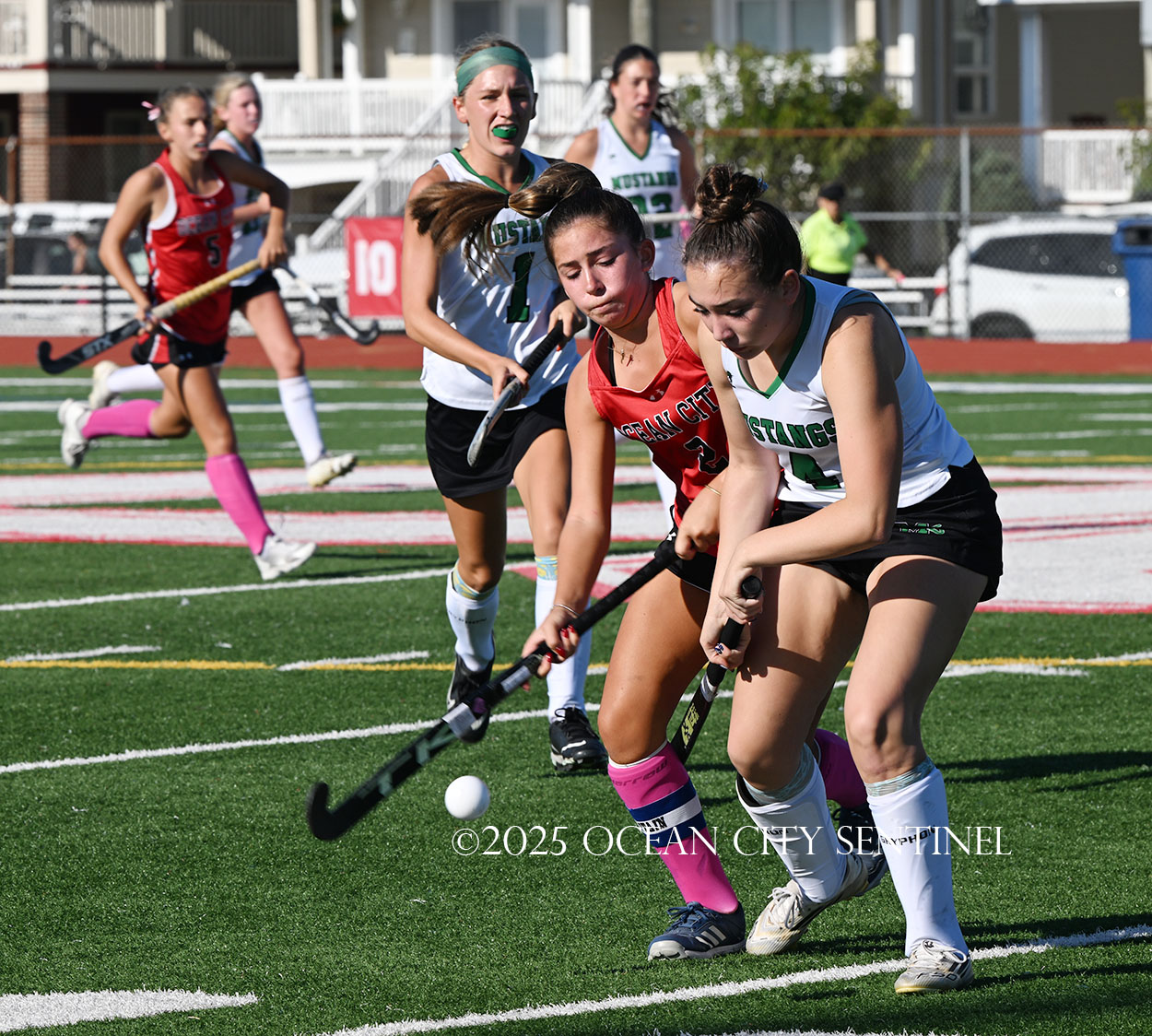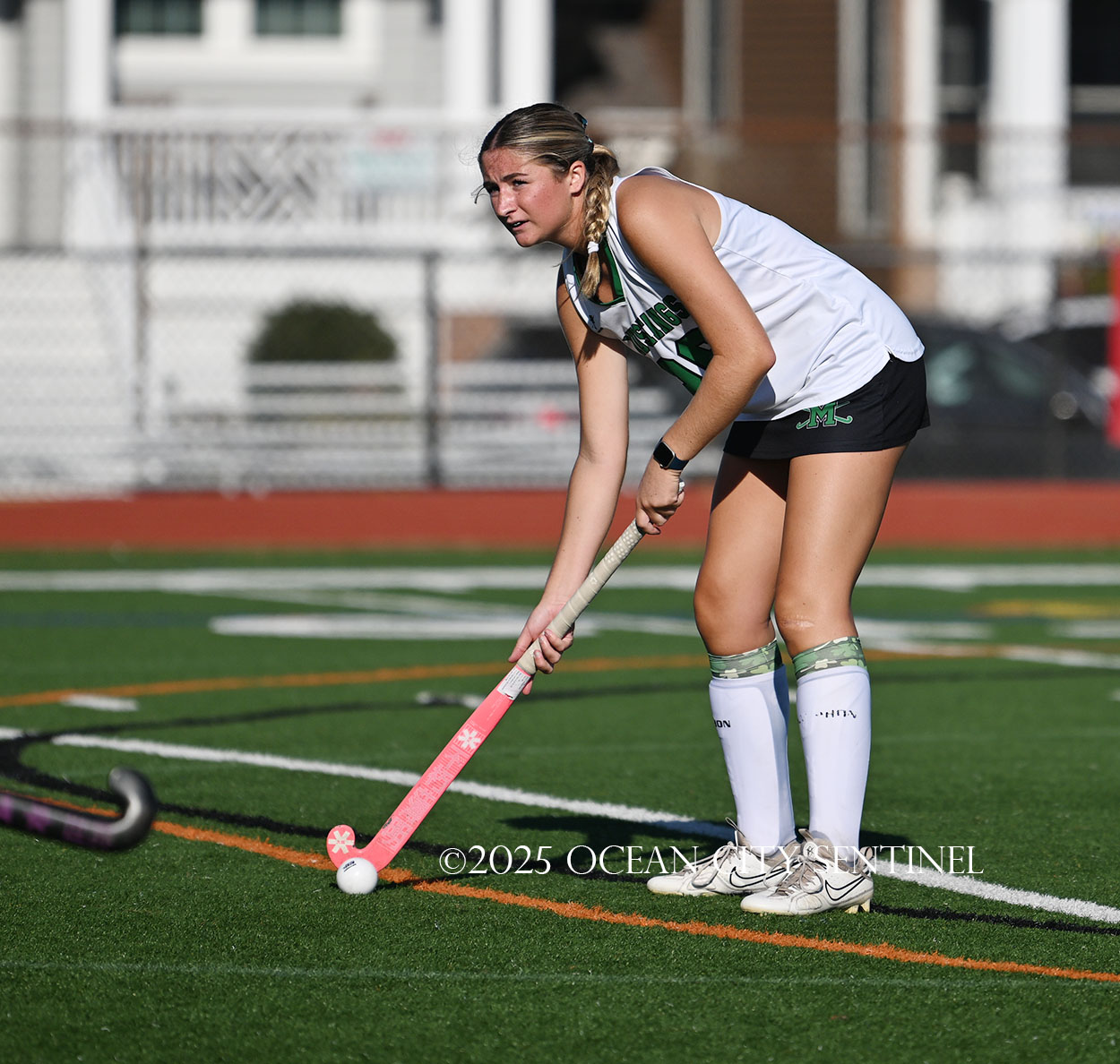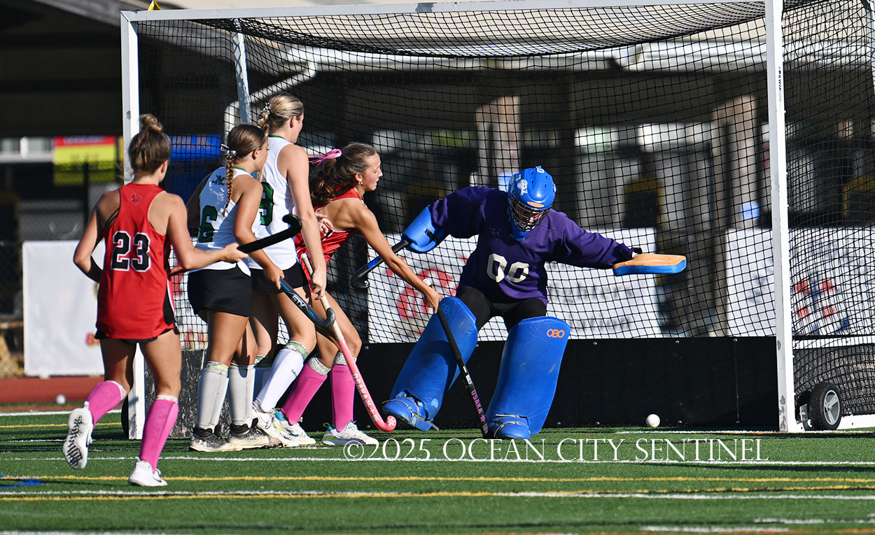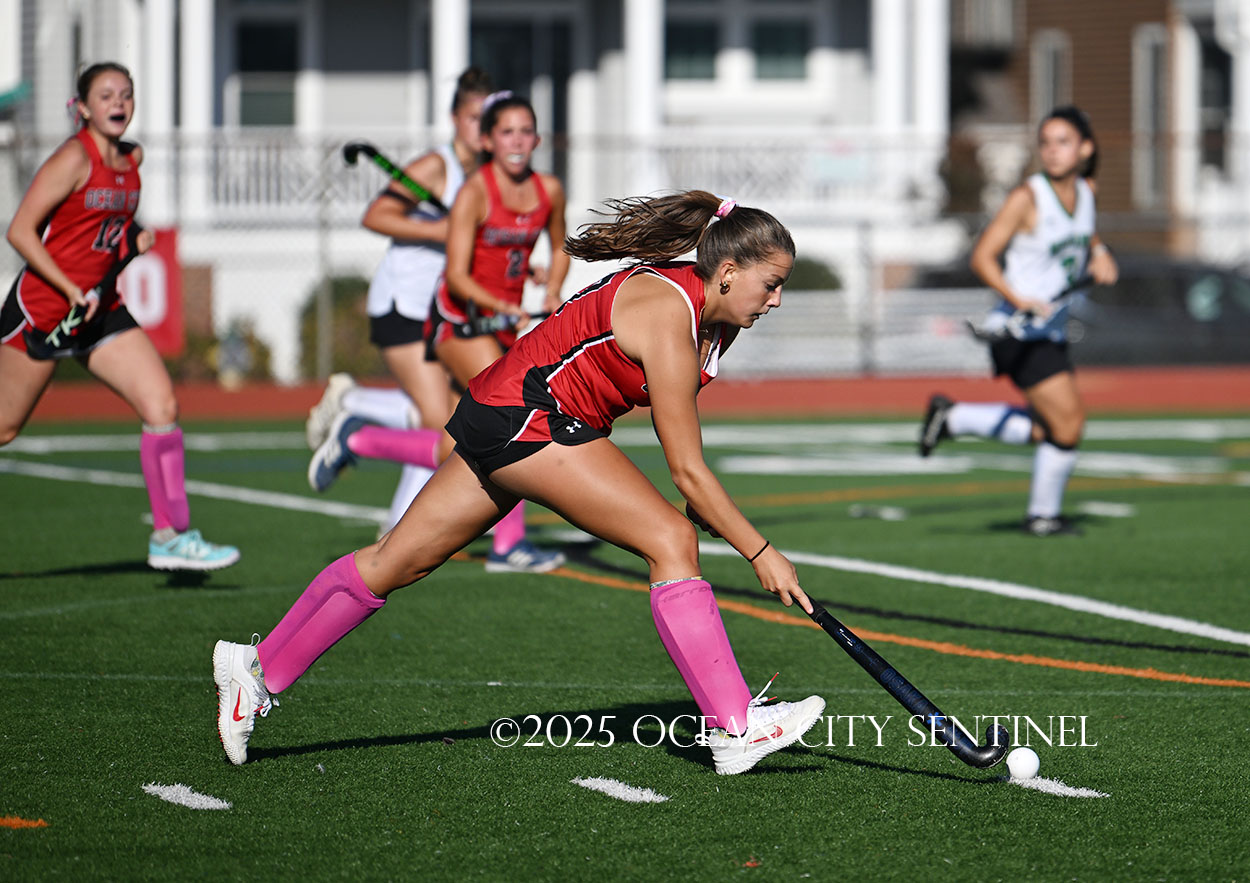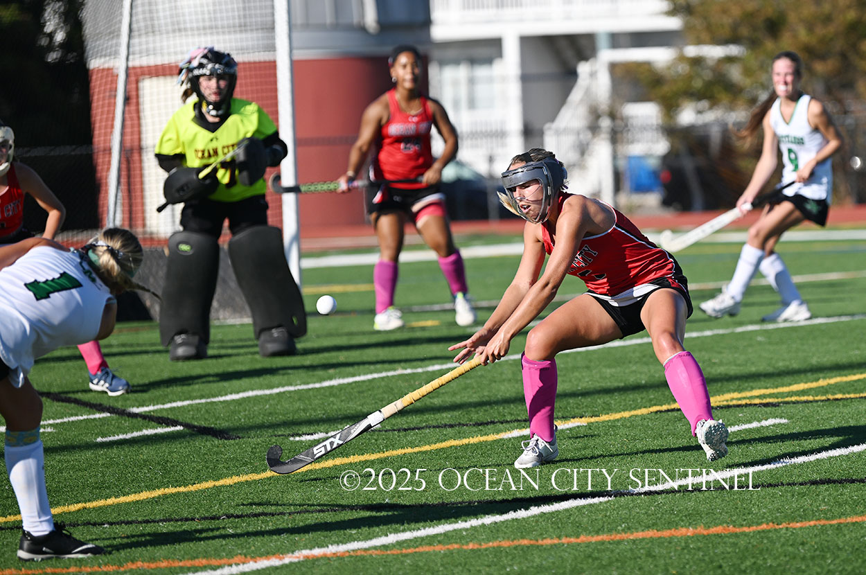 OCEAN CITY – At top, Ocean City High School’s Faelyn Clark (No. 17) on the attack in front of the Mainland Mustangs’ net in the annual pink field hockey game at Carey Stadium Oct. 6. Defending are goalie Isabella Saad, who had five saves in the game, and Kate Armstrong. The Raiders won, 8-0. Clark scored on the play and teammate Casey Adamson added four goals. Stevie Wright, Lyla Clark and Marley Dwyer had a goal apiece. Later in the week, the Mustang girls beat Absegami 3-0 with two goals by Addie Scanlon and one by Joey Hemphill.