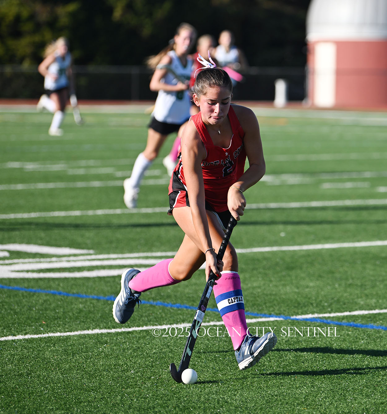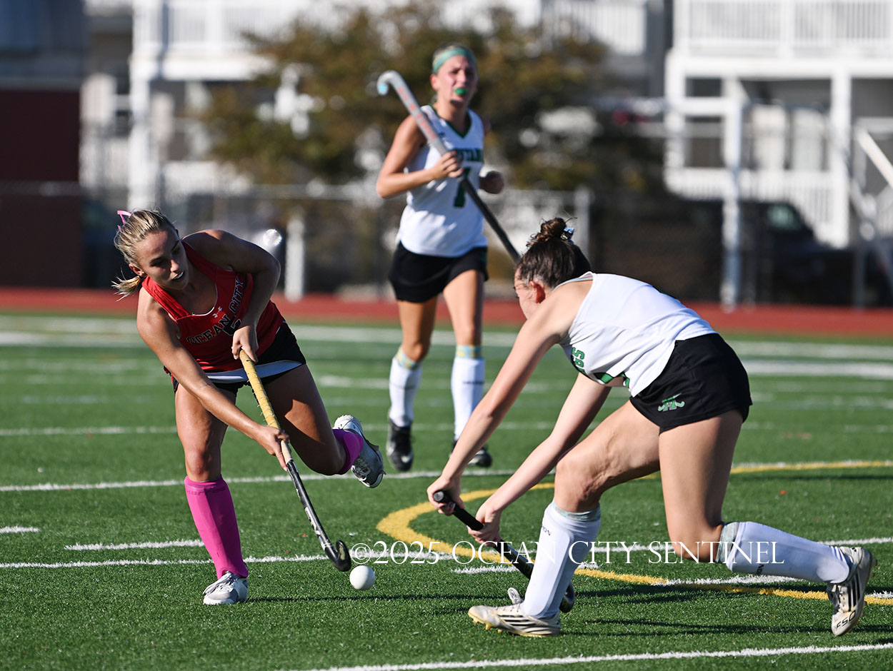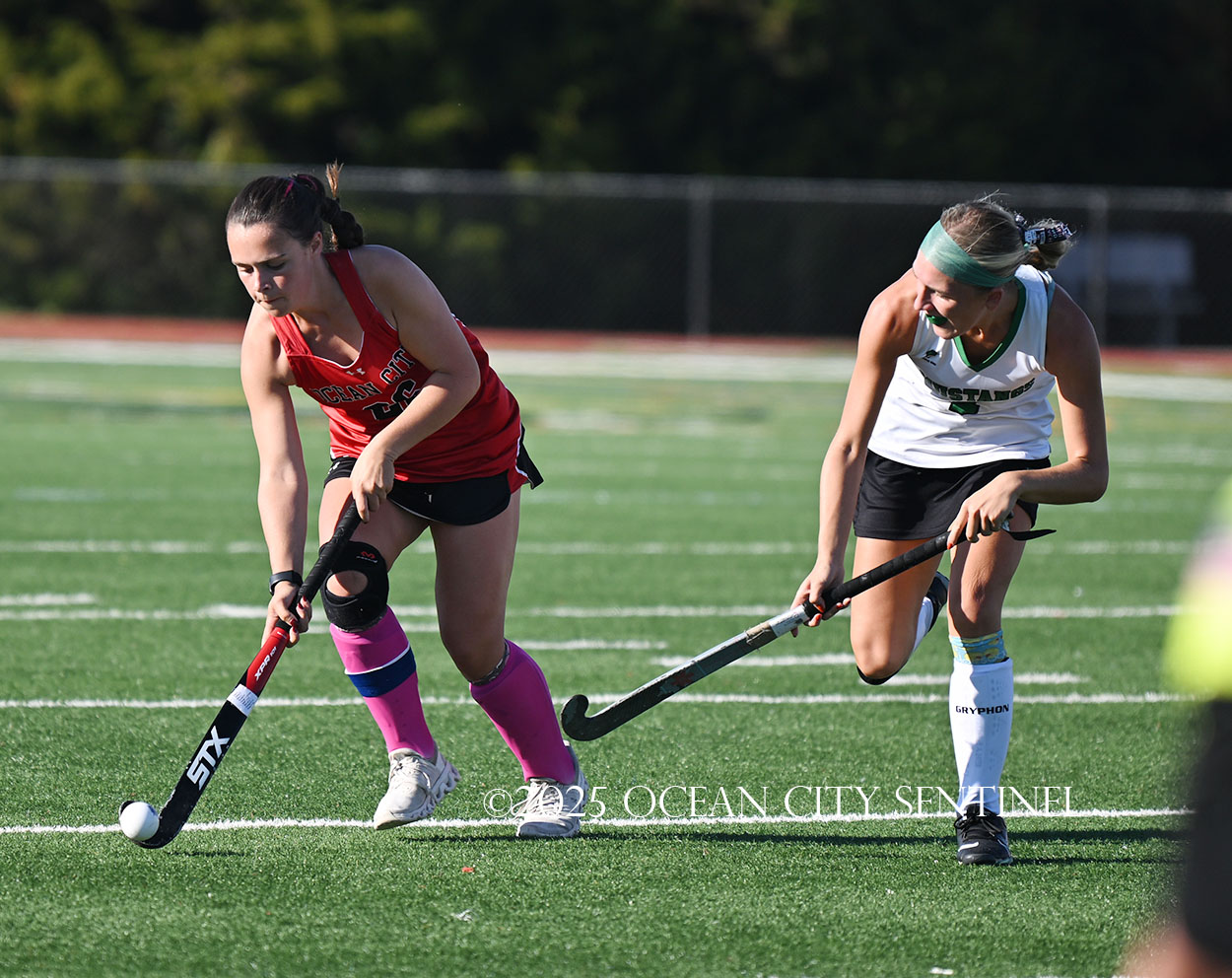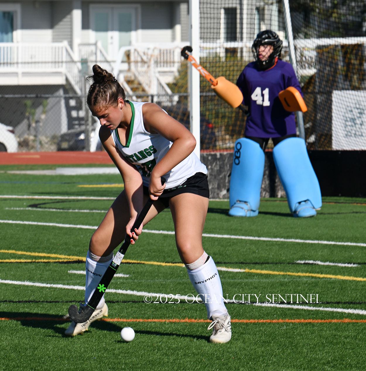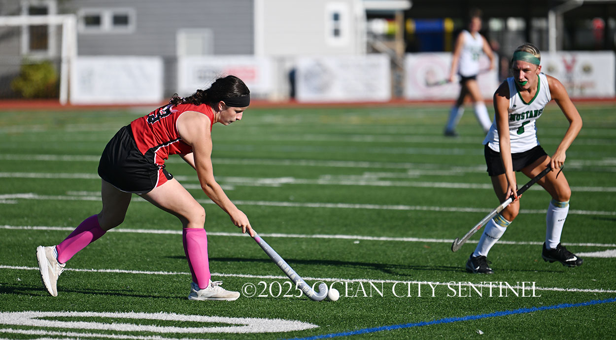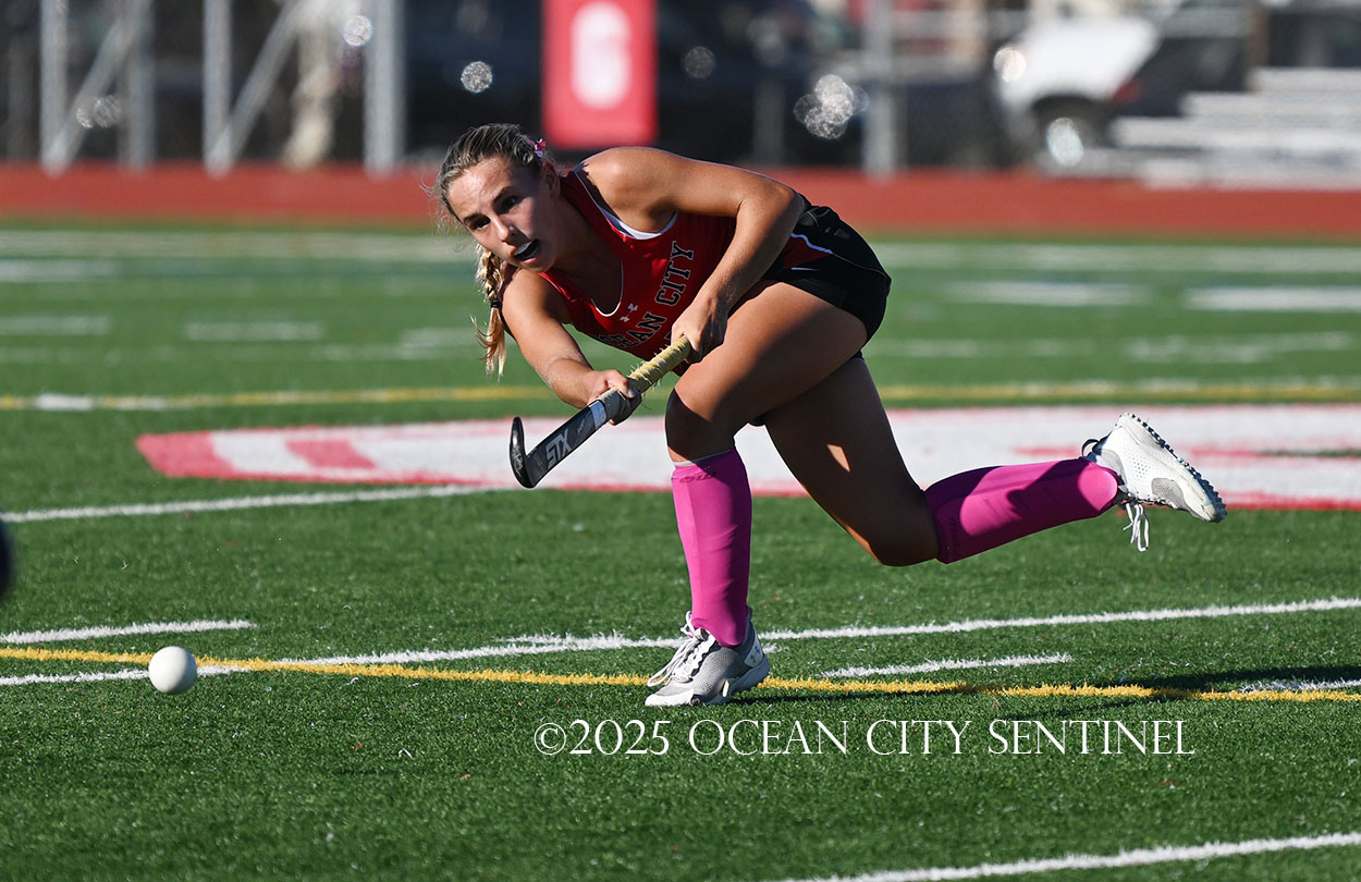 OCEAN CITY – At top, Ocean City High School’s Faelyn Clark (No. 17) on the attack in front of the Mainland Mustangs’ net in the annual pink field hockey game at Carey Stadium Oct. 6. Defending are goalie Isabella Saad, who had five saves in the game, and Kate Armstrong. The Raiders won, 8-0. Clark scored on the play and teammate Casey Adamson added four goals. Stevie Wright, Lyla Clark and Marley Dwyer had a goal apiece. Later in the week, the Mustang girls beat Absegami 3-0 with two goals by Addie Scanlon and one by Joey Hemphill.