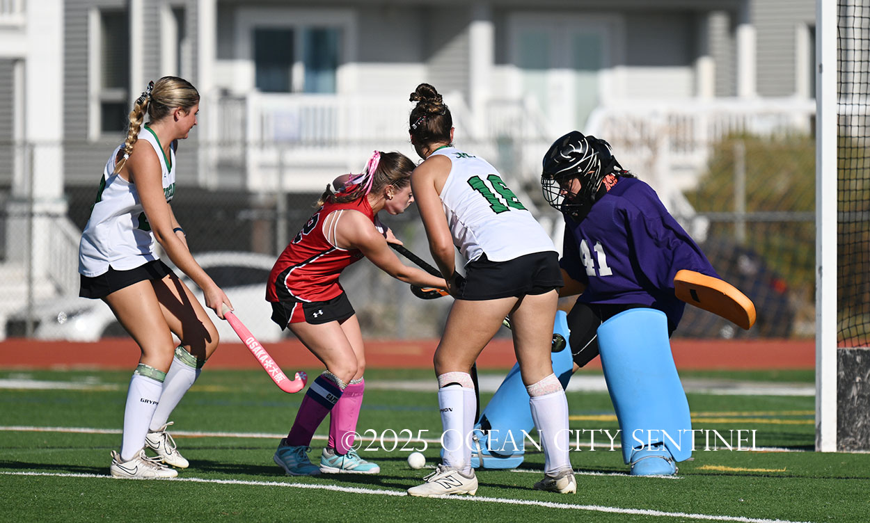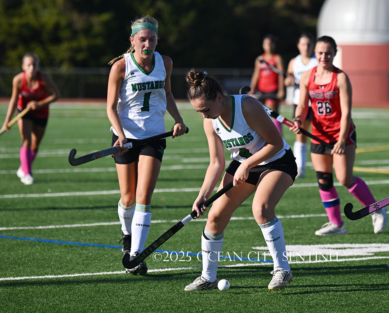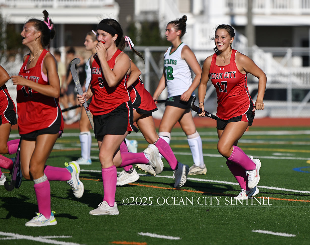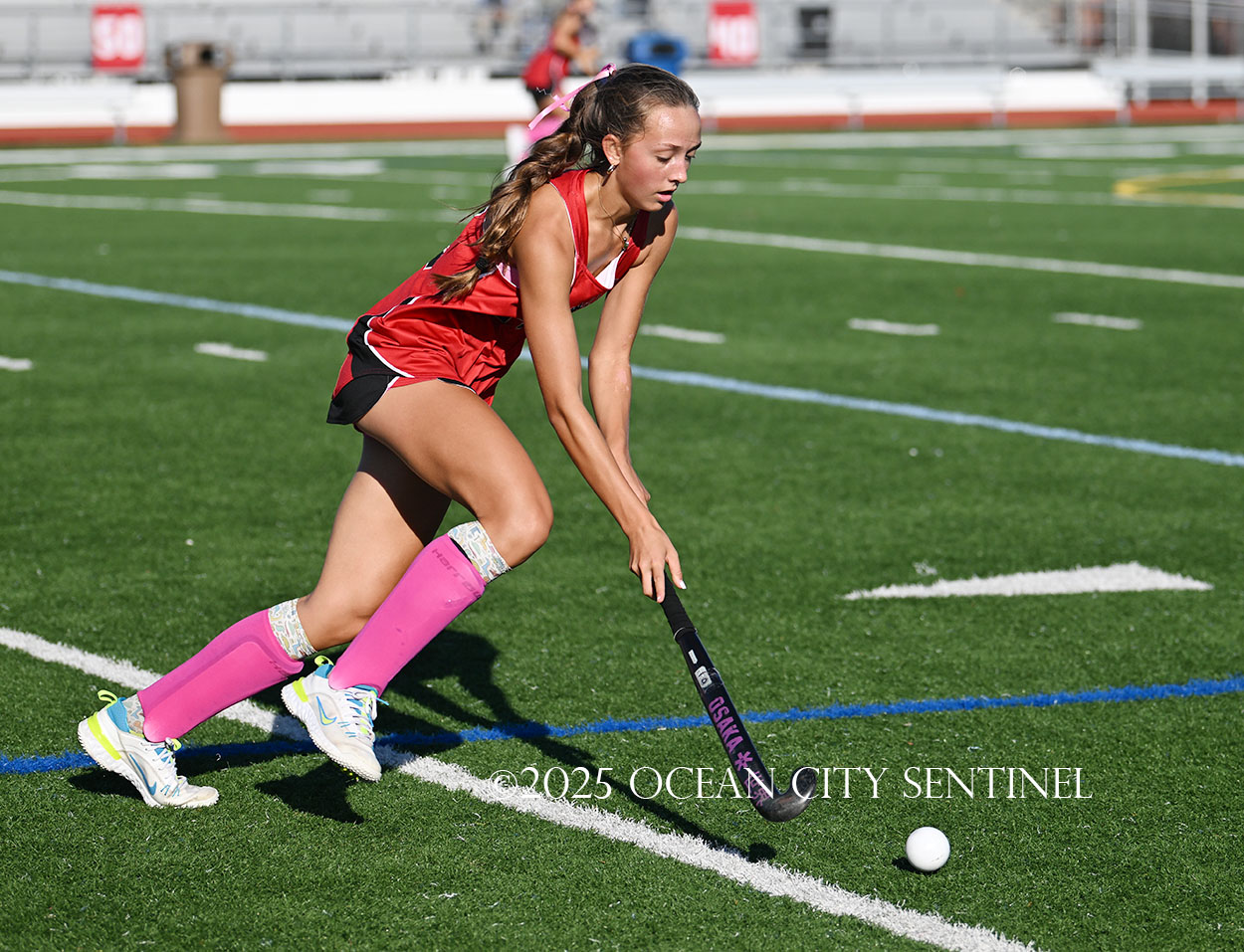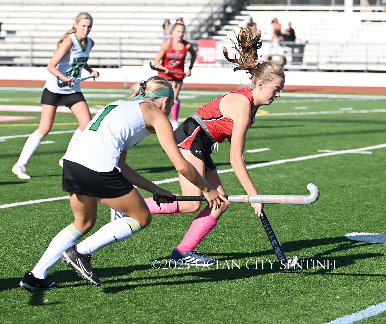 OCEAN CITY – At top, Ocean City High School’s Faelyn Clark (No. 17) on the attack in front of the Mainland Mustangs’ net in the annual pink field hockey game at Carey Stadium Oct. 6. Defending are goalie Isabella Saad, who had five saves in the game, and Kate Armstrong. The Raiders won, 8-0. Clark scored on the play and teammate Casey Adamson added four goals. Stevie Wright, Lyla Clark and Marley Dwyer had a goal apiece. Later in the week, the Mustang girls beat Absegami 3-0 with two goals by Addie Scanlon and one by Joey Hemphill.