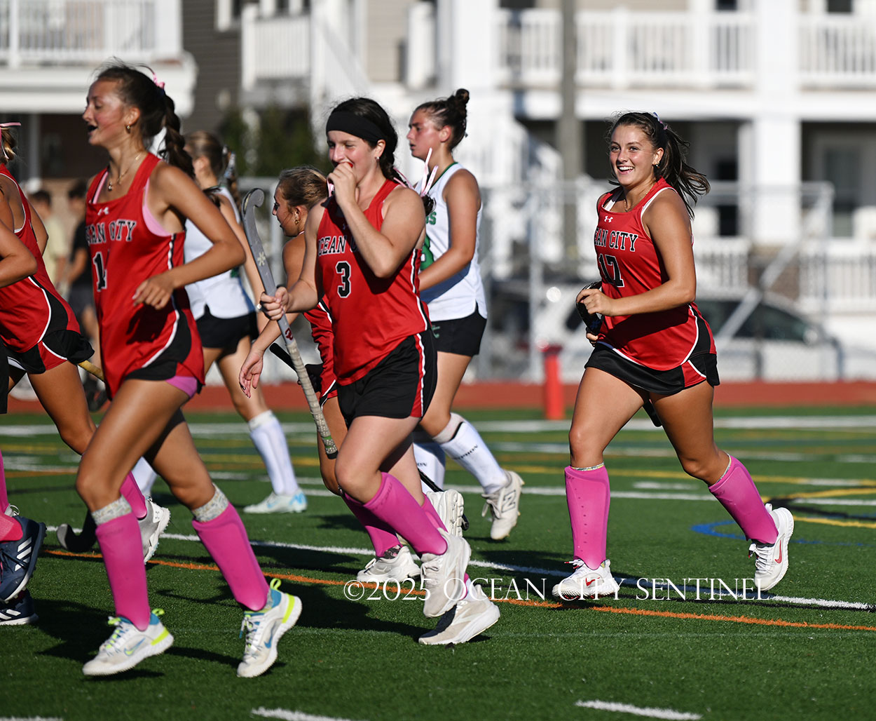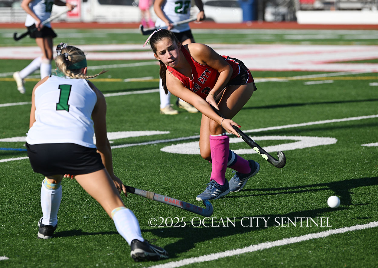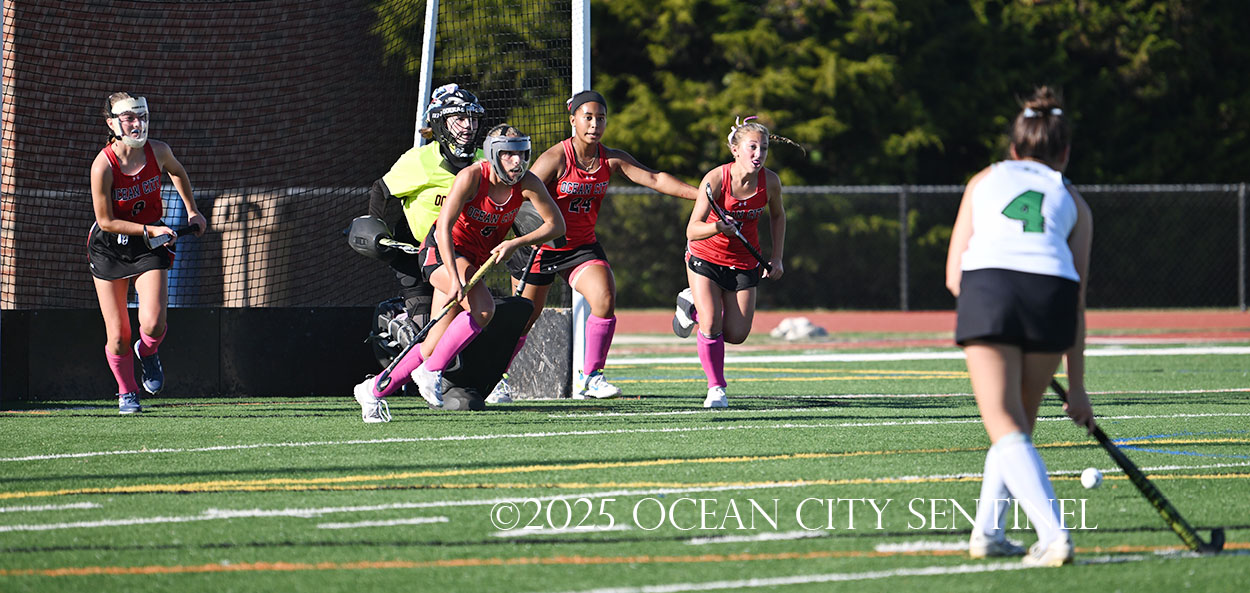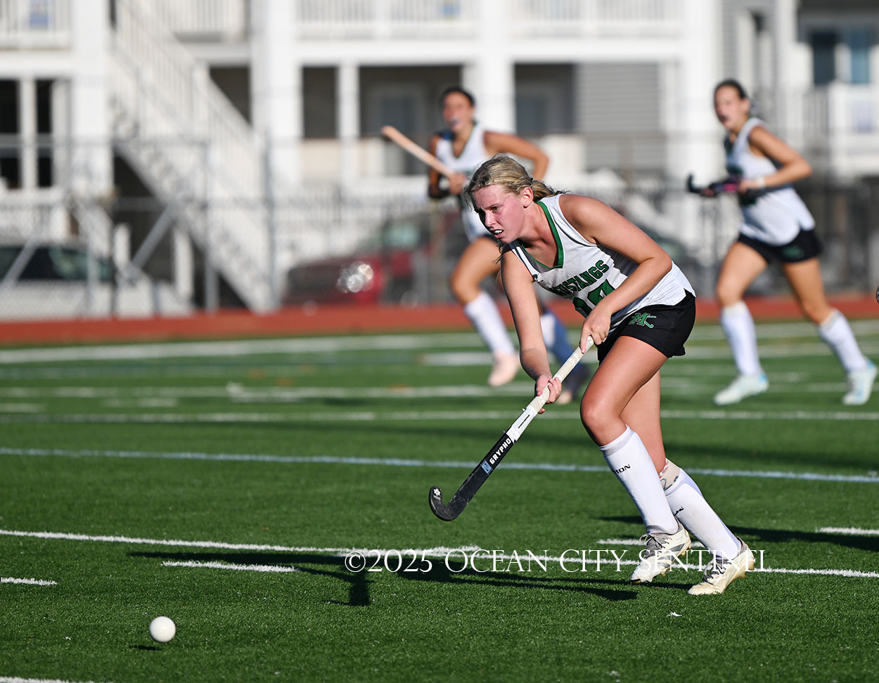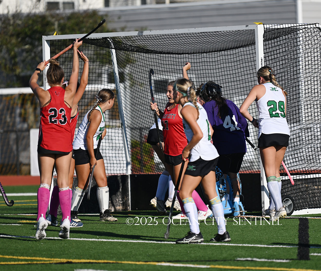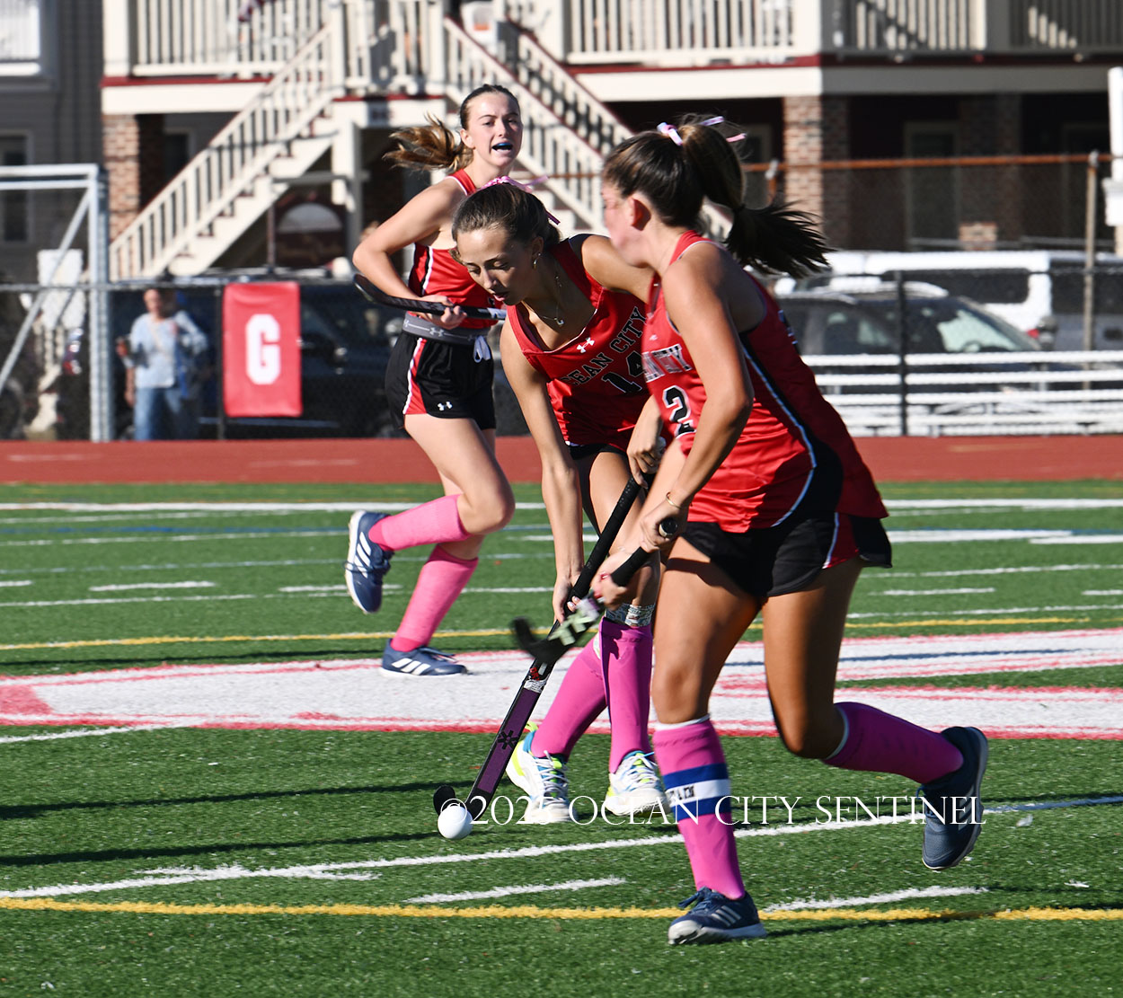 OCEAN CITY – At top, Ocean City High School’s Faelyn Clark (No. 17) on the attack in front of the Mainland Mustangs’ net in the annual pink field hockey game at Carey Stadium Oct. 6. Defending are goalie Isabella Saad, who had five saves in the game, and Kate Armstrong. The Raiders won, 8-0. Clark scored on the play and teammate Casey Adamson added four goals. Stevie Wright, Lyla Clark and Marley Dwyer had a goal apiece. Later in the week, the Mustang girls beat Absegami 3-0 with two goals by Addie Scanlon and one by Joey Hemphill.