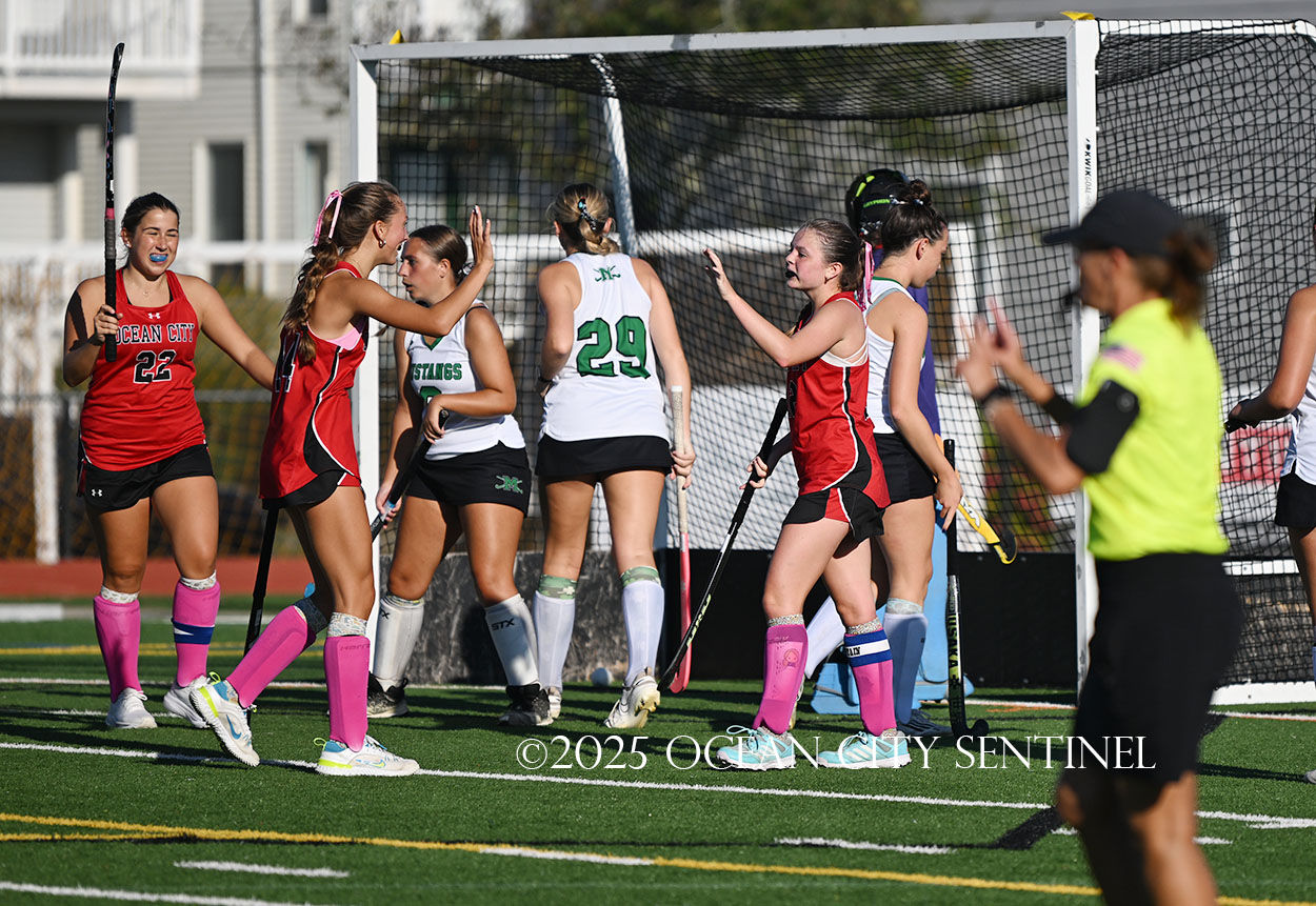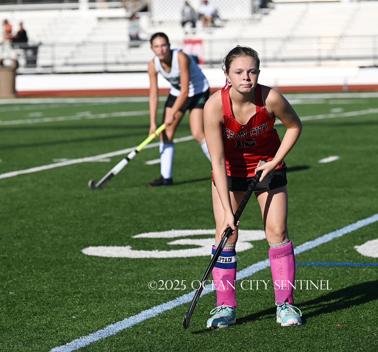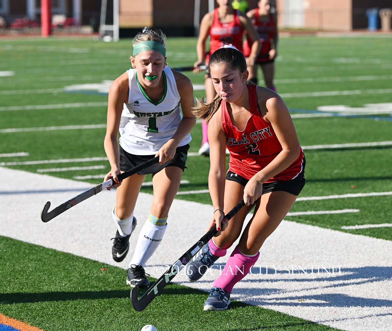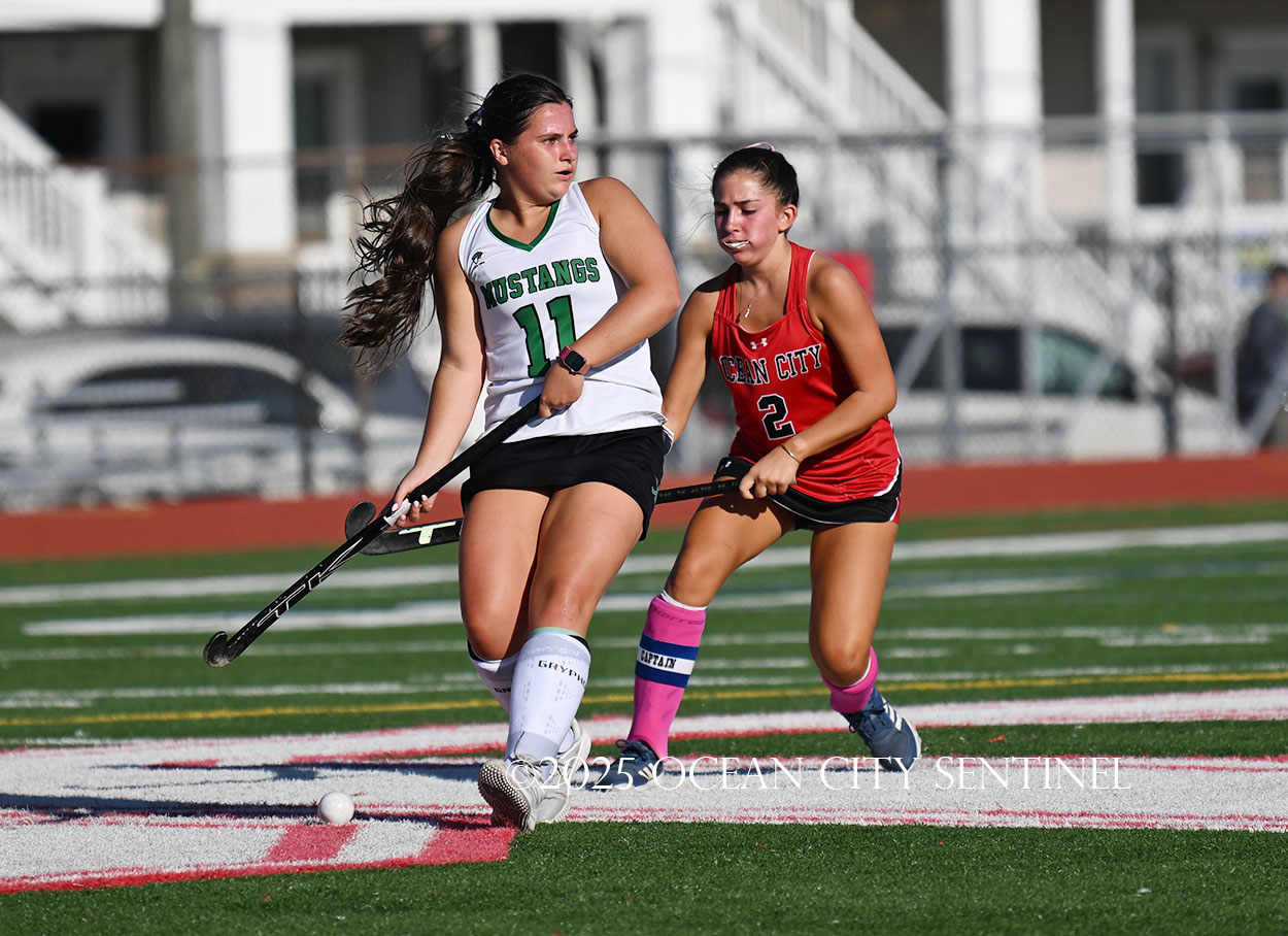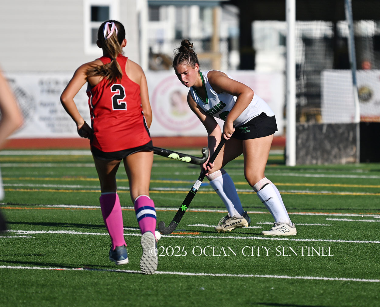 OCEAN CITY – At top, Ocean City High School’s Faelyn Clark (No. 17) on the attack in front of the Mainland Mustangs’ net in the annual pink field hockey game at Carey Stadium Oct. 6. Defending are goalie Isabella Saad, who had five saves in the game, and Kate Armstrong. The Raiders won, 8-0. Clark scored on the play and teammate Casey Adamson added four goals. Stevie Wright, Lyla Clark and Marley Dwyer had a goal apiece. Later in the week, the Mustang girls beat Absegami 3-0 with two goals by Addie Scanlon and one by Joey Hemphill.