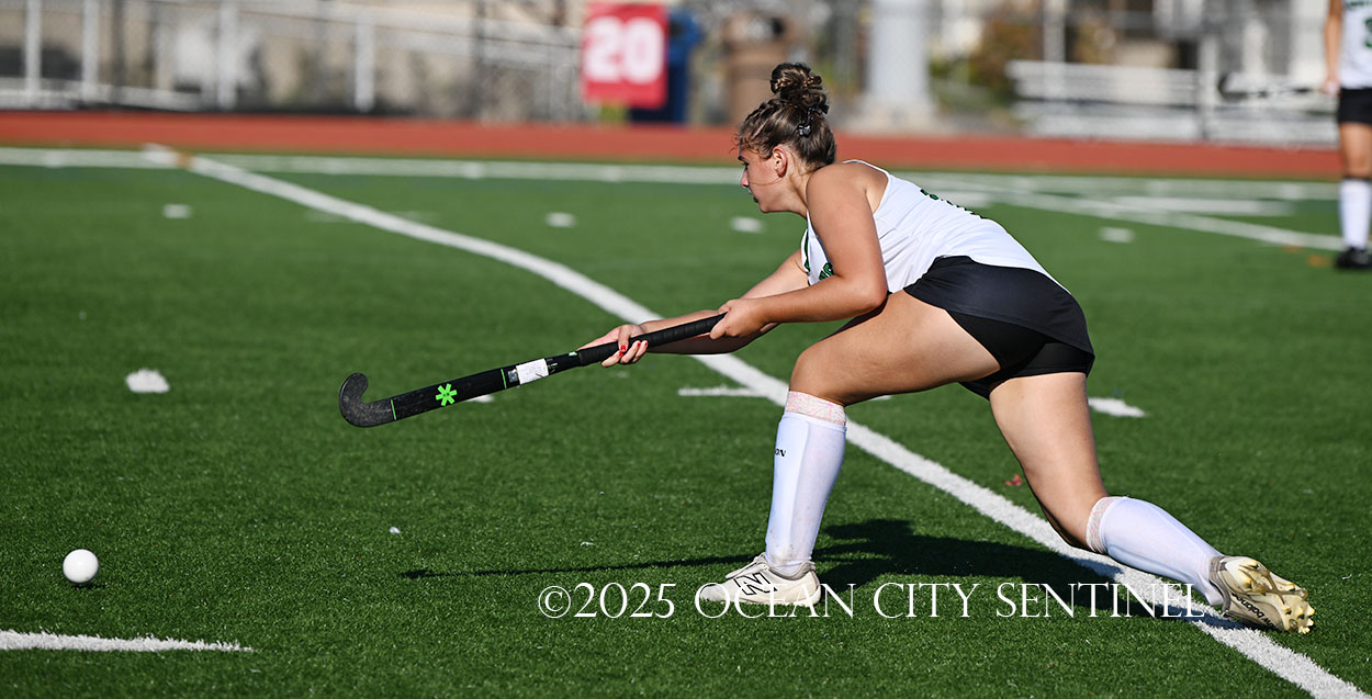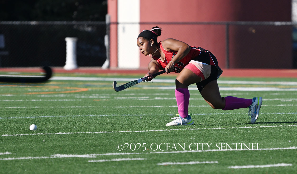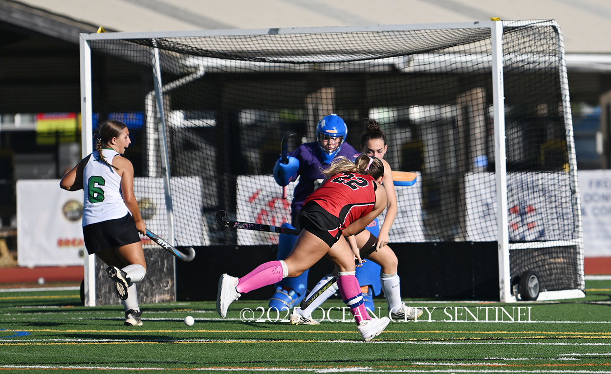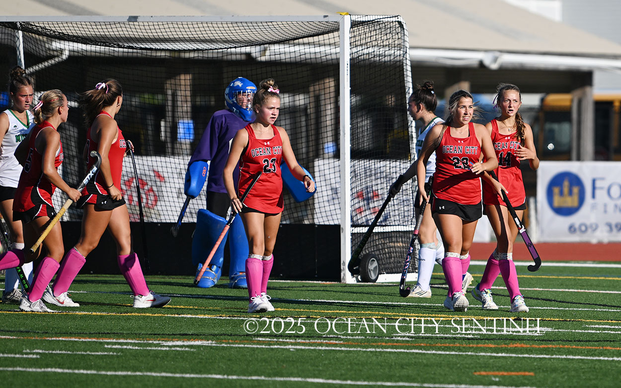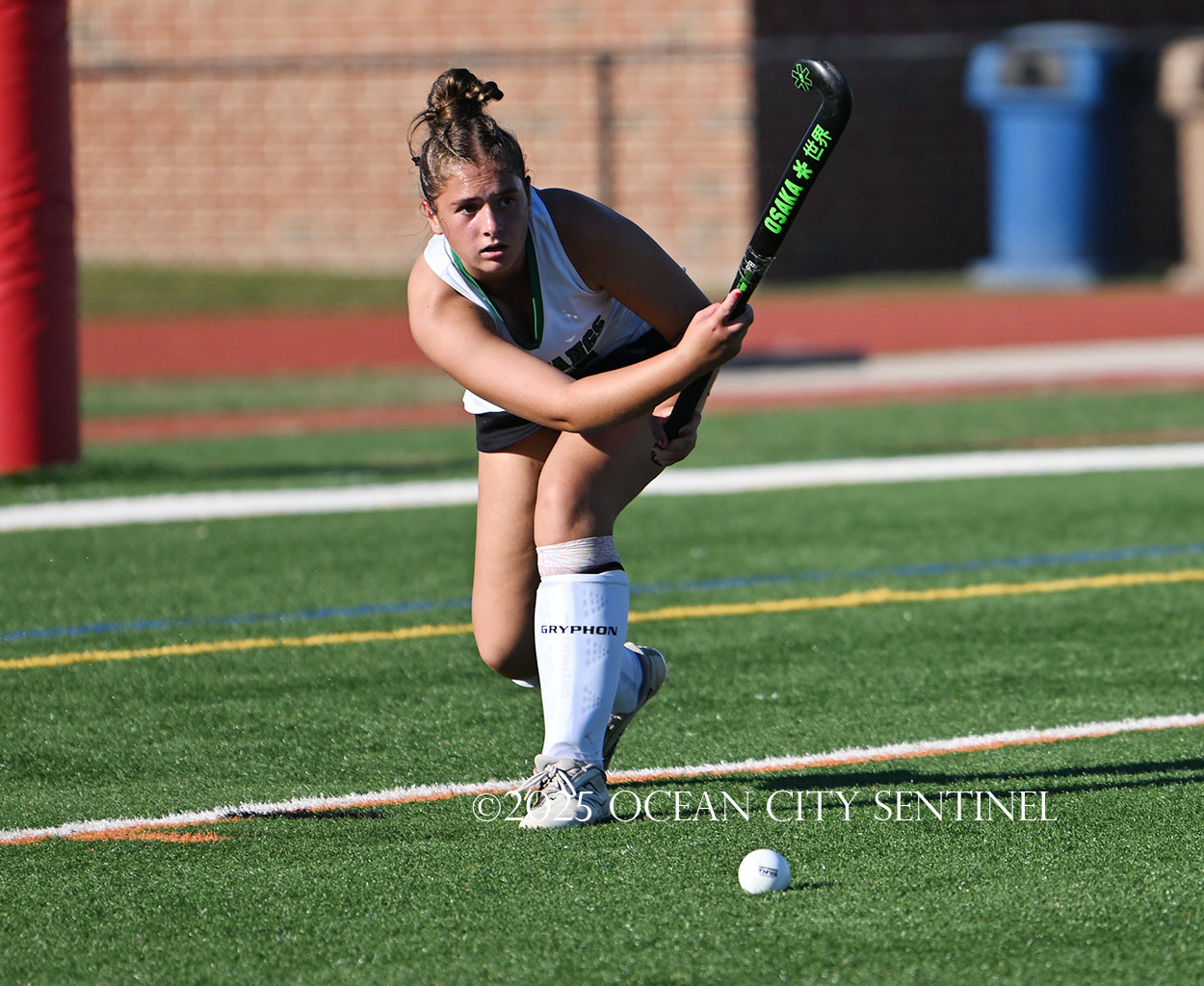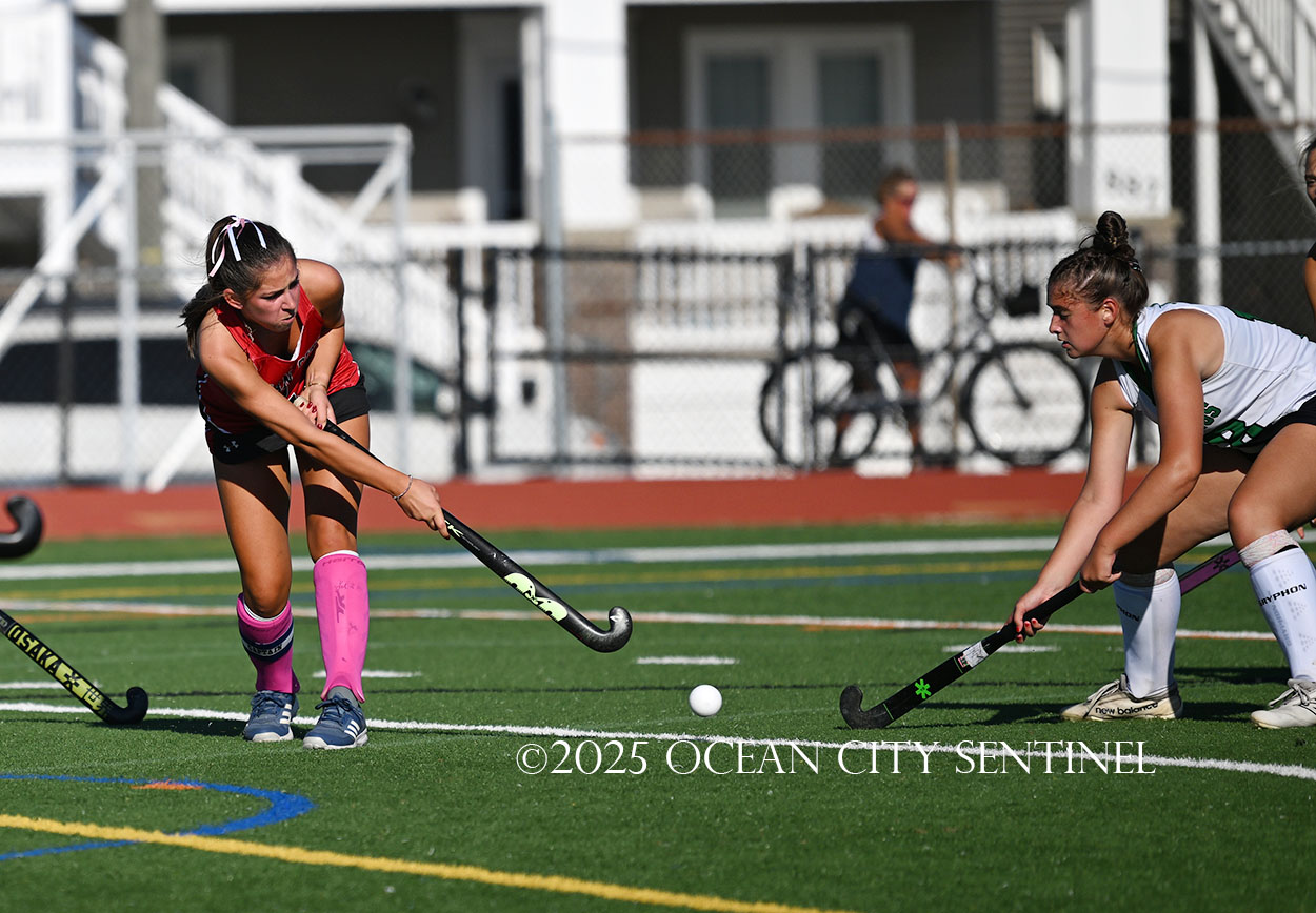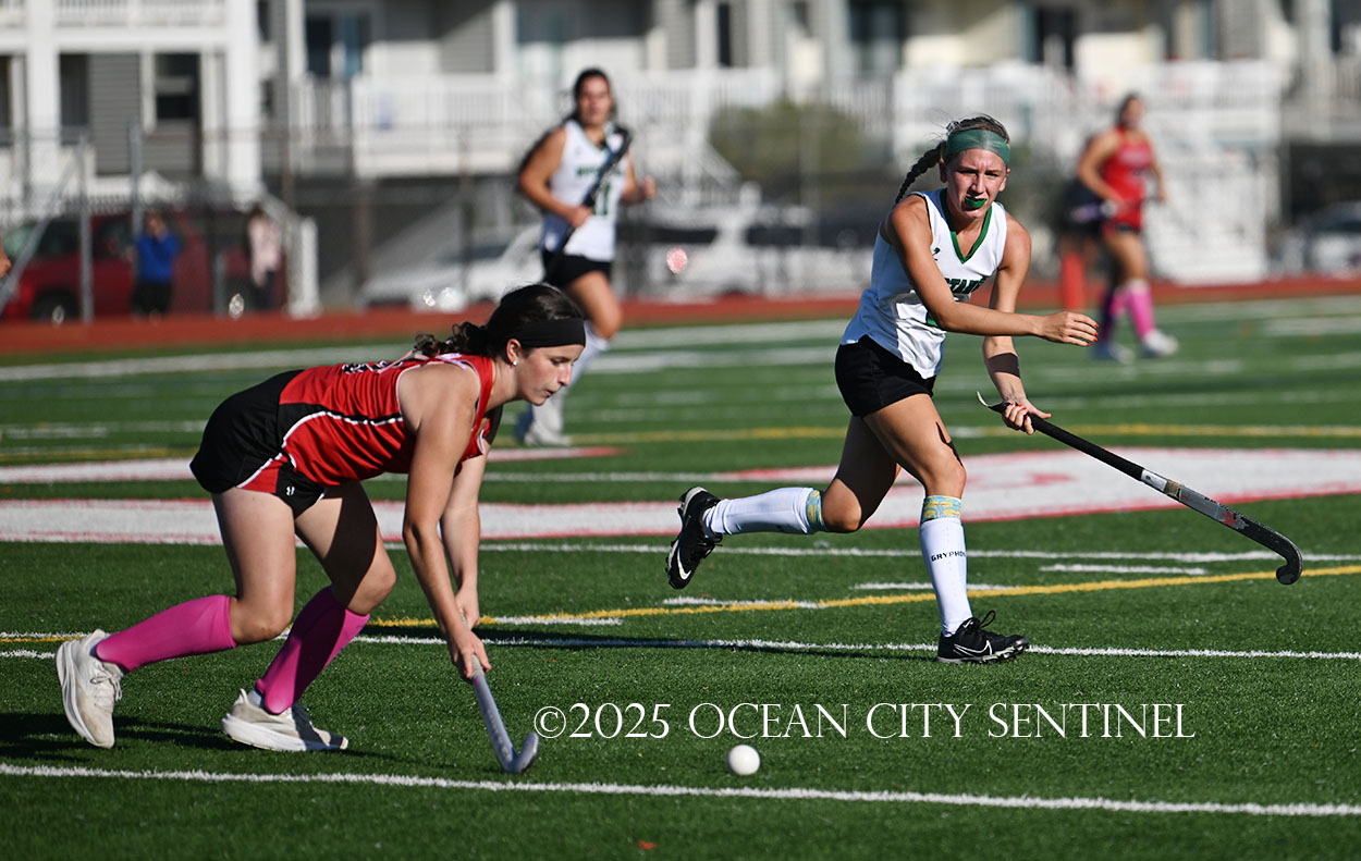 OCEAN CITY – At top, Ocean City High School’s Faelyn Clark (No. 17) on the attack in front of the Mainland Mustangs’ net in the annual pink field hockey game at Carey Stadium Oct. 6. Defending are goalie Isabella Saad, who had five saves in the game, and Kate Armstrong. The Raiders won, 8-0. Clark scored on the play and teammate Casey Adamson added four goals. Stevie Wright, Lyla Clark and Marley Dwyer had a goal apiece. Later in the week, the Mustang girls beat Absegami 3-0 with two goals by Addie Scanlon and one by Joey Hemphill.
