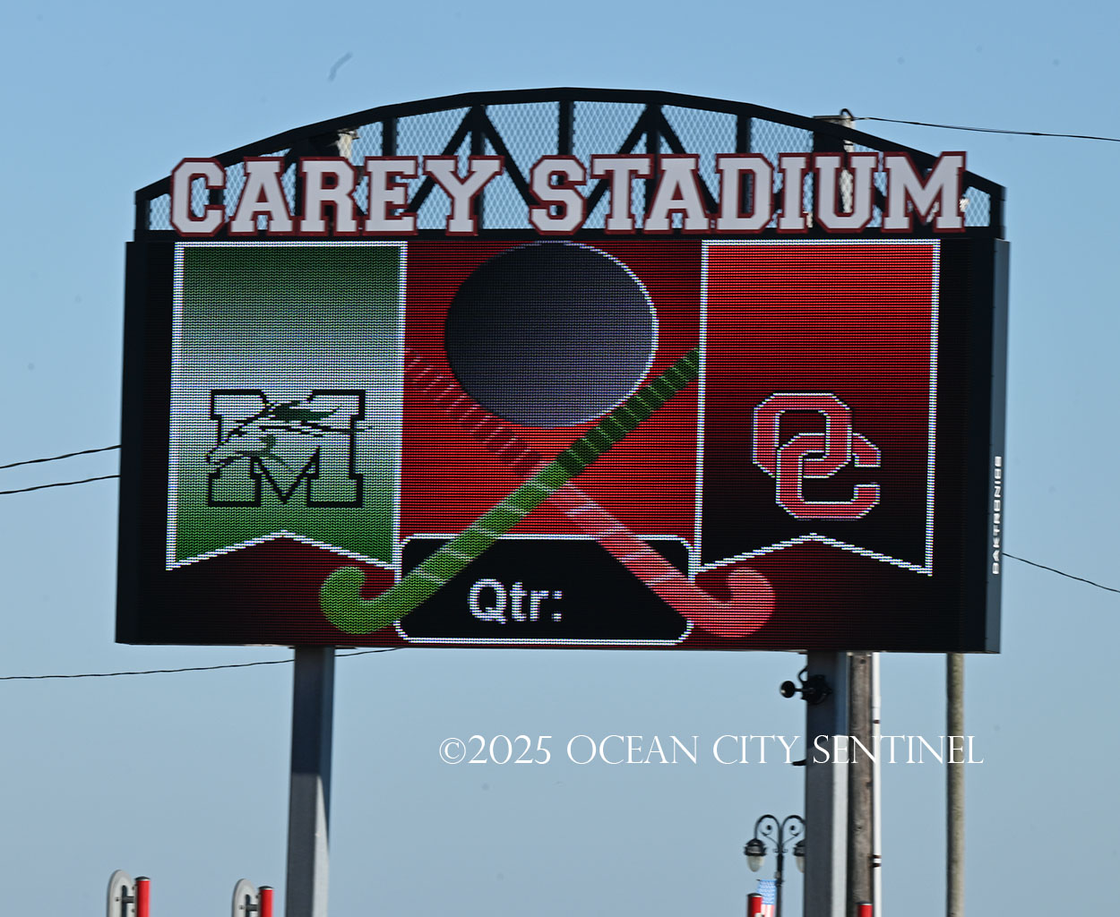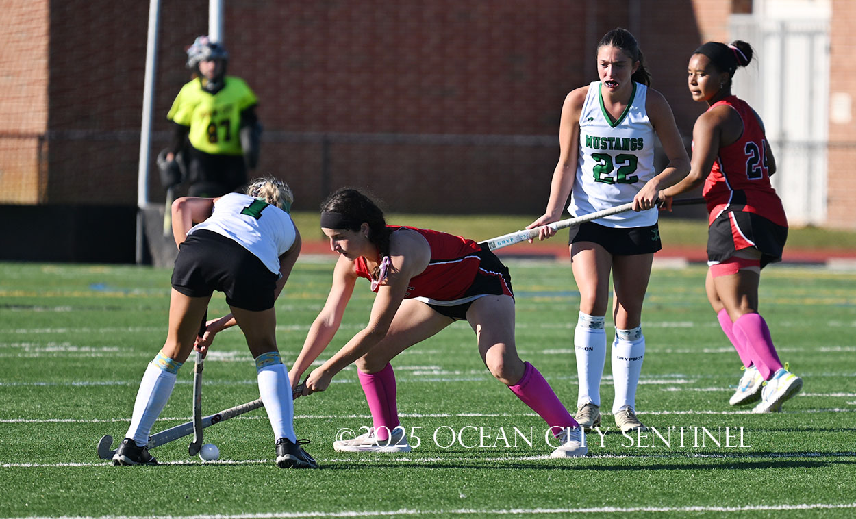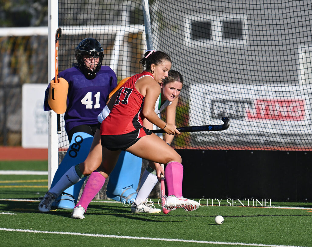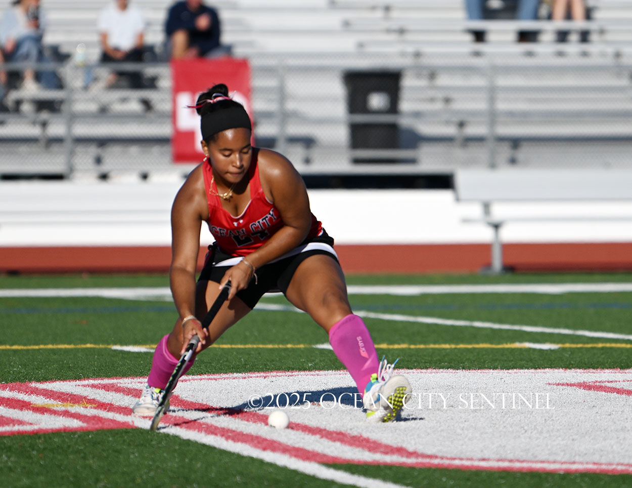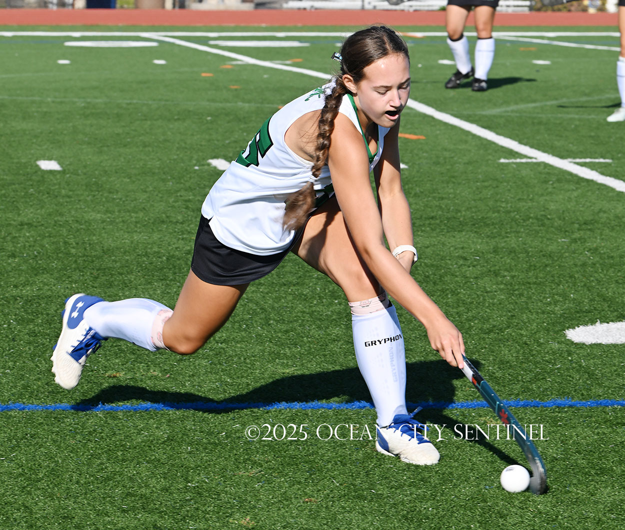 OCEAN CITY – At top, Ocean City High School’s Faelyn Clark (No. 17) on the attack in front of the Mainland Mustangs’ net in the annual pink field hockey game at Carey Stadium Oct. 6. Defending are goalie Isabella Saad, who had five saves in the game, and Kate Armstrong. The Raiders won, 8-0. Clark scored on the play and teammate Casey Adamson added four goals. Stevie Wright, Lyla Clark and Marley Dwyer had a goal apiece. Later in the week, the Mustang girls beat Absegami 3-0 with two goals by Addie Scanlon and one by Joey Hemphill.
