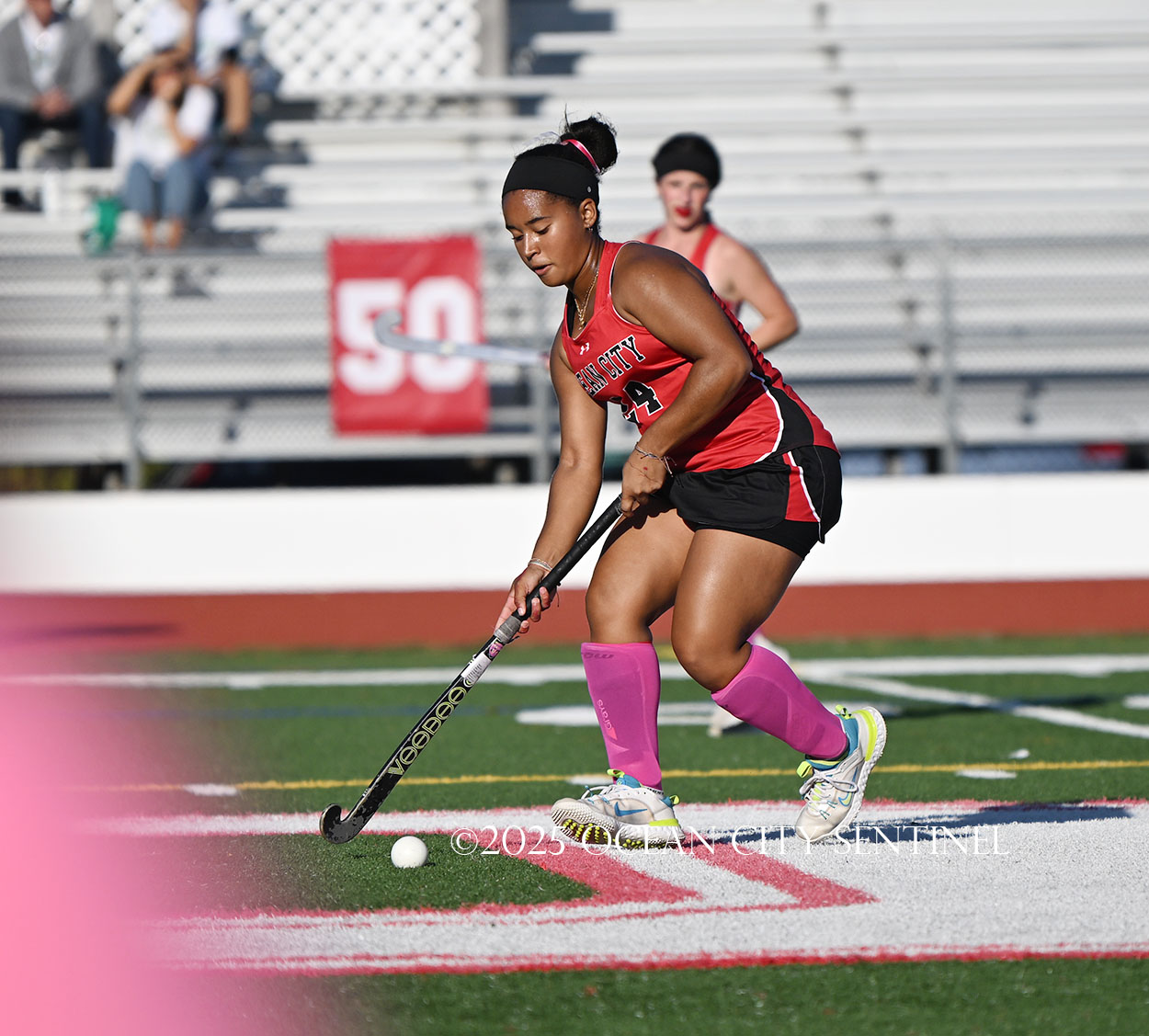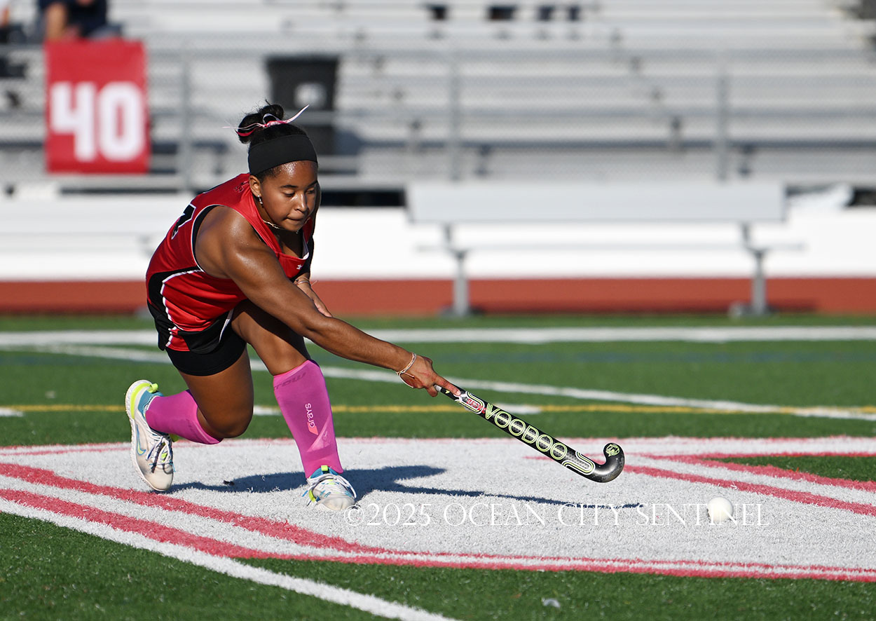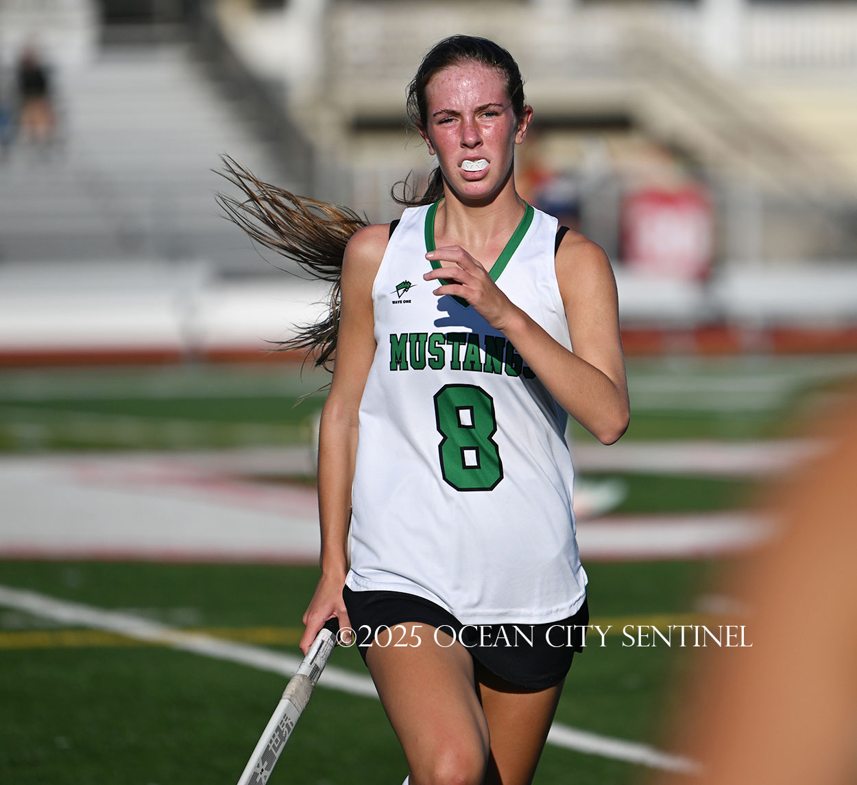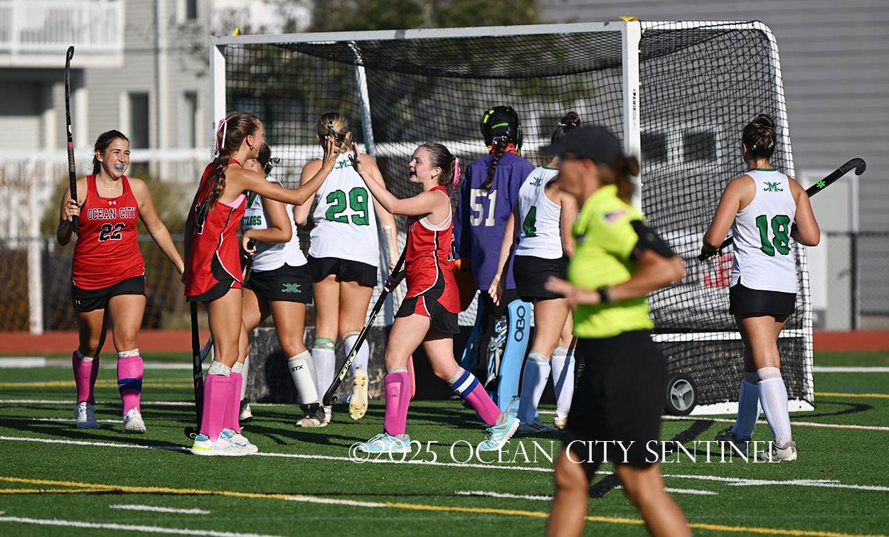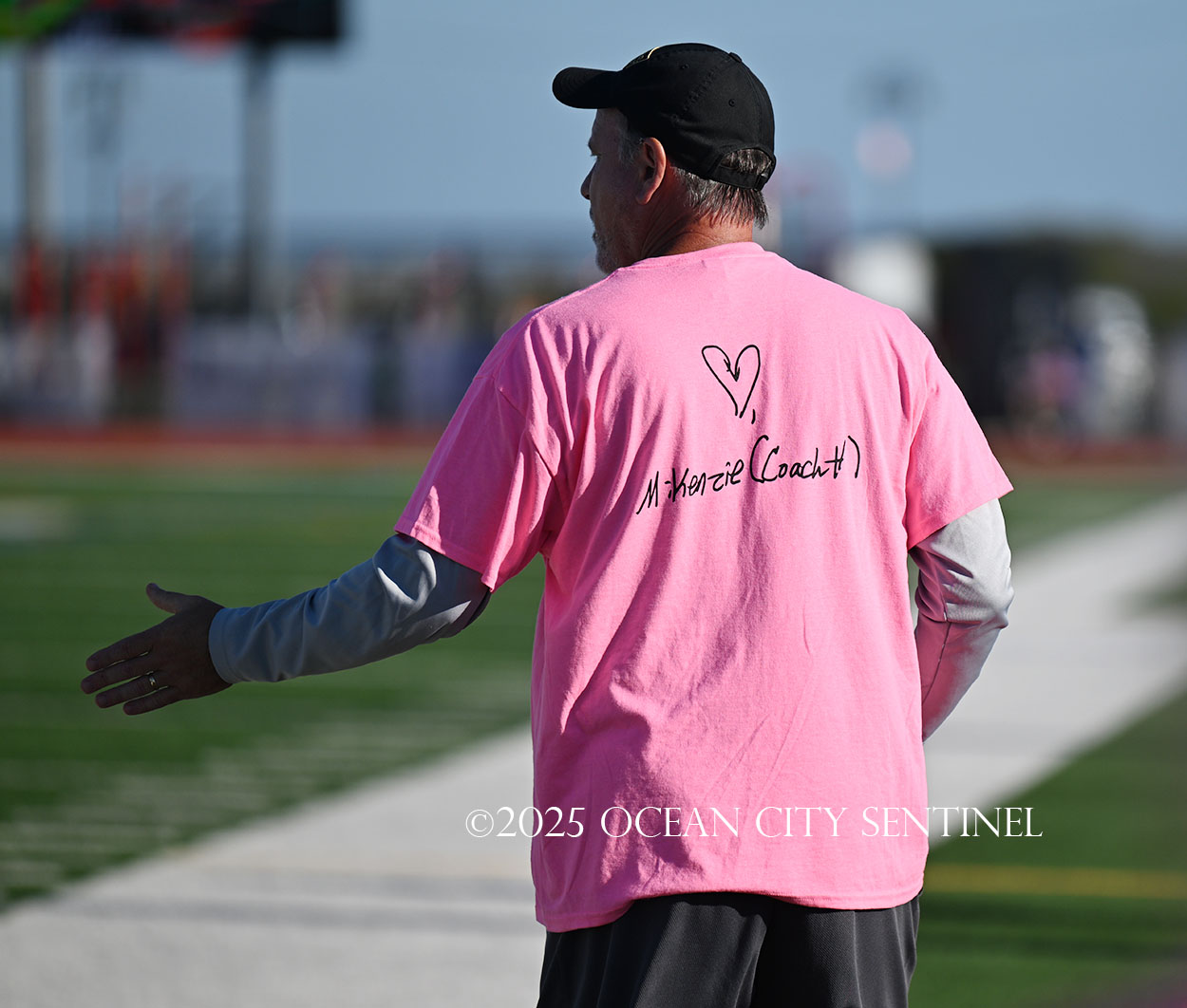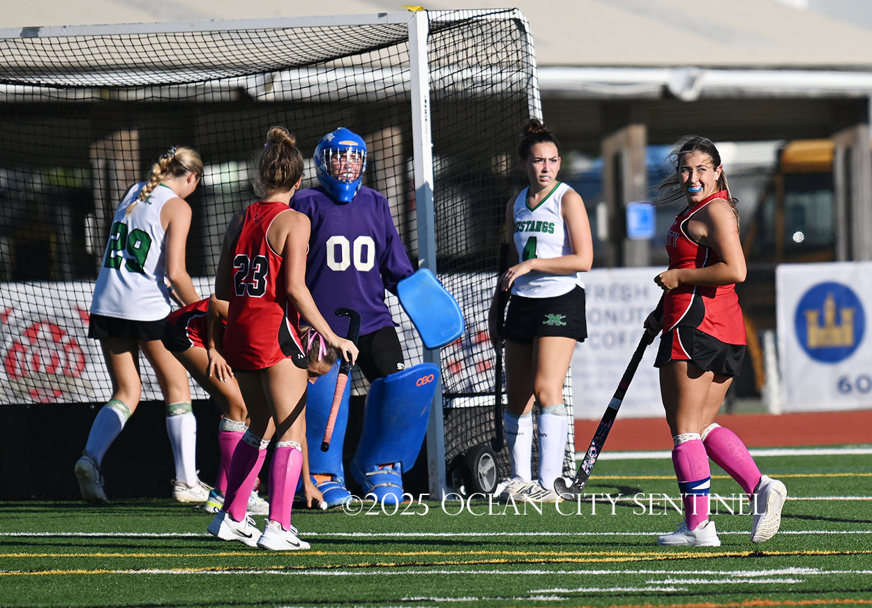 OCEAN CITY – At top, Ocean City High School’s Faelyn Clark (No. 17) on the attack in front of the Mainland Mustangs’ net in the annual pink field hockey game at Carey Stadium Oct. 6. Defending are goalie Isabella Saad, who had five saves in the game, and Kate Armstrong. The Raiders won, 8-0. Clark scored on the play and teammate Casey Adamson added four goals. Stevie Wright, Lyla Clark and Marley Dwyer had a goal apiece. Later in the week, the Mustang girls beat Absegami 3-0 with two goals by Addie Scanlon and one by Joey Hemphill.