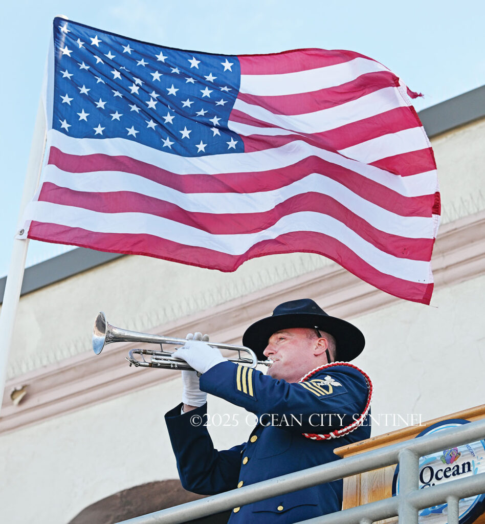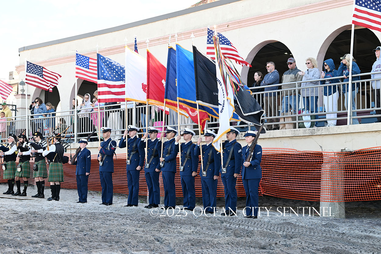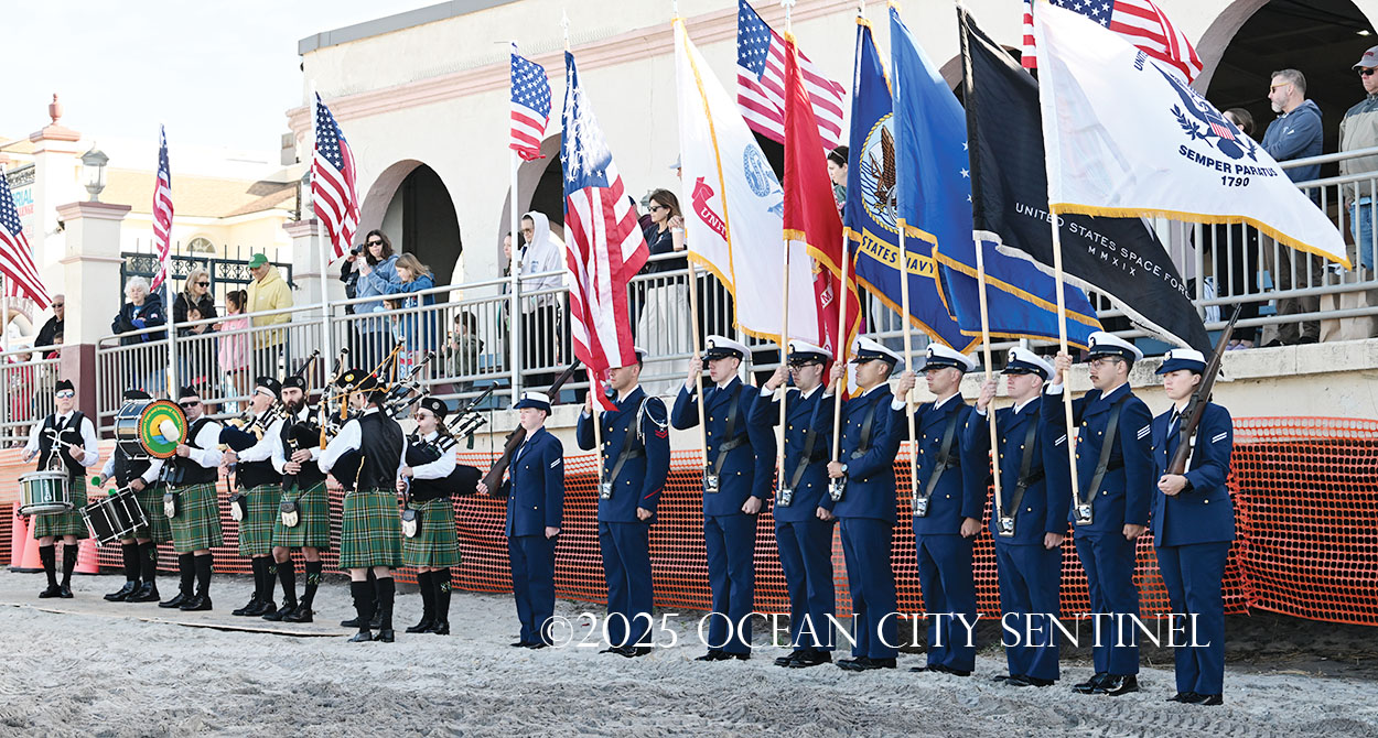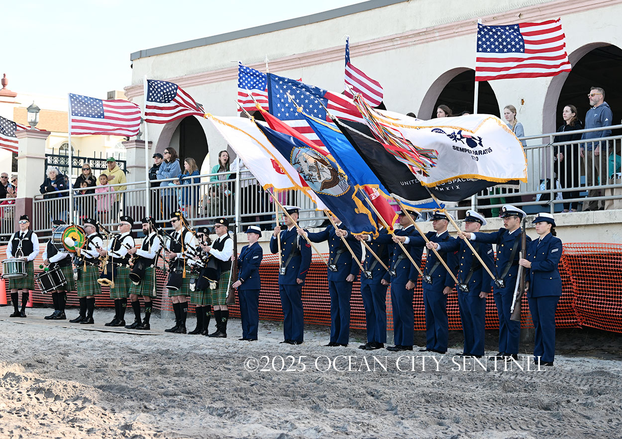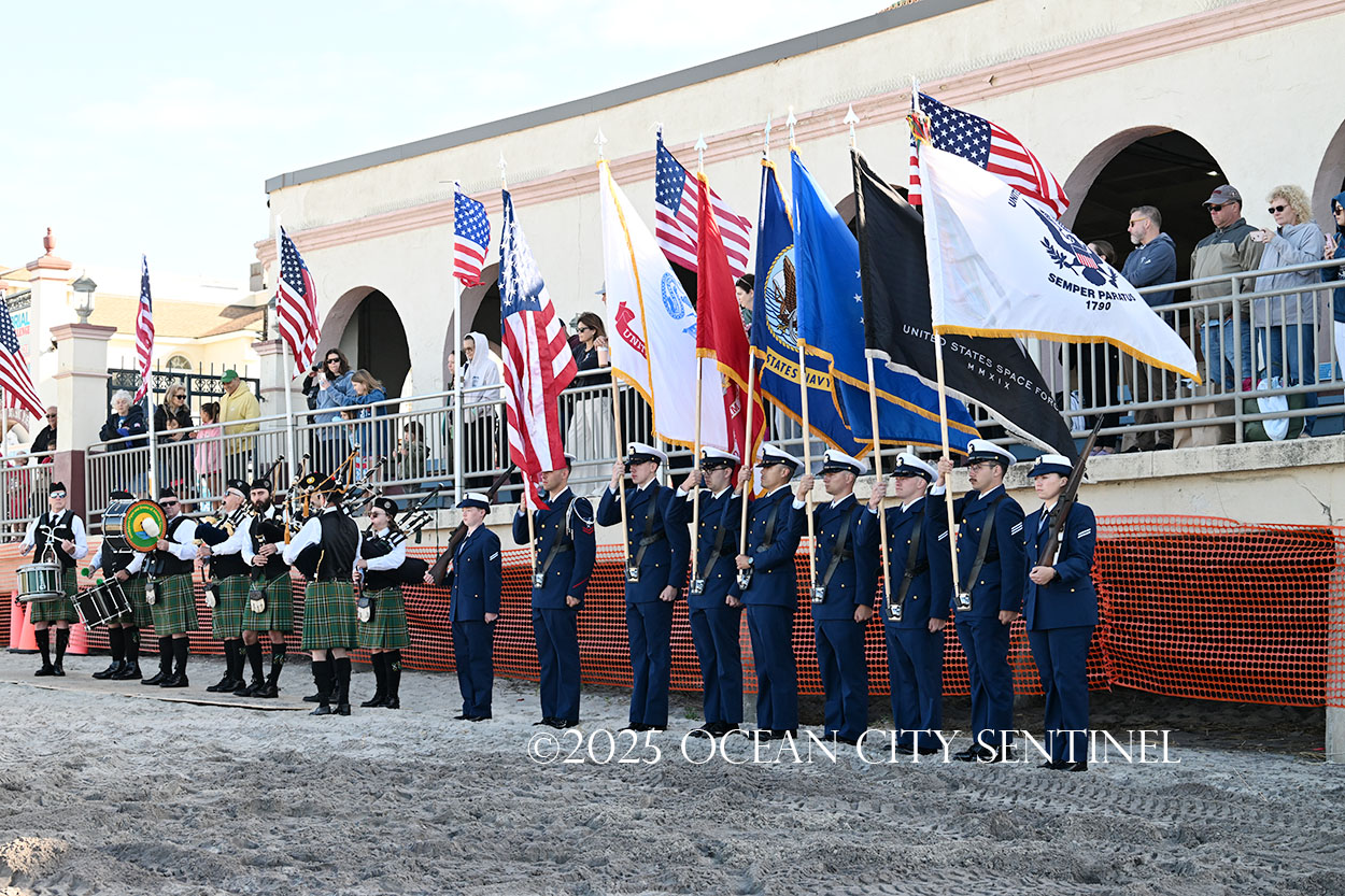 On the beach alongside the Music Pier, a military color guard presented colors and a pipe and drum corps played “God Bless America.”