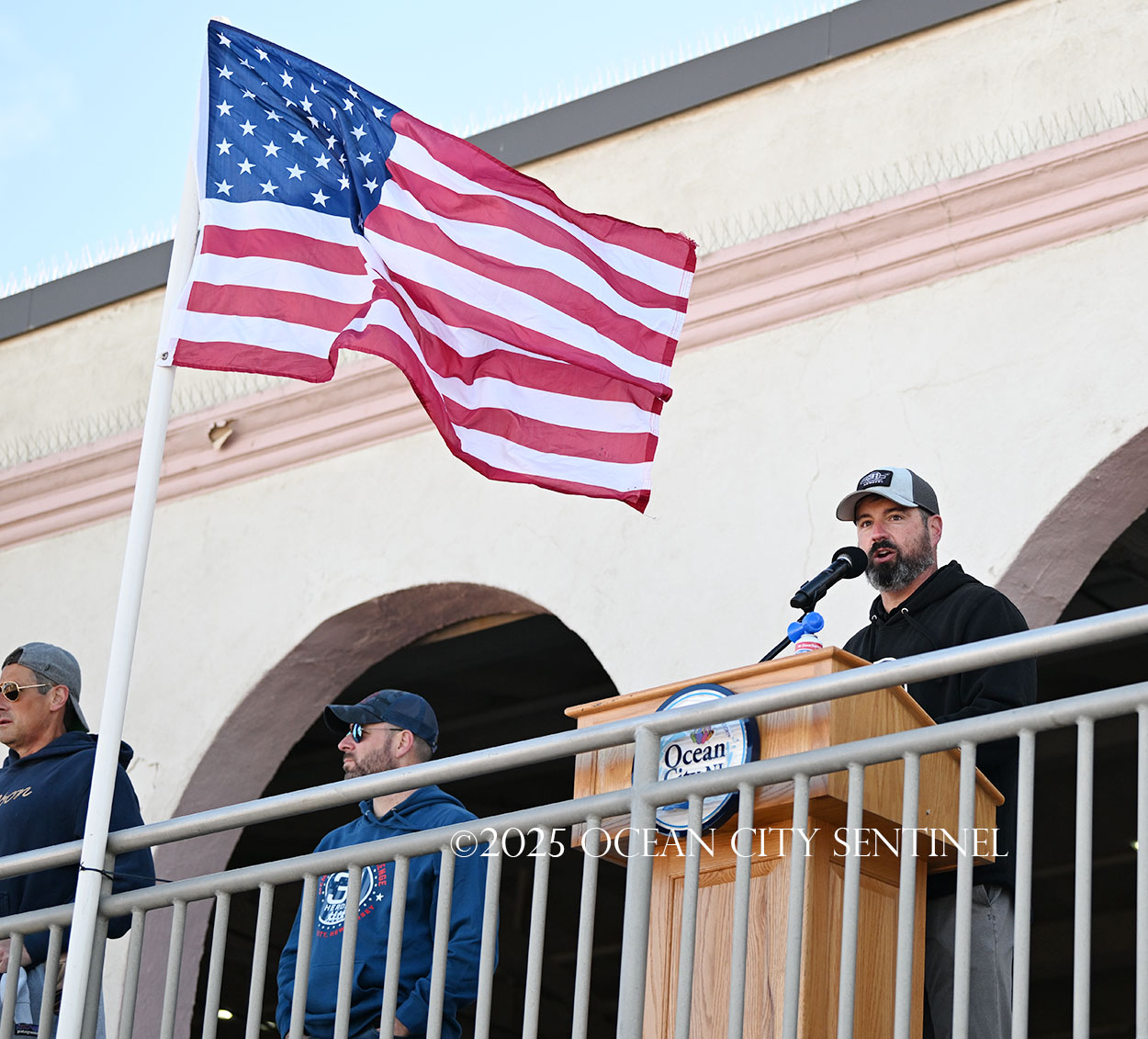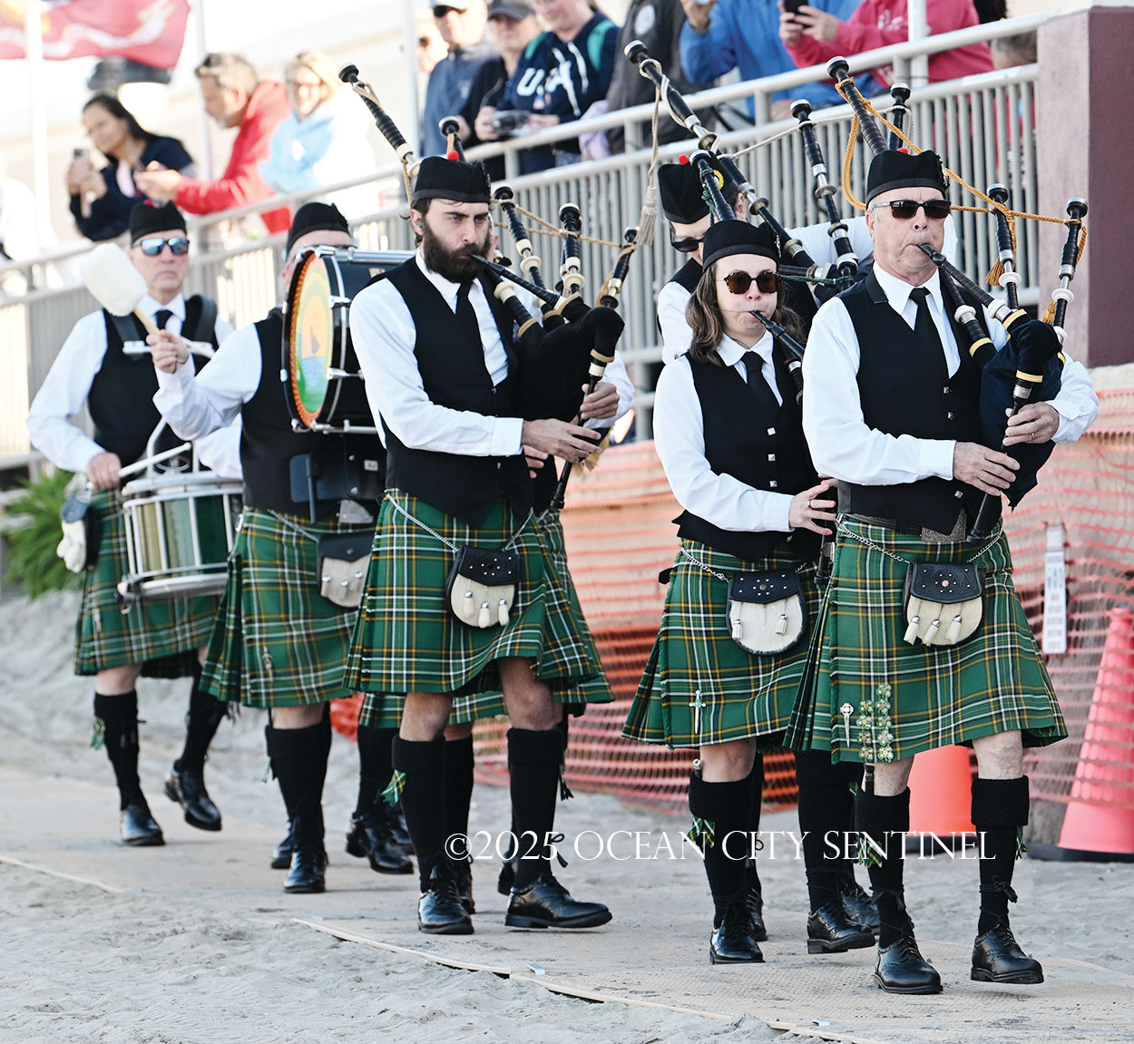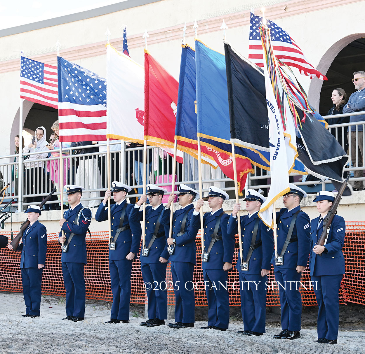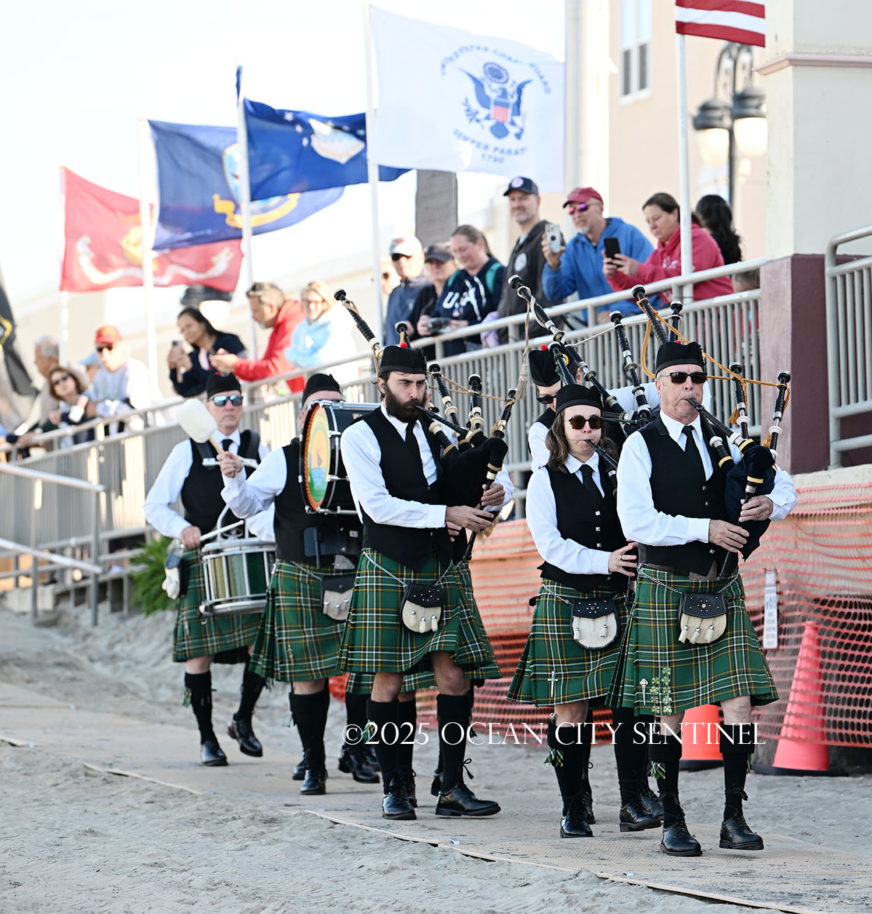 On the beach alongside the Music Pier, a military color guard presented colors and a pipe and drum corps played “God Bless America.”