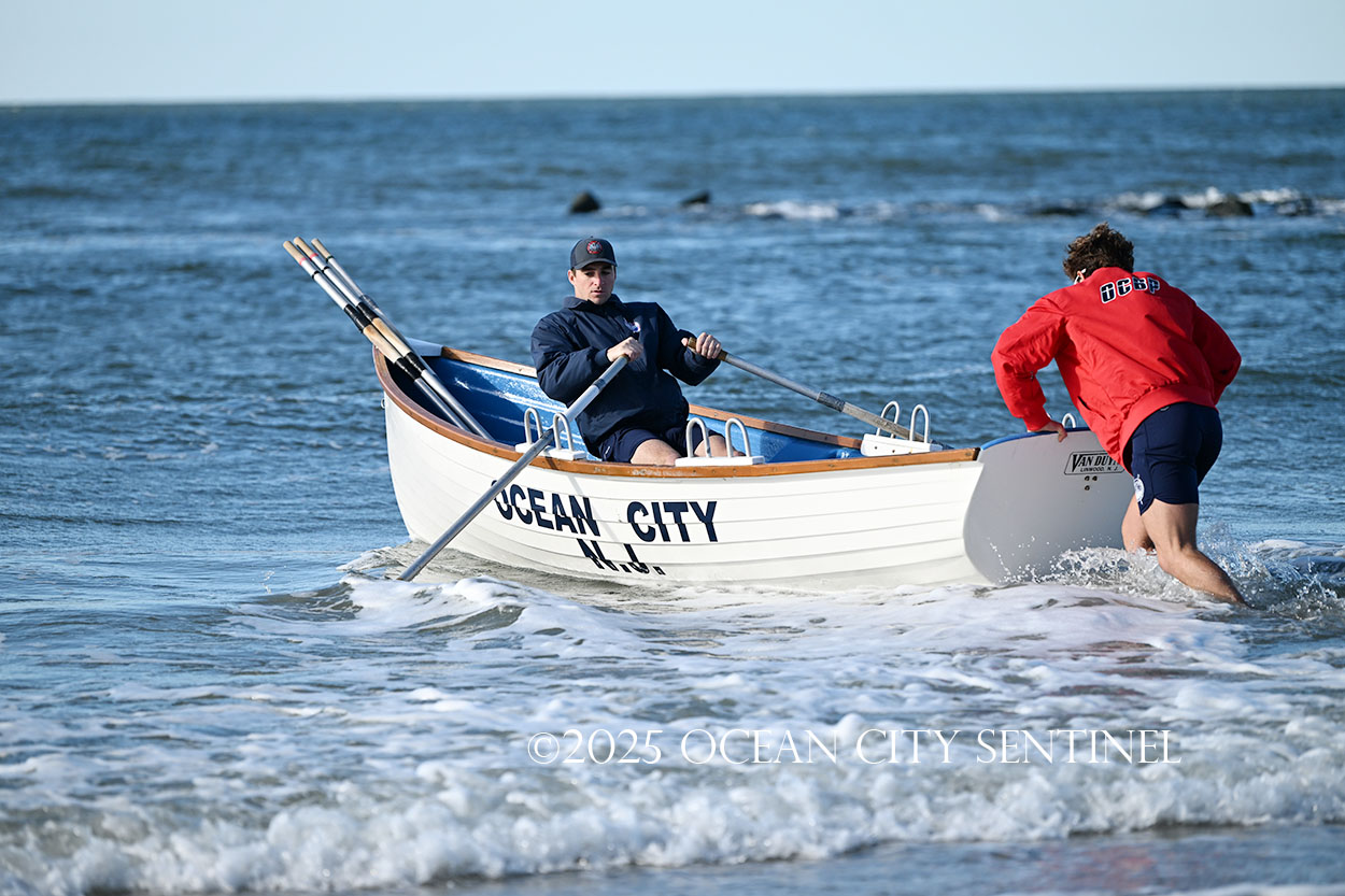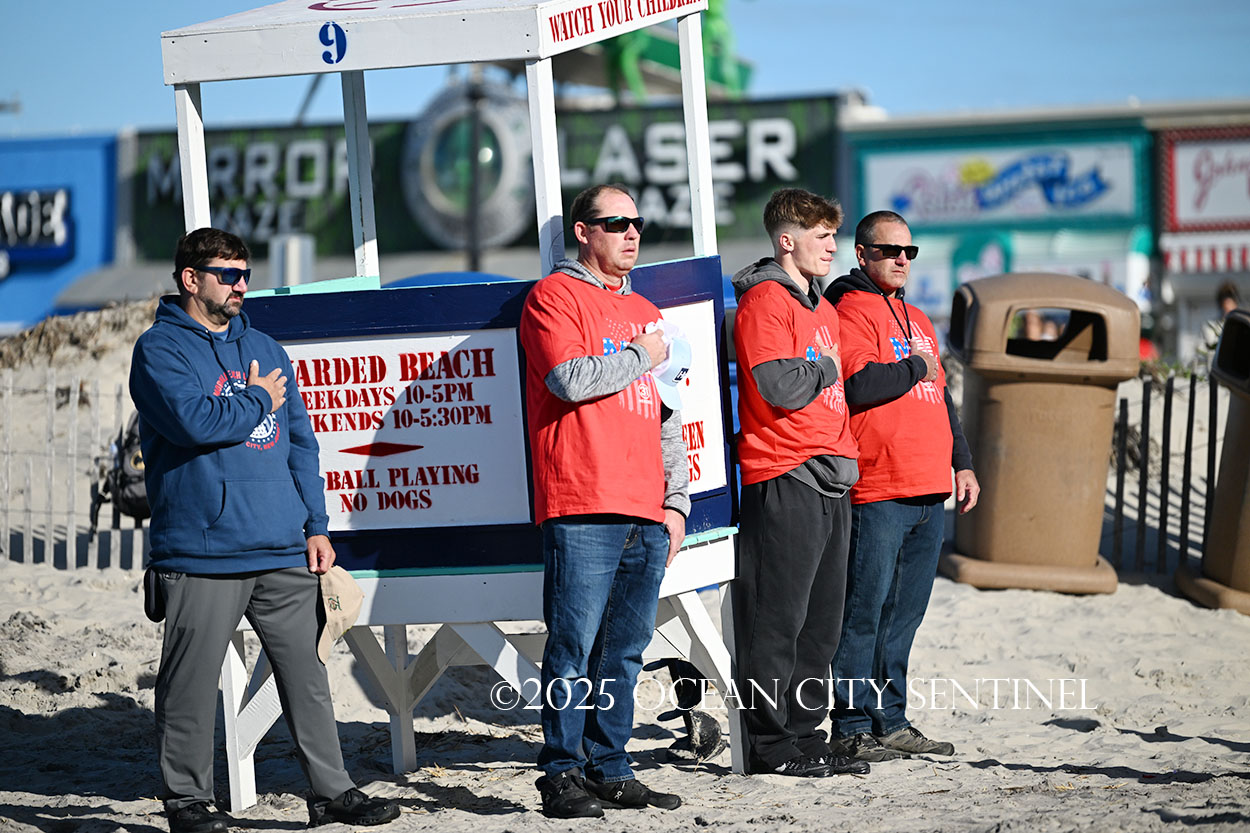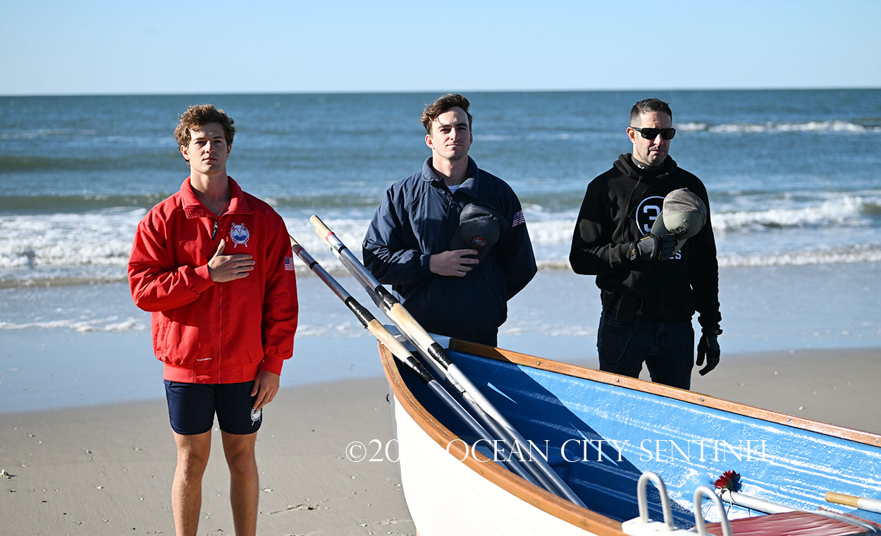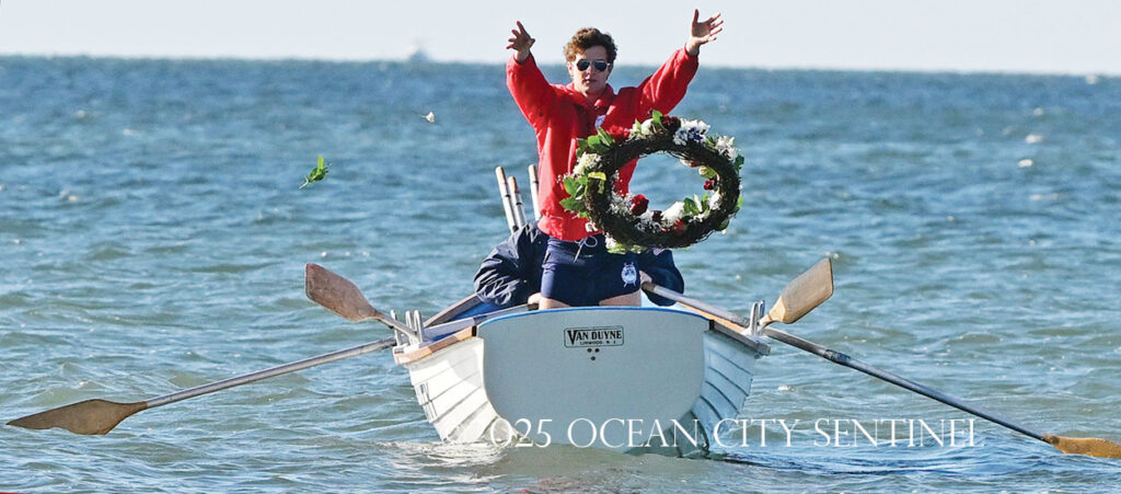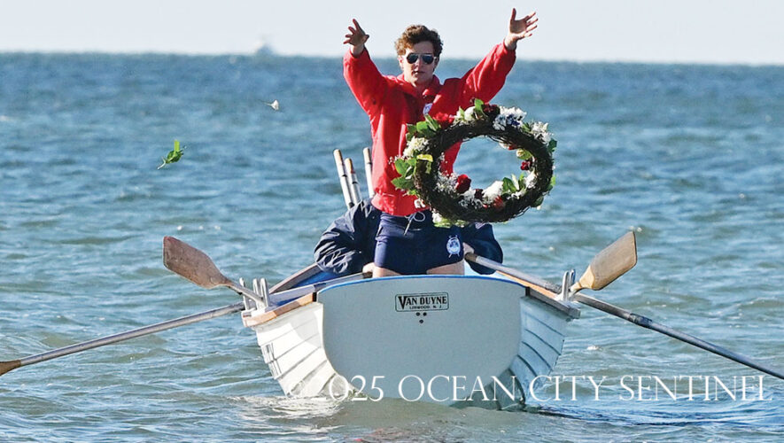 Ocean City Beach Patrol Lt. AJ Oves rowed a lifeboat out to sea, where fellow lifeguard Jay Stokes tossed a wreath into the waves while the competitors awaited the starting gun.