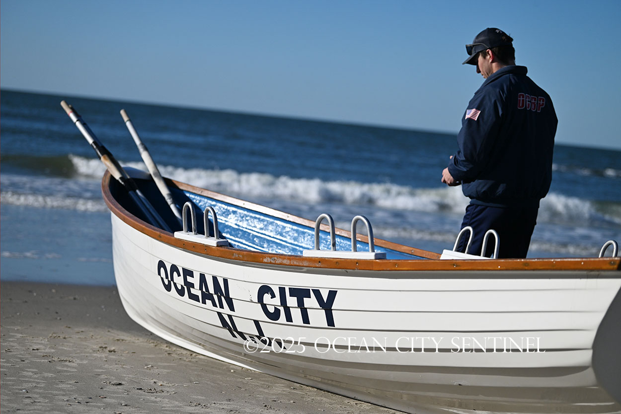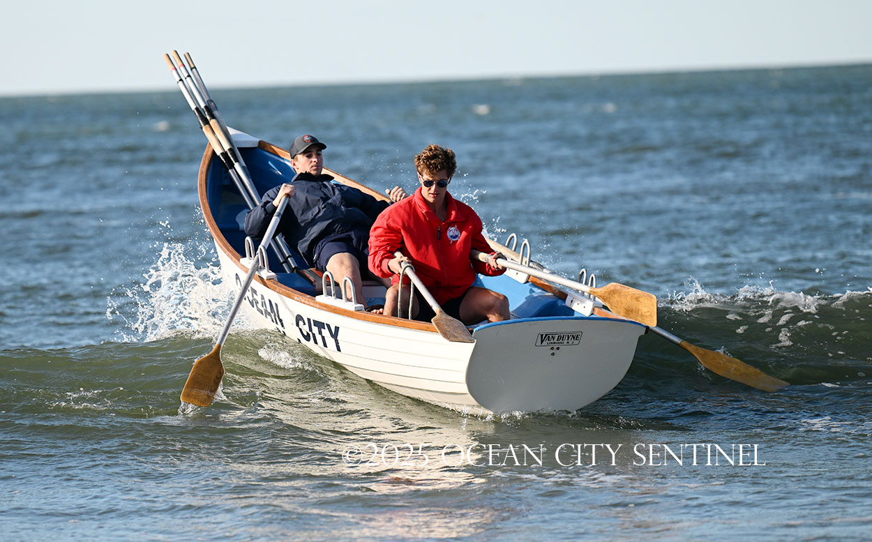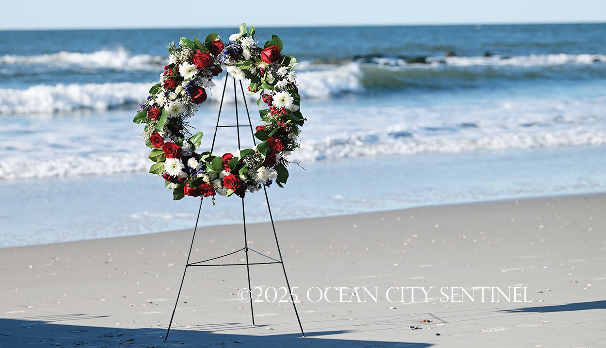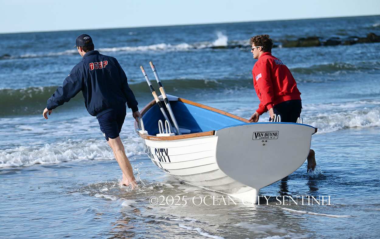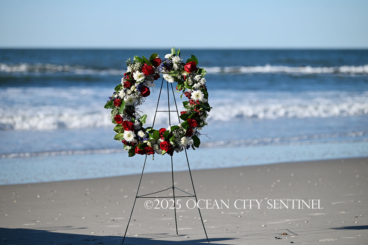 Ocean City Beach Patrol Lt. AJ Oves rowed a lifeboat out to sea, where fellow lifeguard Jay Stokes tossed a wreath into the waves while the competitors awaited the starting gun.