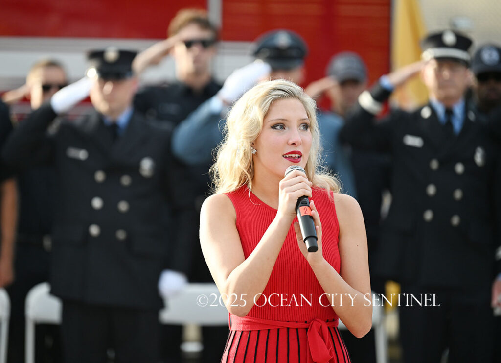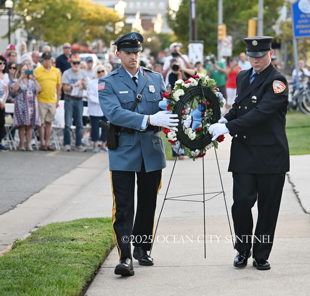 Firefighter Kyle Wagner and Patrolman Ryan Lutz laid the wreath at the 9/11 memorial as bagpiper Thomas H. Moore played “Amazing Grace” on the bagpipes. Jack Hagan and Pat Cummings returned the American flag to full staff and former Miss Ocean City Taylor Mulford, a senior at Ocean City High School, sang the national anthem and “God Bless America.”