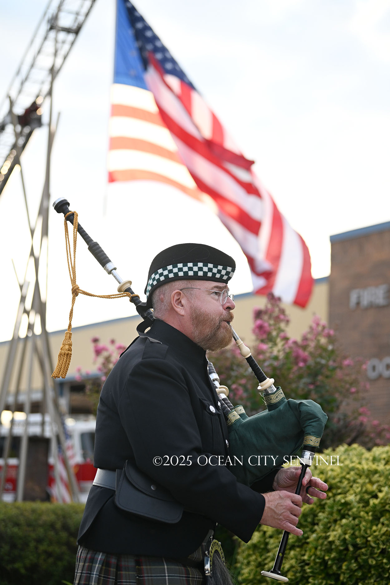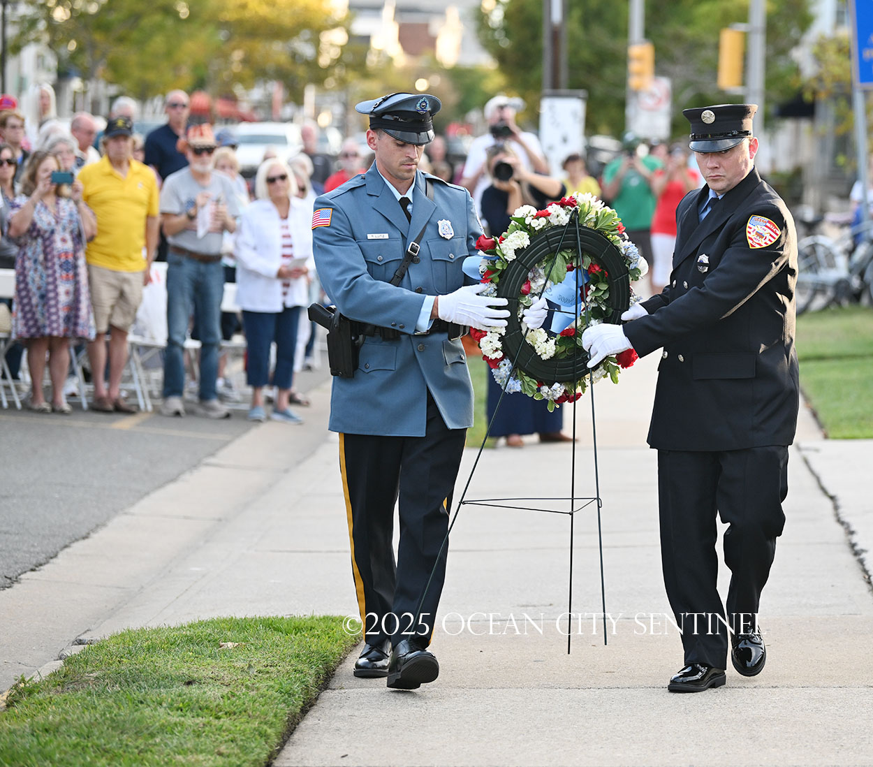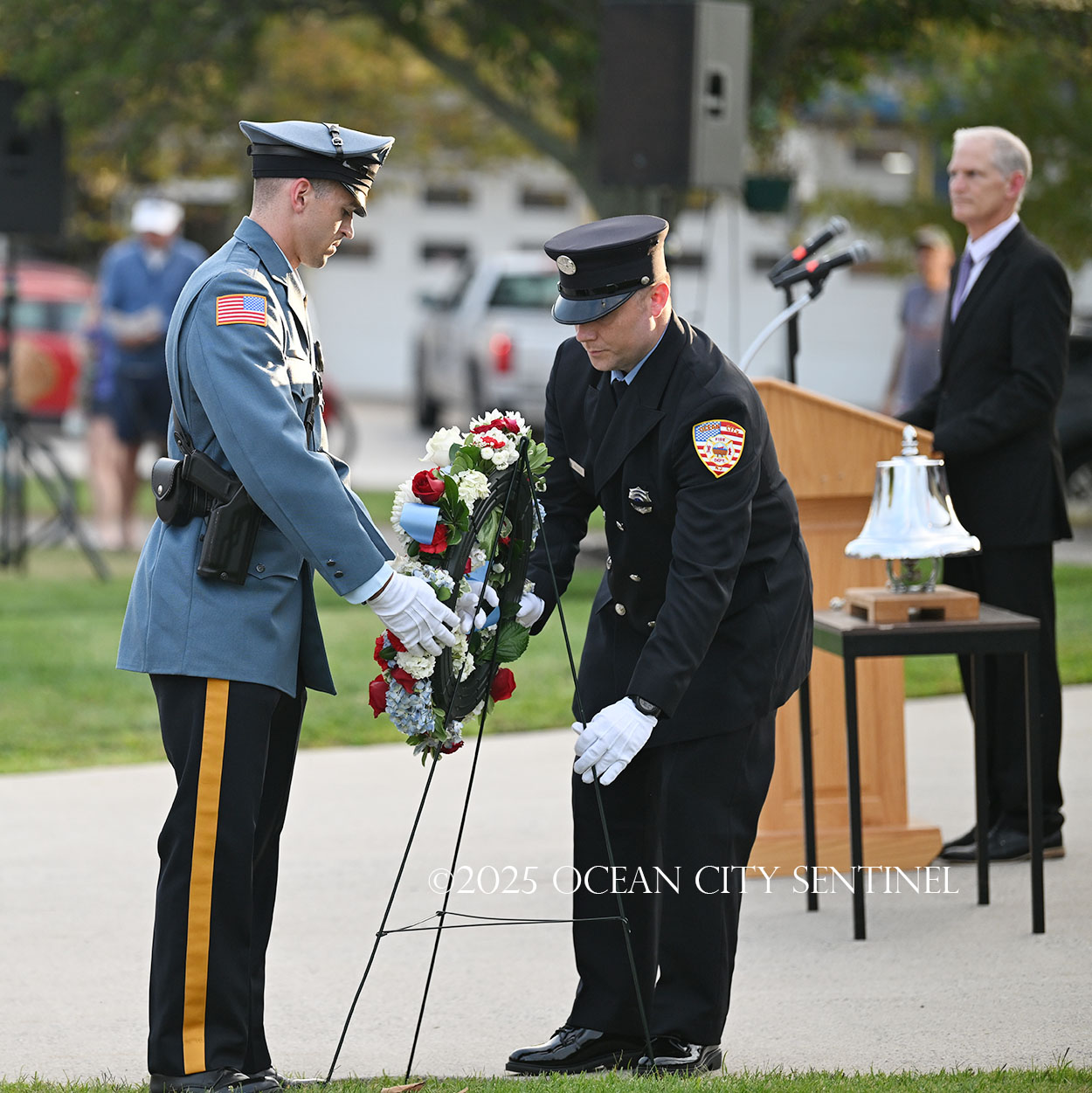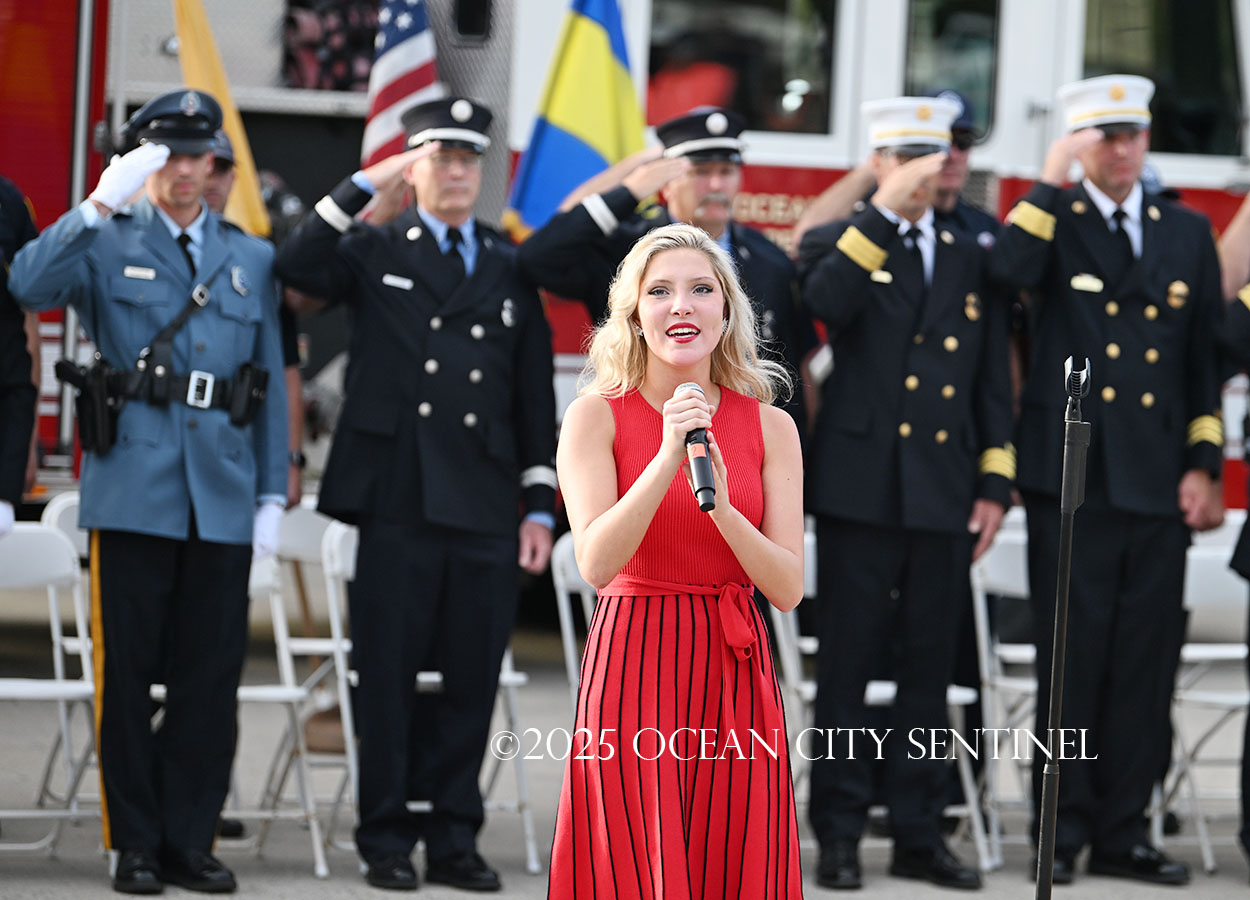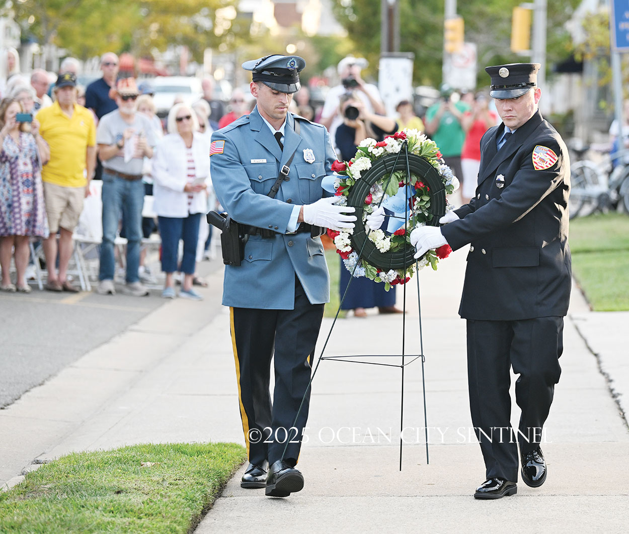 Firefighter Kyle Wagner and Patrolman Ryan Lutz laid the wreath at the 9/11 memorial as bagpiper Thomas H. Moore played “Amazing Grace” on the bagpipes. Jack Hagan and Pat Cummings returned the American flag to full staff and former Miss Ocean City Taylor Mulford, a senior at Ocean City High School, sang the national anthem and “God Bless America.”