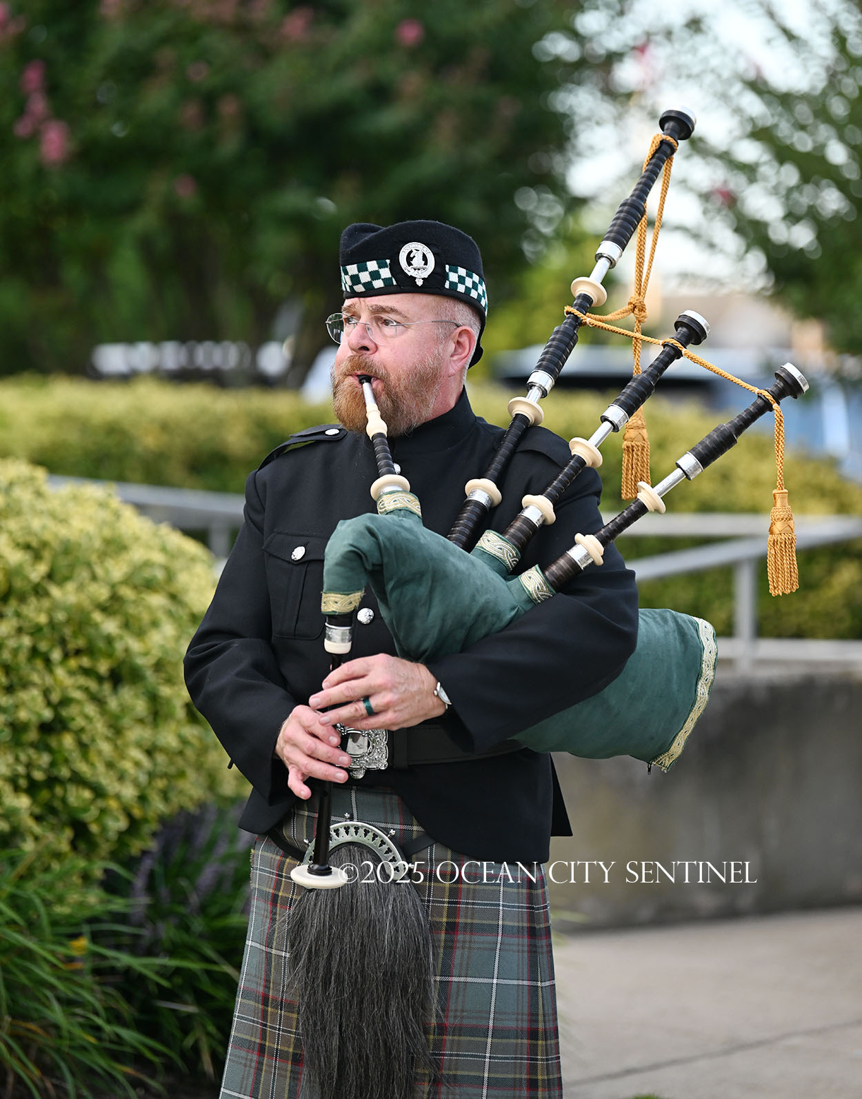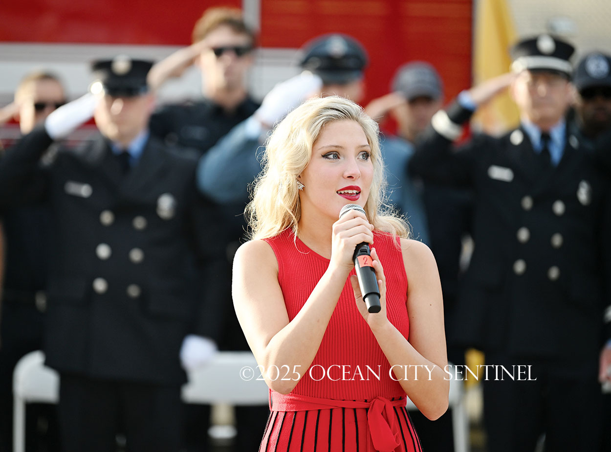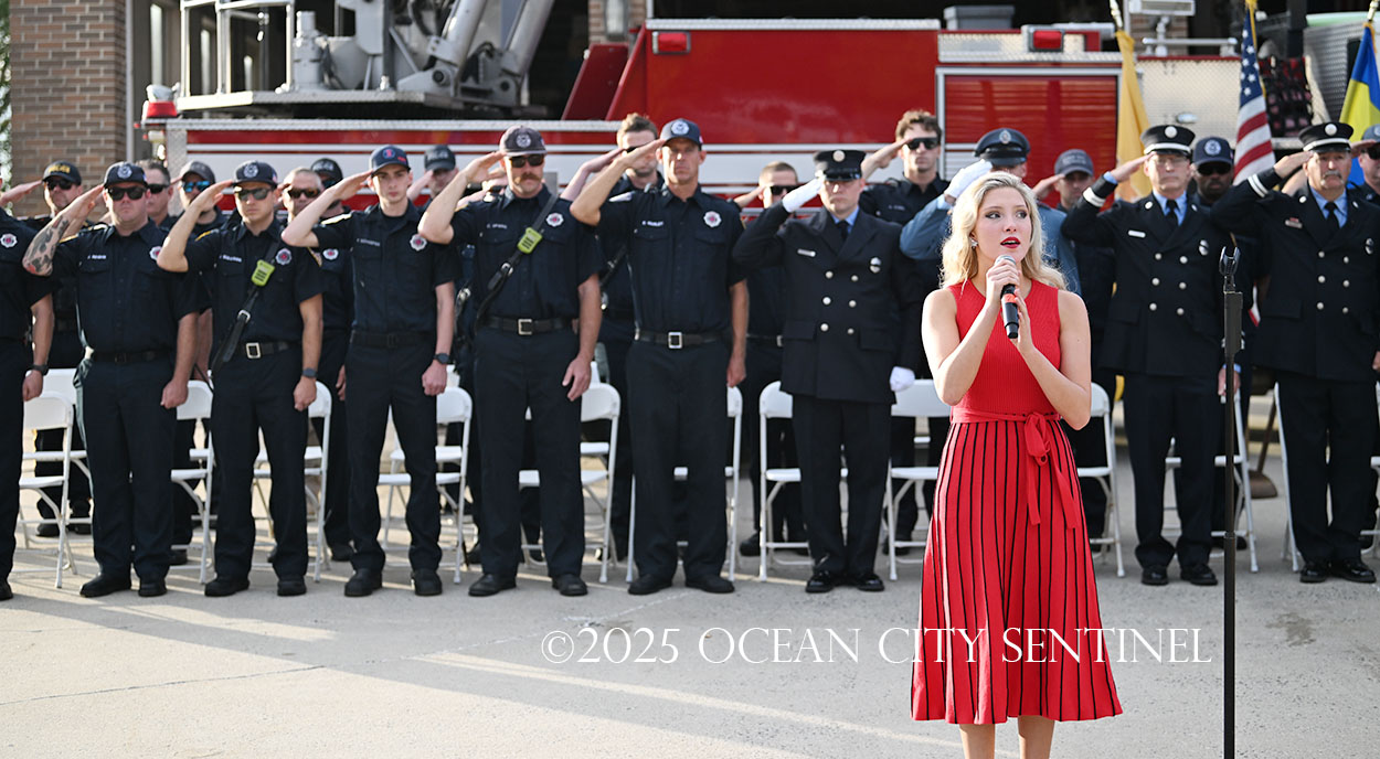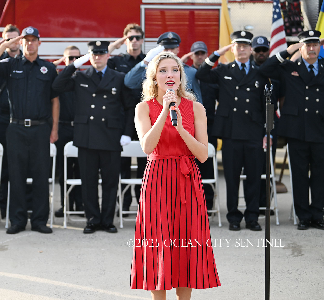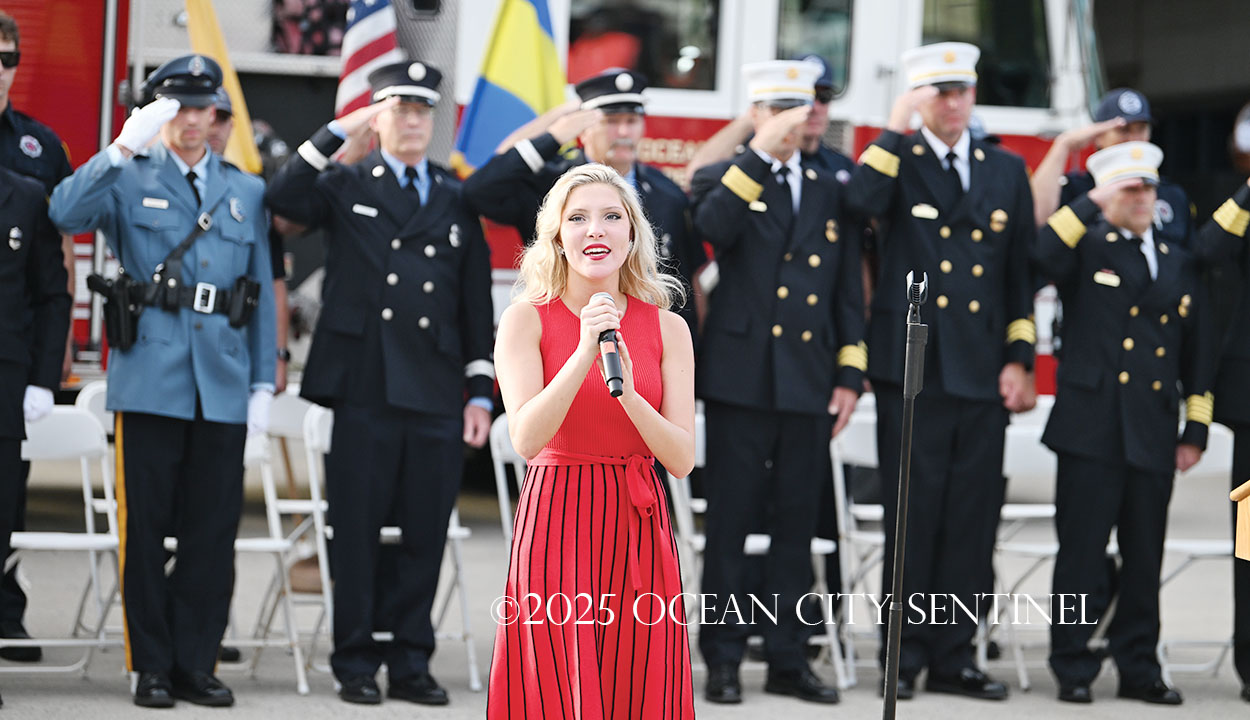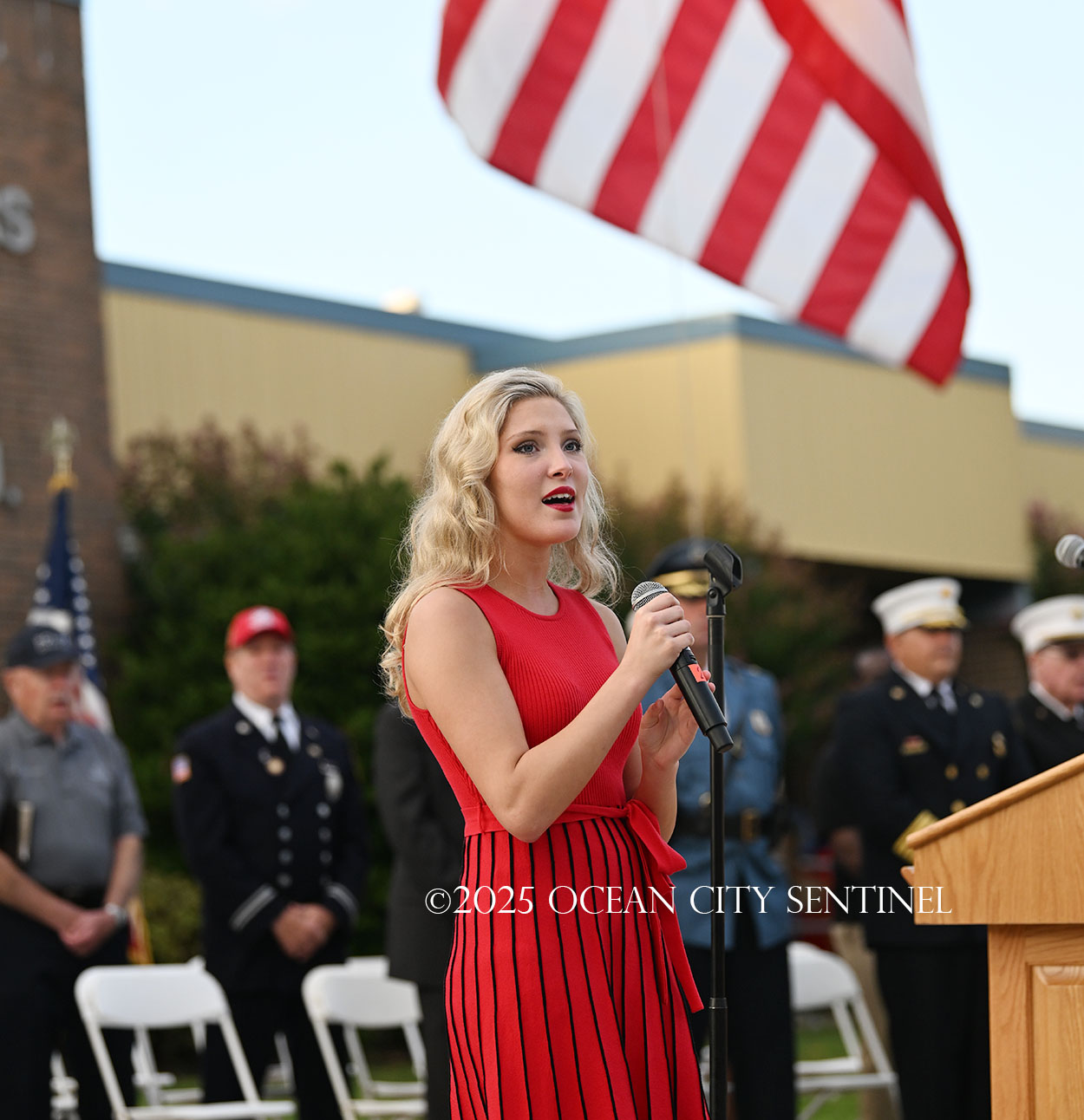 Firefighter Kyle Wagner and Patrolman Ryan Lutz laid the wreath at the 9/11 memorial as bagpiper Thomas H. Moore played “Amazing Grace” on the bagpipes. Jack Hagan and Pat Cummings returned the American flag to full staff and former Miss Ocean City Taylor Mulford, a senior at Ocean City High School, sang the national anthem and “God Bless America.”