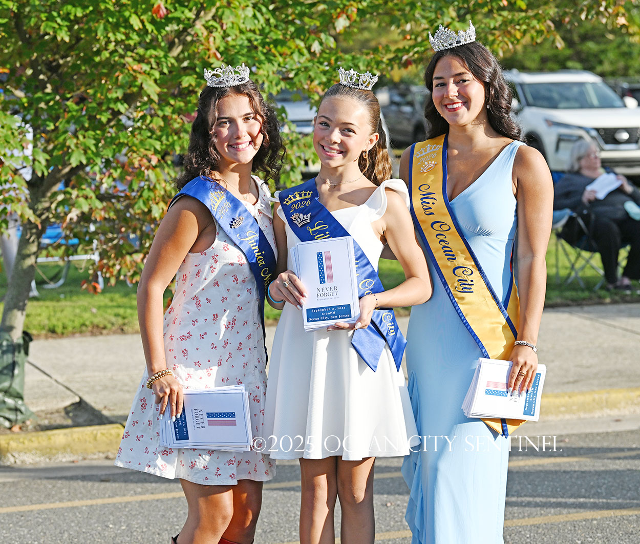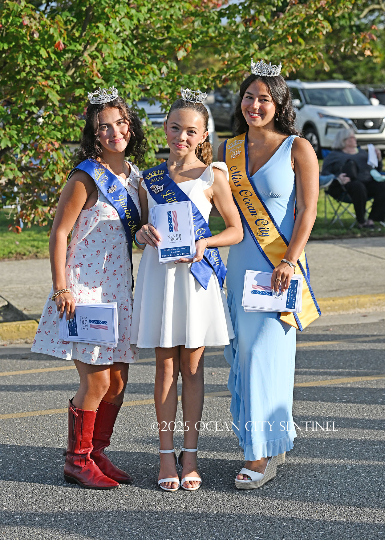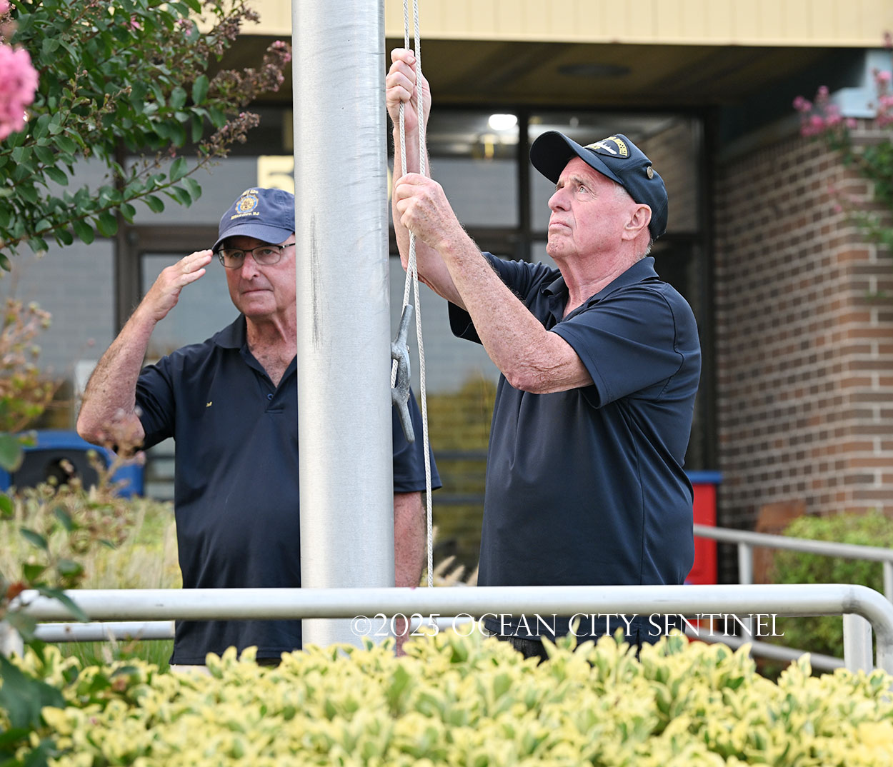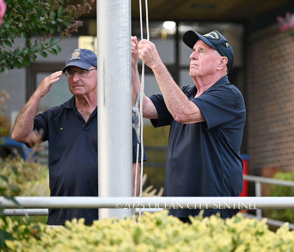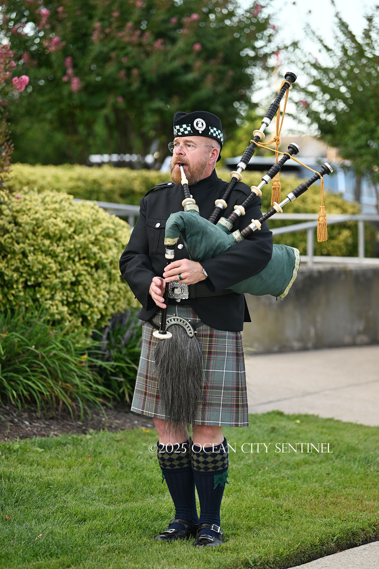 Firefighter Kyle Wagner and Patrolman Ryan Lutz laid the wreath at the 9/11 memorial as bagpiper Thomas H. Moore played “Amazing Grace” on the bagpipes. Jack Hagan and Pat Cummings returned the American flag to full staff and former Miss Ocean City Taylor Mulford, a senior at Ocean City High School, sang the national anthem and “God Bless America.”