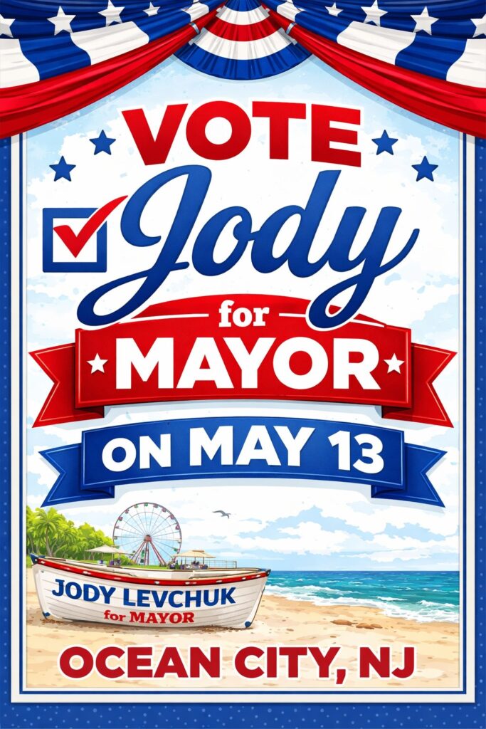 Levchuk’s post was star-spangled, red white and blue with bunting, a lifeguard and Ferris wheel by the beach with the saying, “VOTE Jody for MAYOR on MAY 13.”