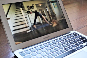 Michelle Whelan’s dog visits while she leads a remote yoga class from her home in Ocean City. Instructors have had to find new ways to reach their students. Whelan said it’s important for people to stay active, but the social aspects of classes can be vital as well.