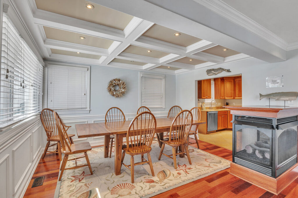 On the left, a long wood table that seats at least eight awaits diners just inside another triple window and beneath the fantastic coffered ceiling. Two more windows on the south side bathe the area in light. Shadow box wainscoting adds another element of style to this space.