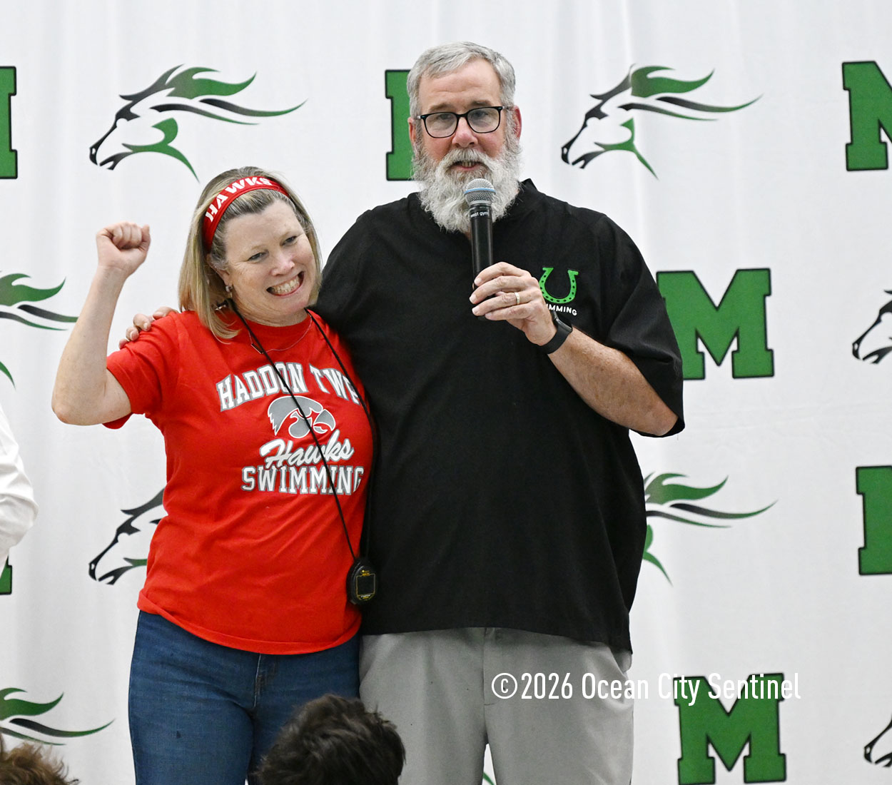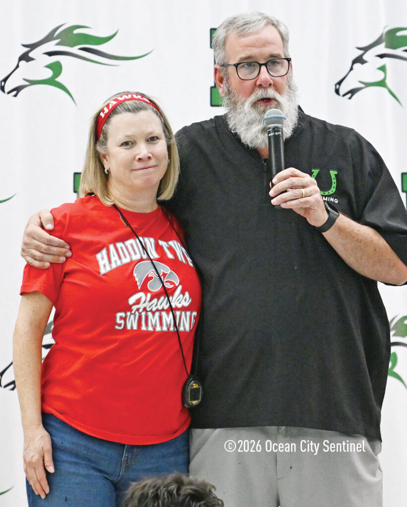 Mainland Regional Athletic Director Billy Kern, right, presents a special memento to boys swim coach Brian Booth Jan. 30. At top, Booth with Haddon Township swim coach Maura McDermott, who also is retiring after the season.